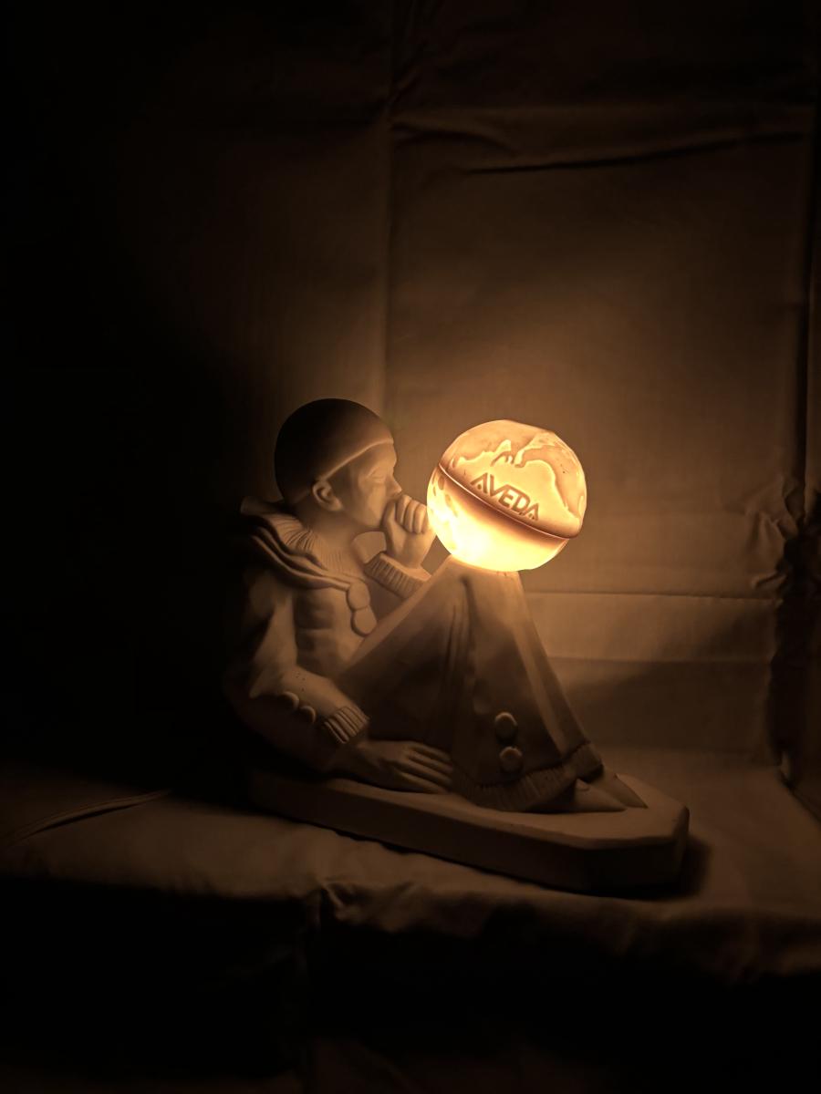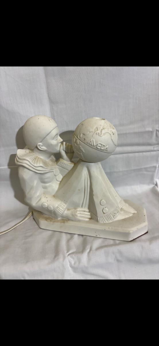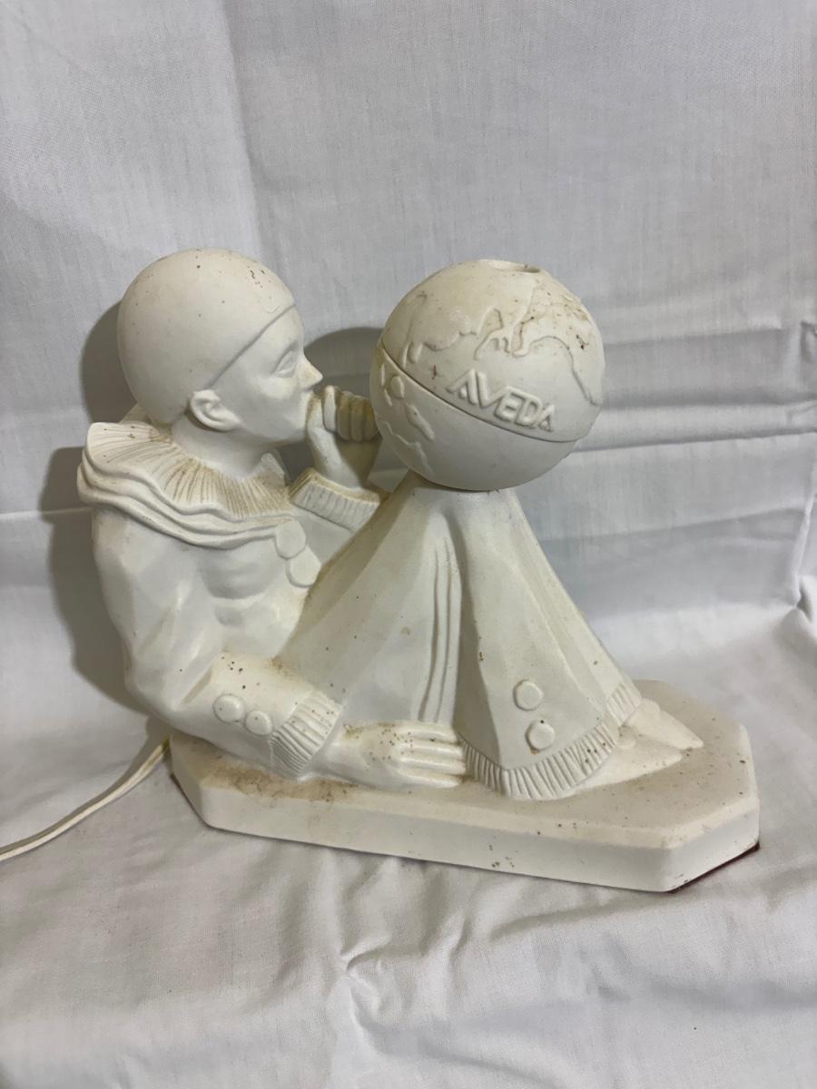 Features an Art Deco–inspired Pierrot clown figure with a glass globe diffuser. A distinctive AVEDA salon display piece from the brand’s 1990s design era.