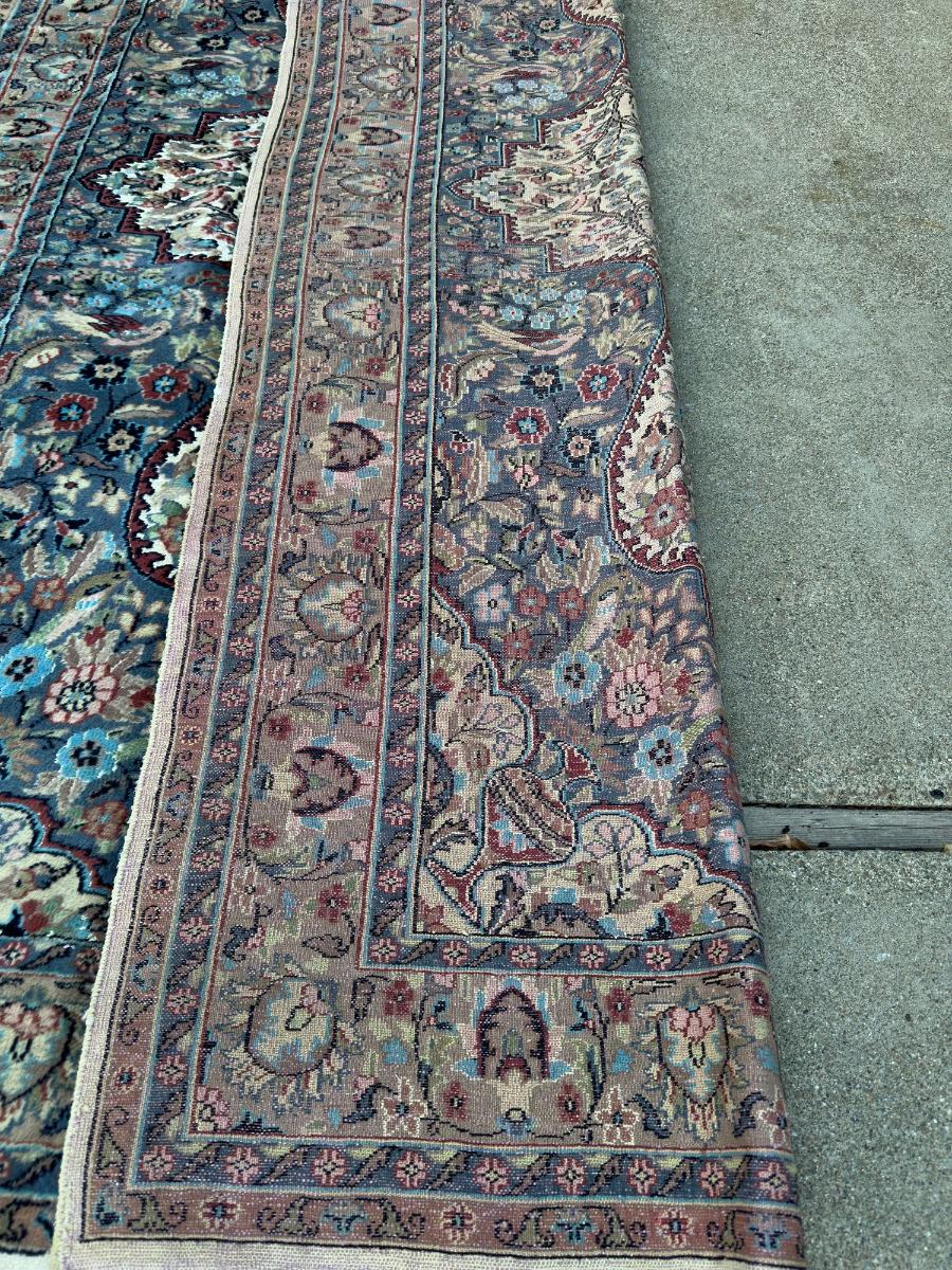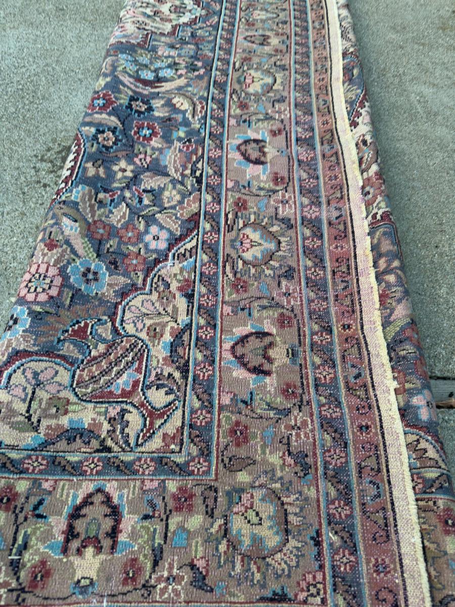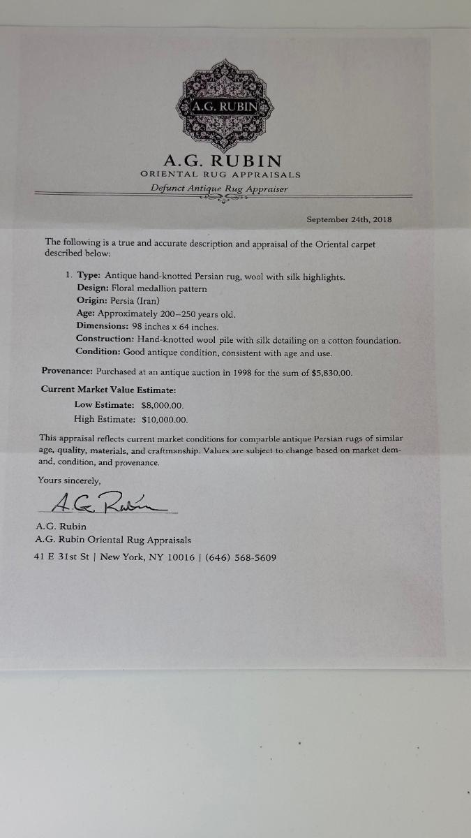 1. Antique Hand-Knotted Persian Rug Floral Medallion Design Wool with Possible Silk- This piece has been professionally cleaned in July of 2025 by our client. The reason for sale is that the client is downsizing due to a move to senior housing. The client has been an antiques collector for several decades.