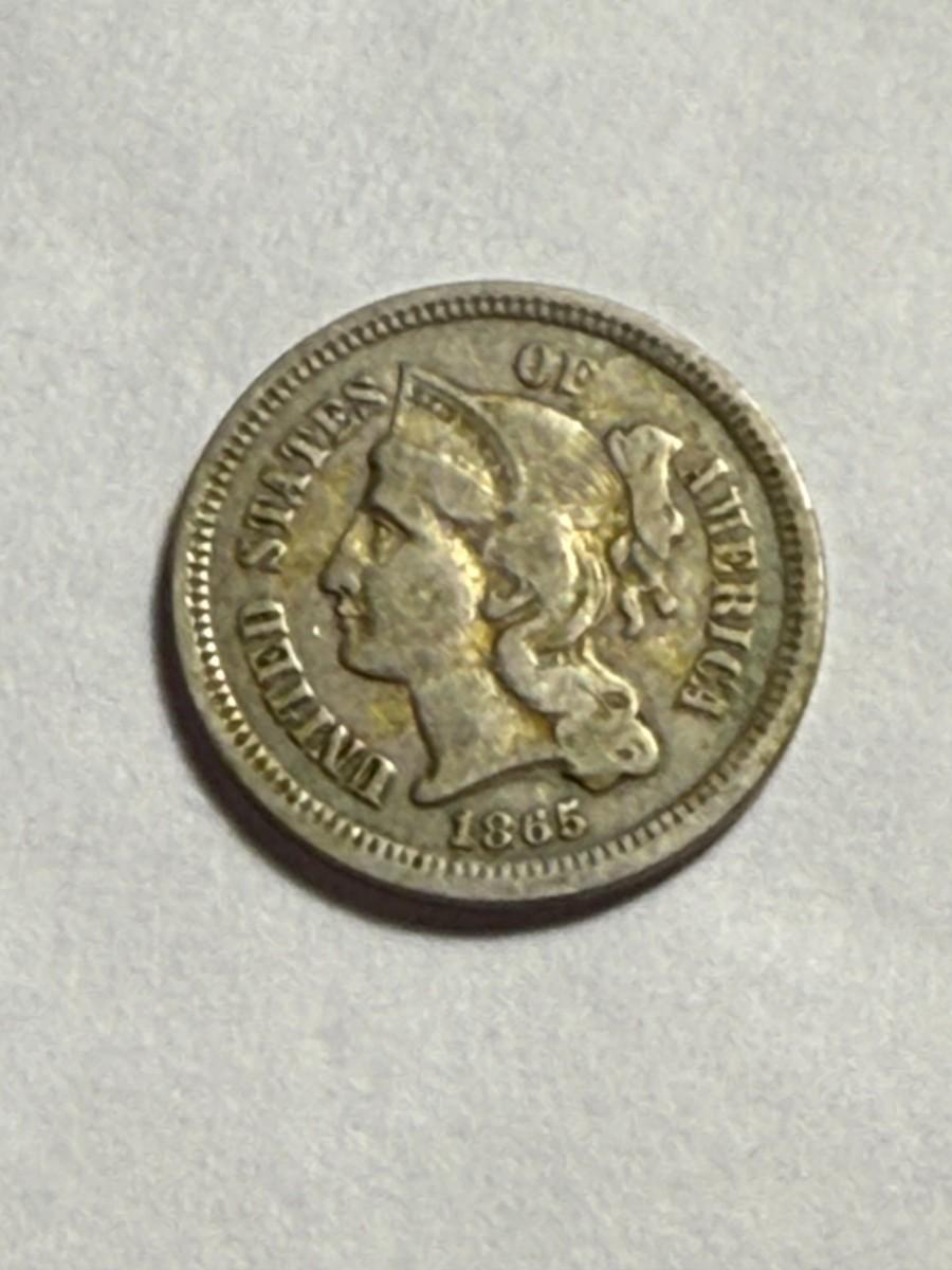 1865 CIRCULATED CONDITION THREE CENT NICKEL TYPE COIN AS PICTURED. $5 DOMESTIC SHIPPING.