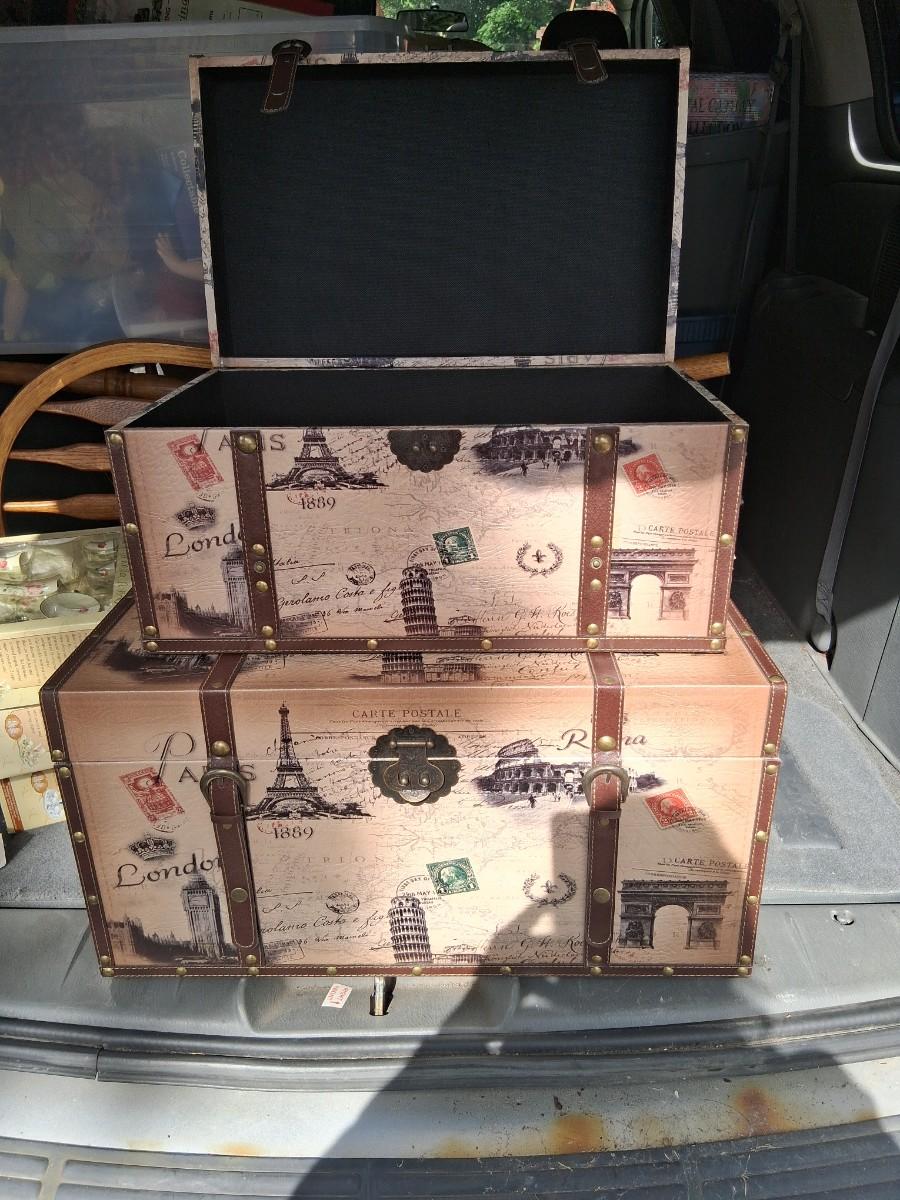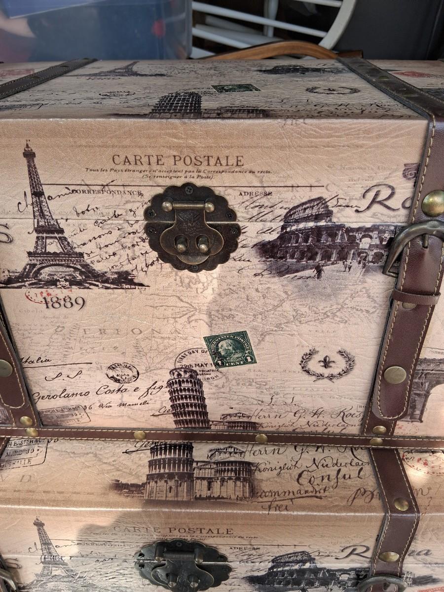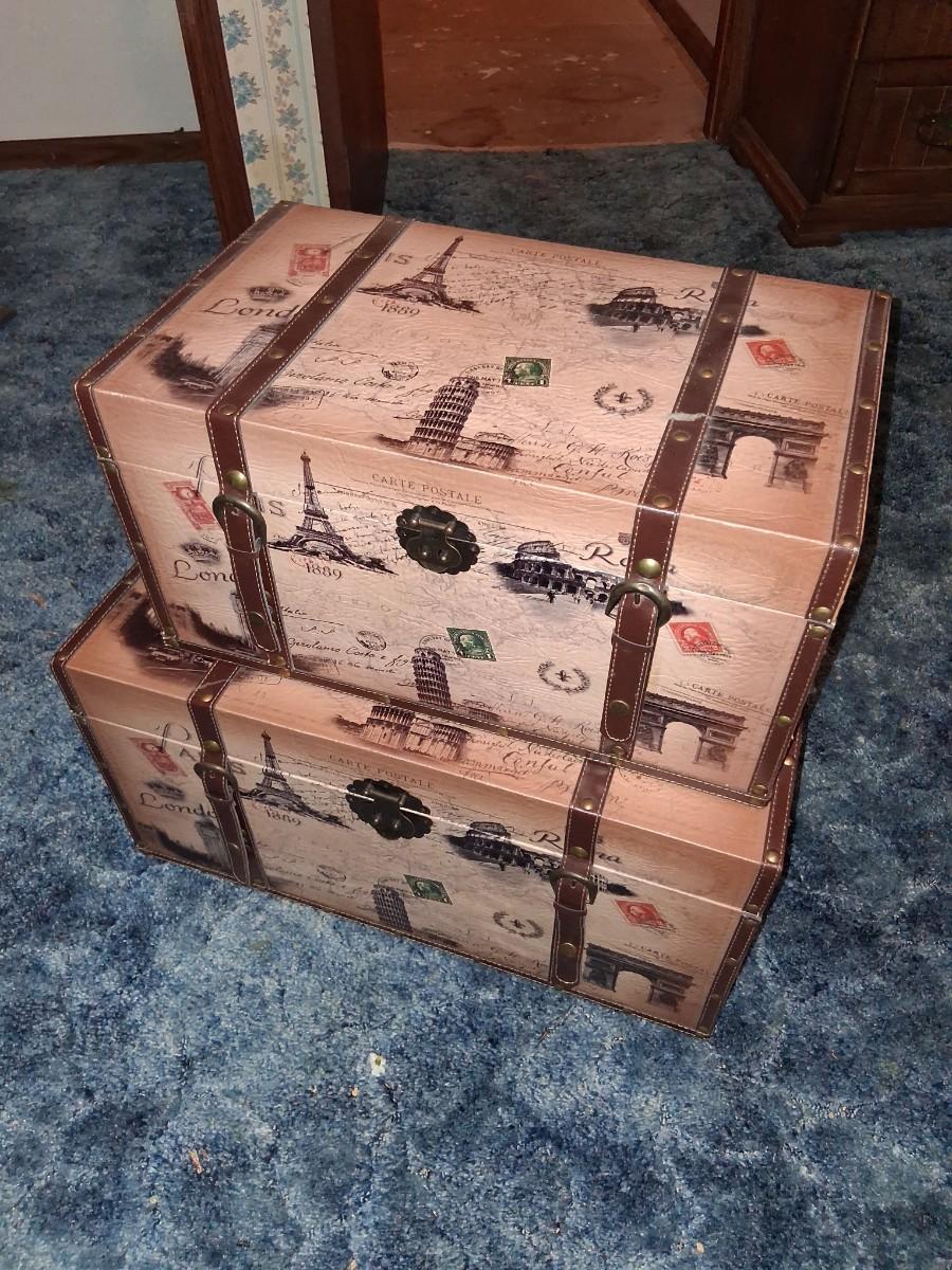 This pair is the Large Trunk & the Medium Trunk. Both with Leather? Strapping & European Postal Designs. Fully lined. Large Trunk still has the tag. $79.99 Medium tag is missing. $59.99 Large Trunk has 2 scratches on top from stacking.