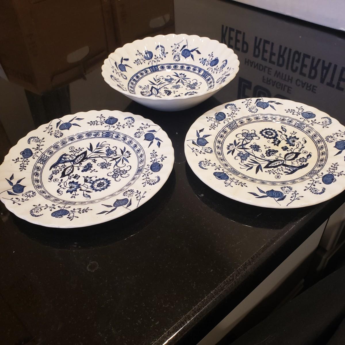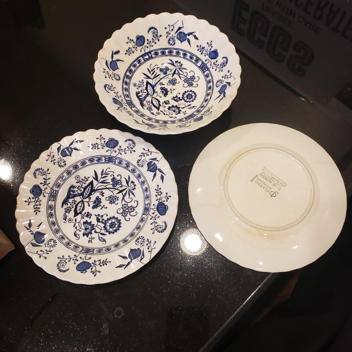 This blue and white patterned dish set is called "Blue Nordic" by J & G Meakin. Some dishes have two different stamps on the bottoms, see pictures. There are a few blemishes, chips as seen in the last two photos, three pieces, a bowl and two small plates.