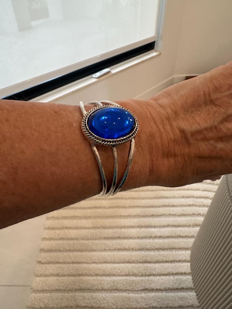 ladies silvertone cuff bracelet with blue stone