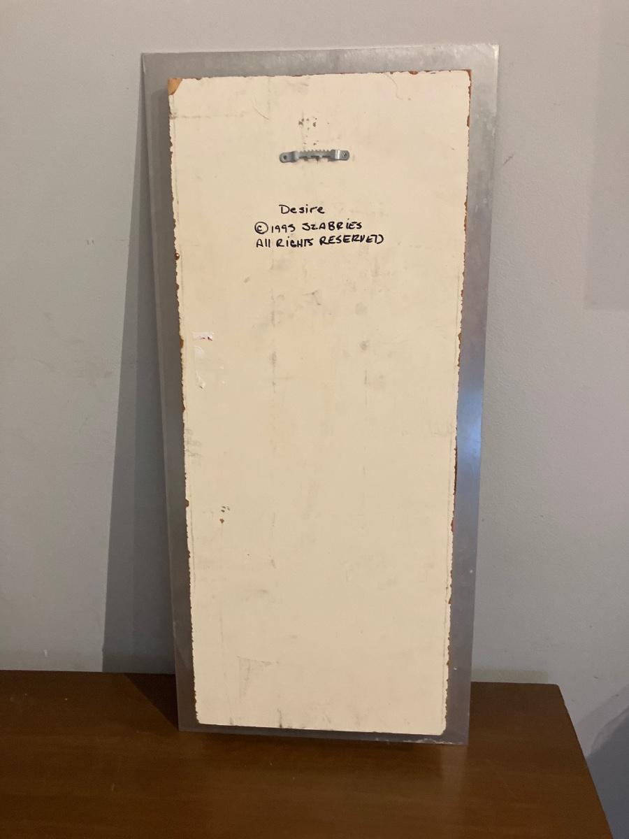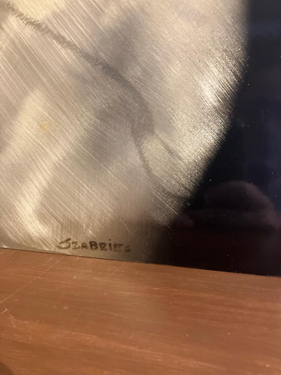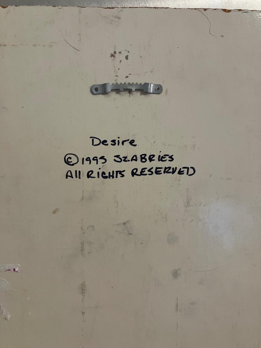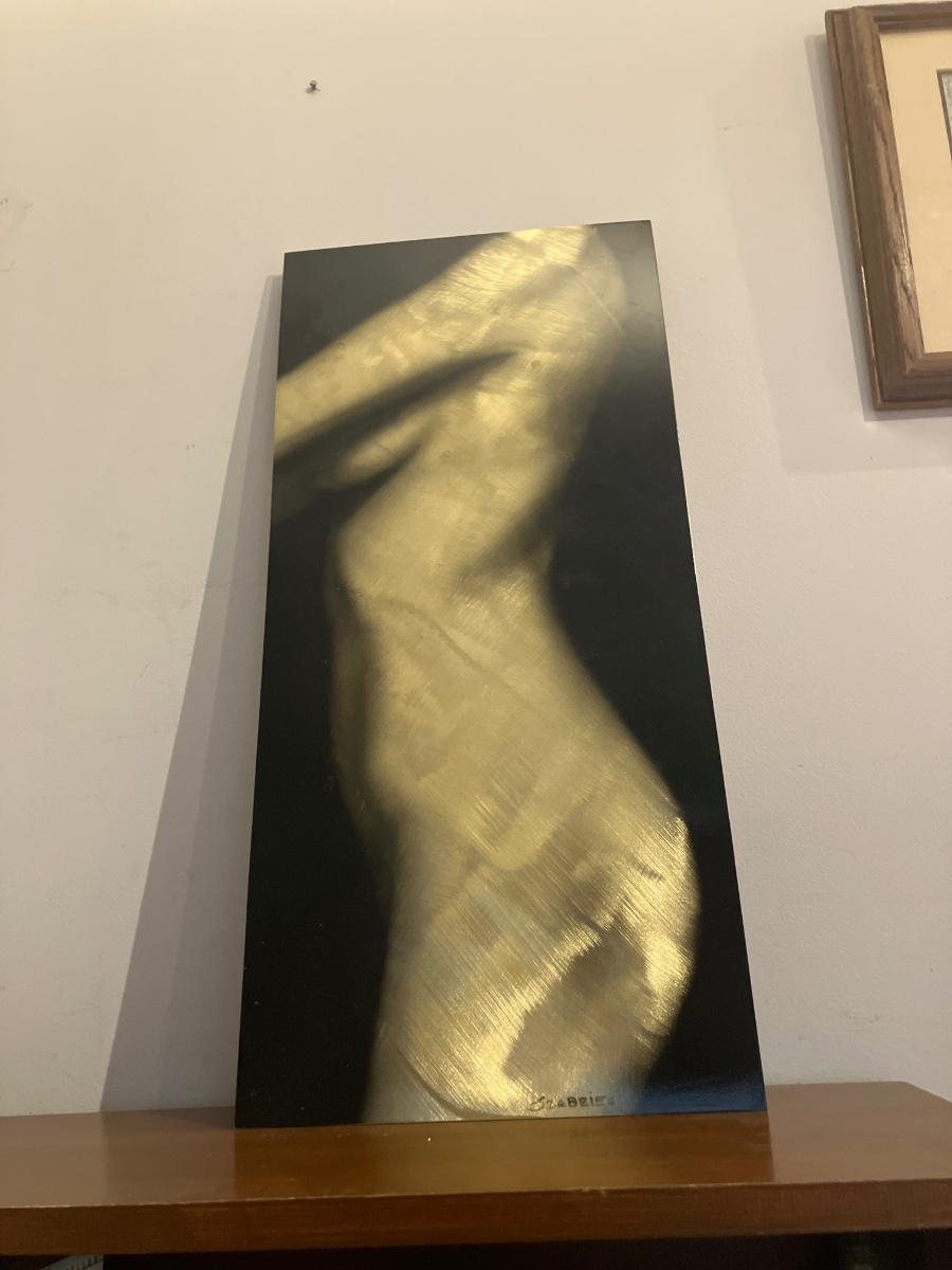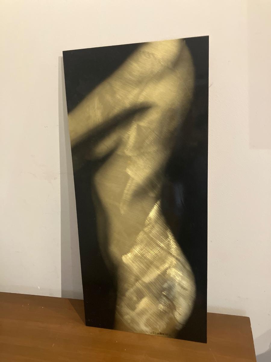 Offered is a striking original artwork by American artist Fred Szabries, featuring a sensual nude figure crafted on brushed aluminum. Measuring 12 inches wide by 26 inches high, this vertical panel showcases Szabries' signature technique of etching and layering metallic paints to create a luminous, gold-toned finish against a dark backdrop. The piece, signed "Szabries" in the lower right, exemplifies his innovative use of industrial materials, blending abstract fluidity with classical form. Known for commissions with the U.S. Air Force and appearances in private collections (including comedian Dennis Miller), Szabries' works are prized for their textured depth and modern elegance. Ideal for collectors or contemporary decor, this piece comes from a limited series, with no visible damage.