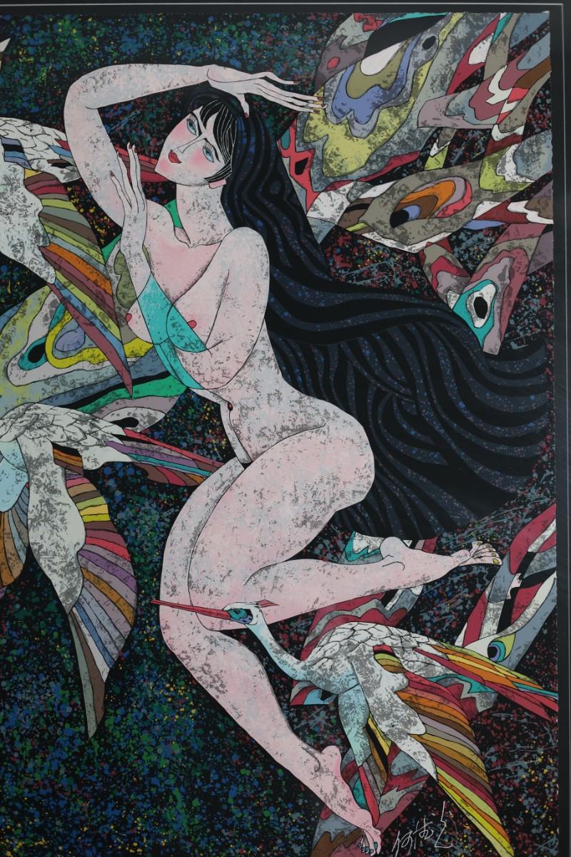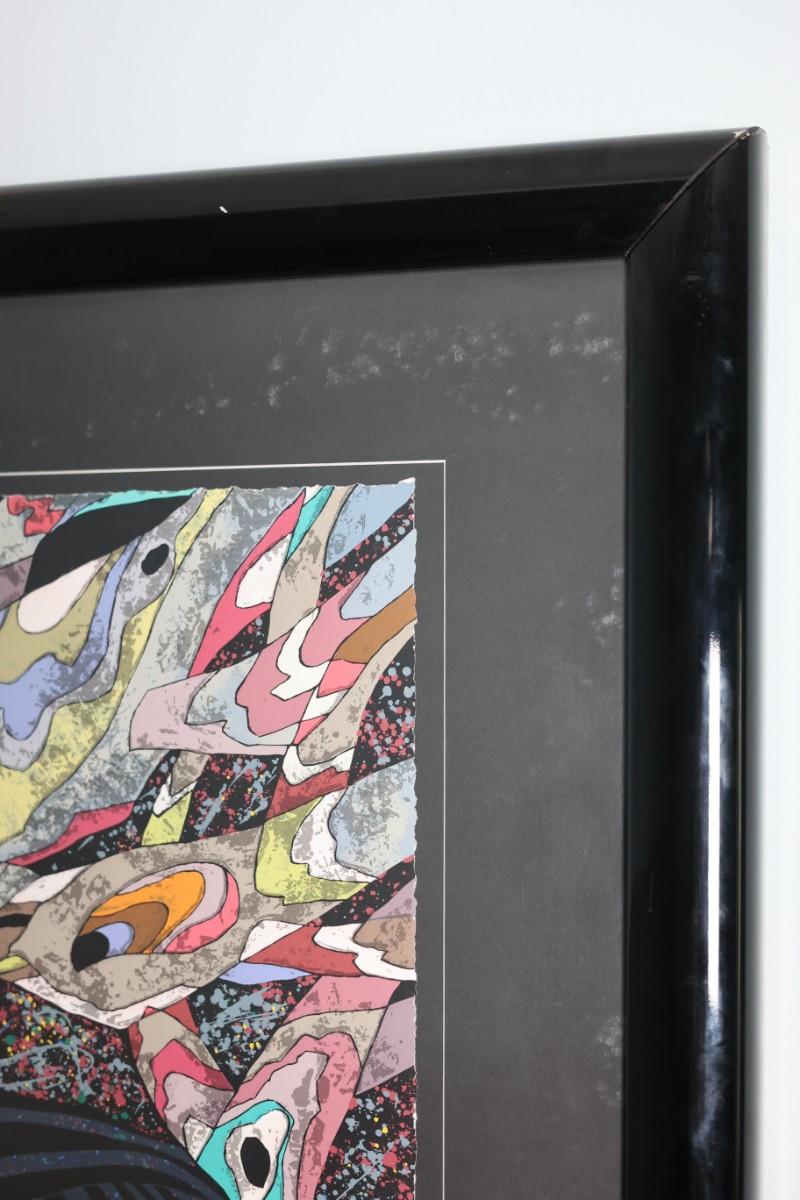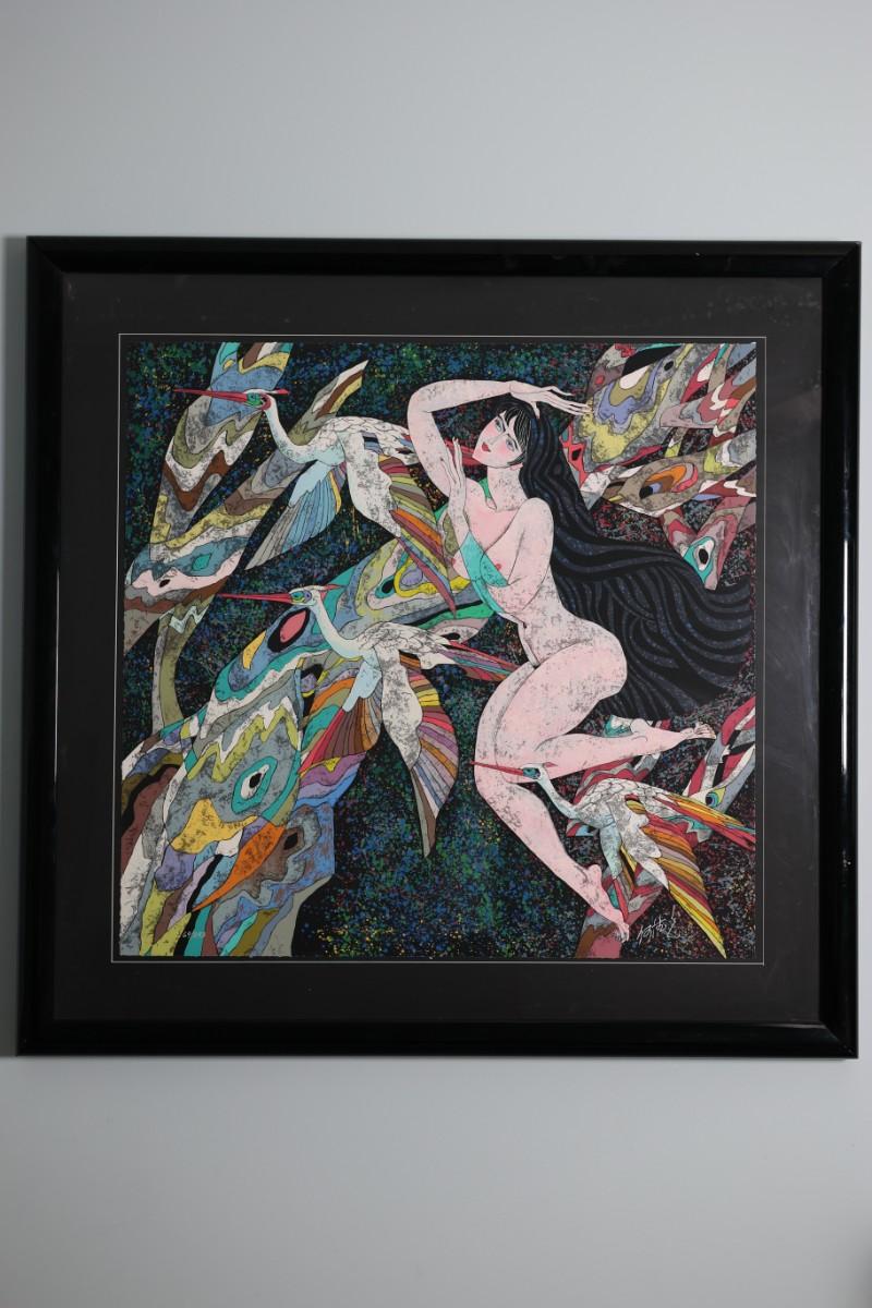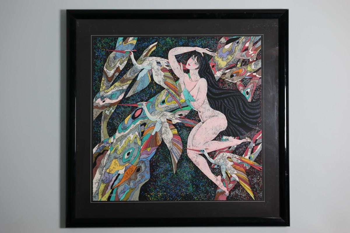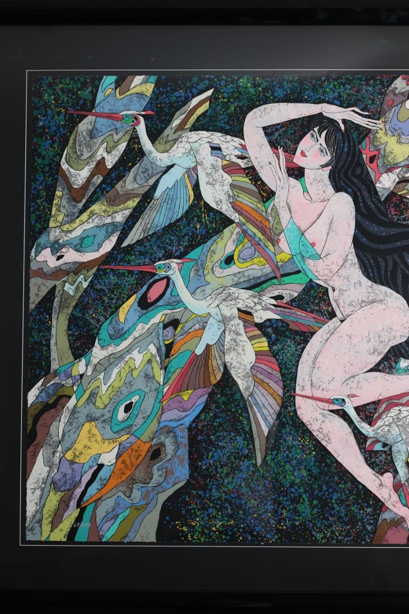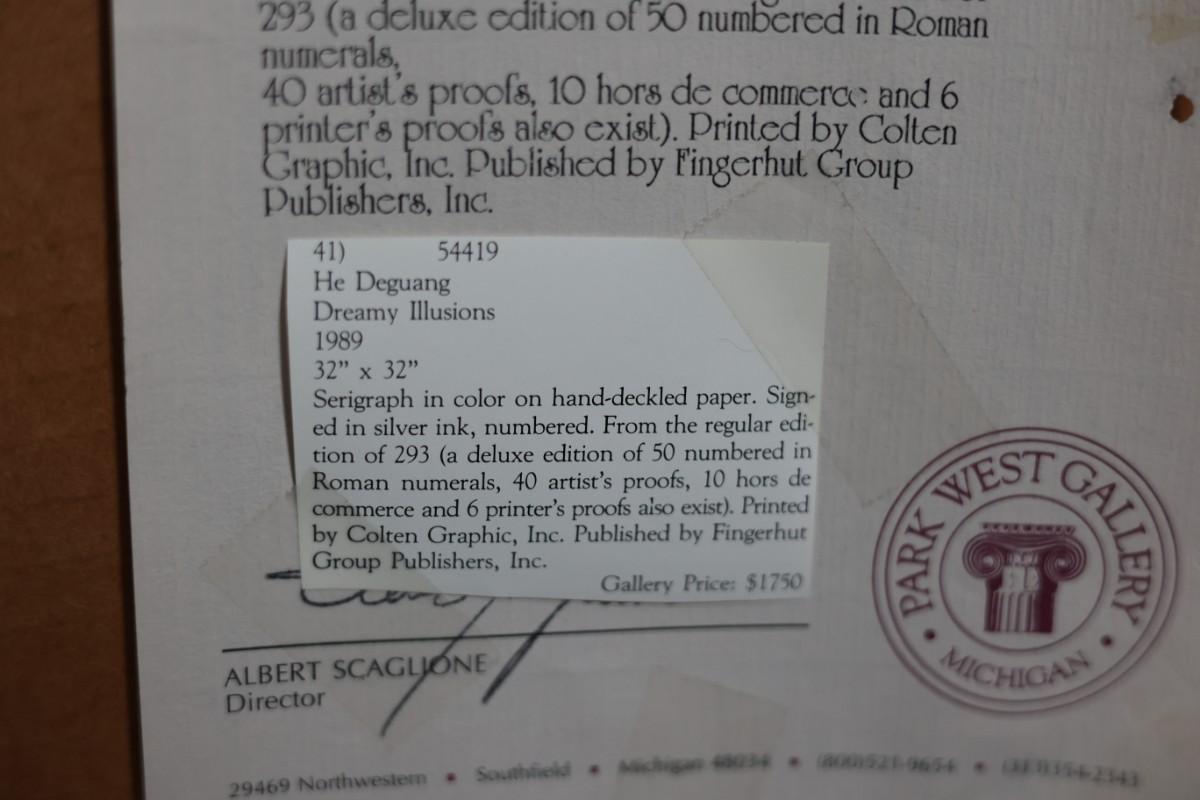 Framed serigraph titled “Dreamy Illusions” by He Deguang, dated 1989.