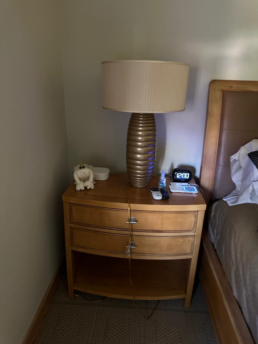 bed frame is wood and brown leather night stand and lamp and triple dresser.