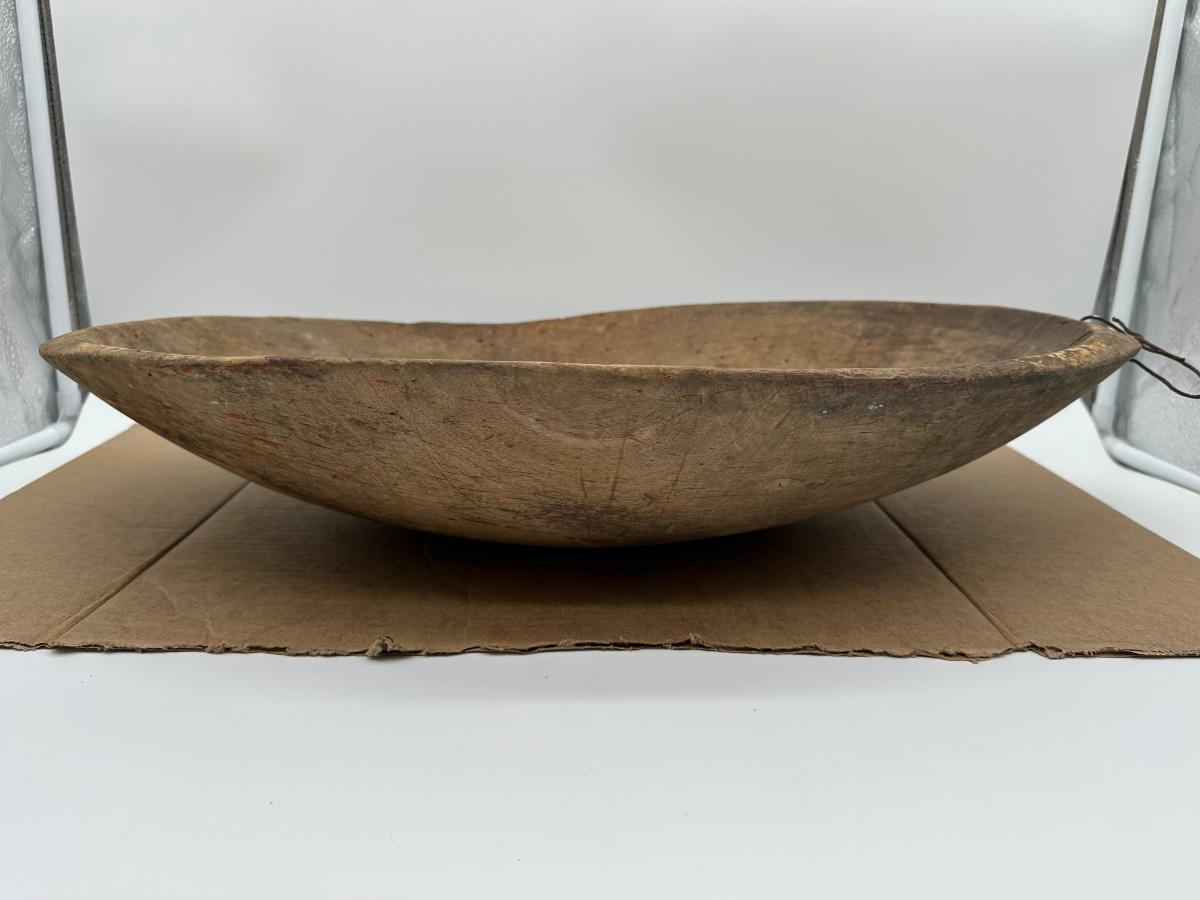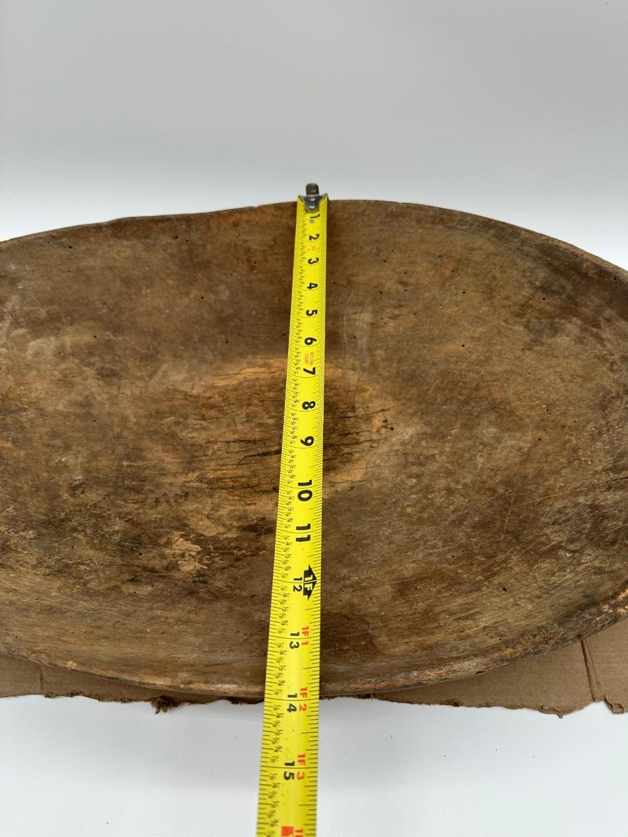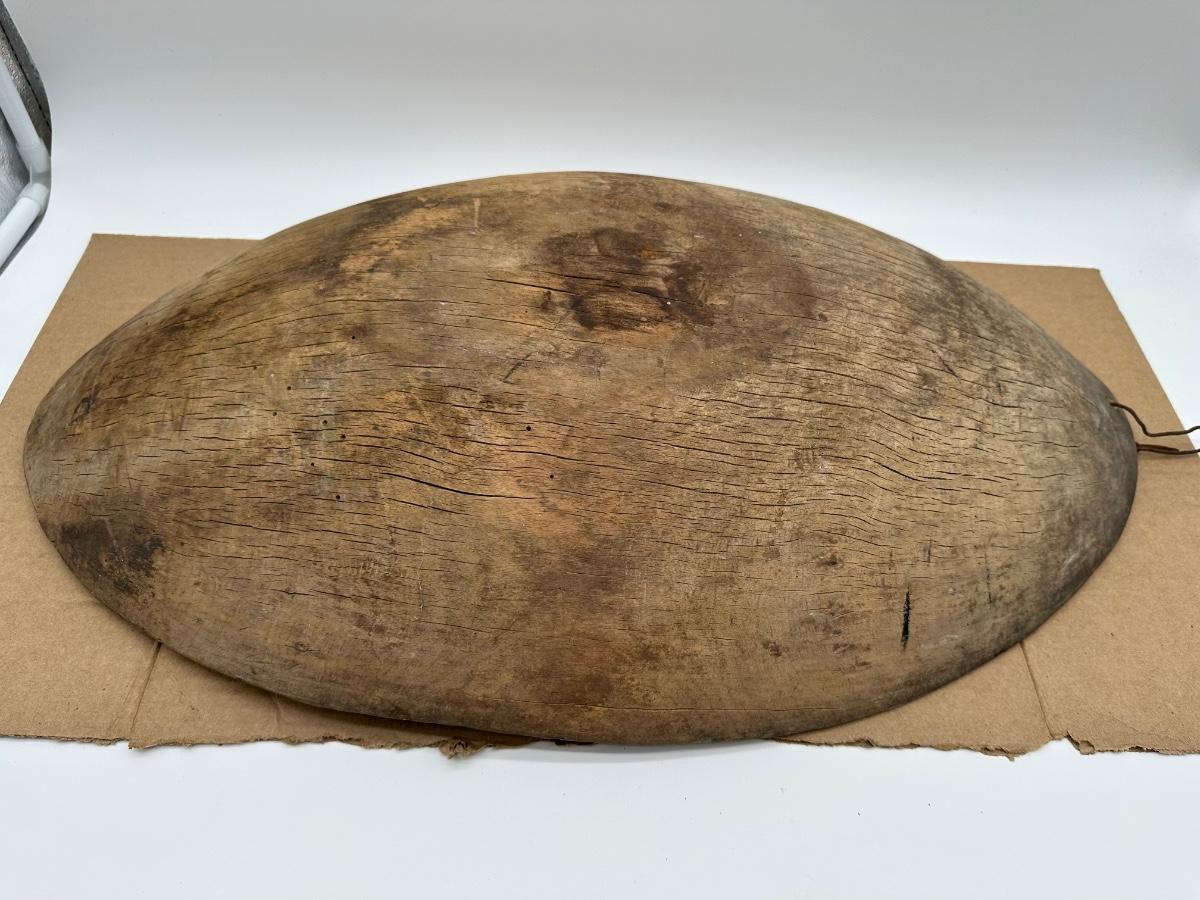 Authentic early hand-carved wooden dough bowl with deep oval form and rich, worn patina. Thick walls, tool marks, and age cracks throughout. Originally used for bread making or food prep; now ideal as primitive décor, centerpiece, or farmhouse display.