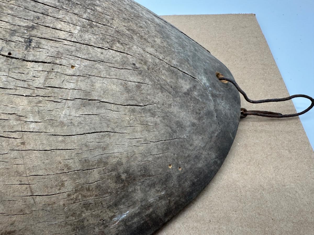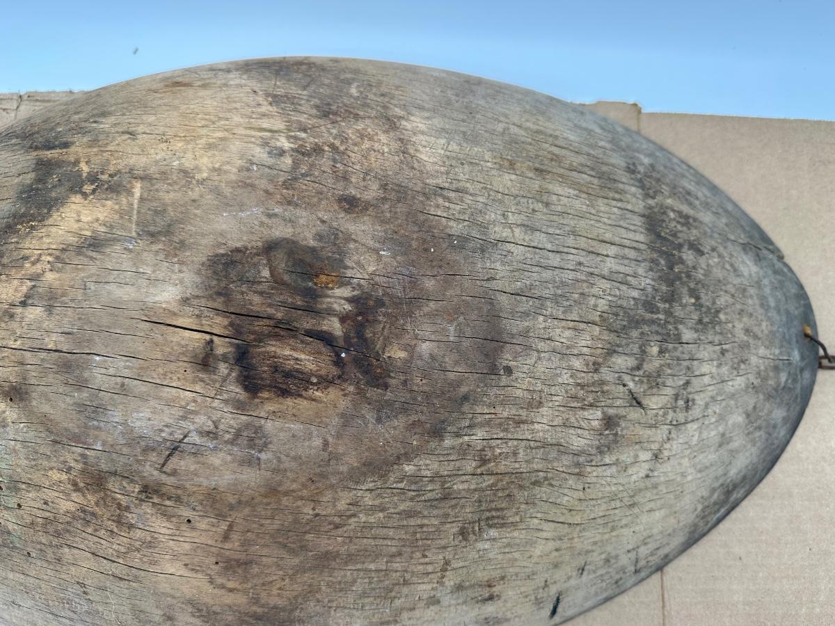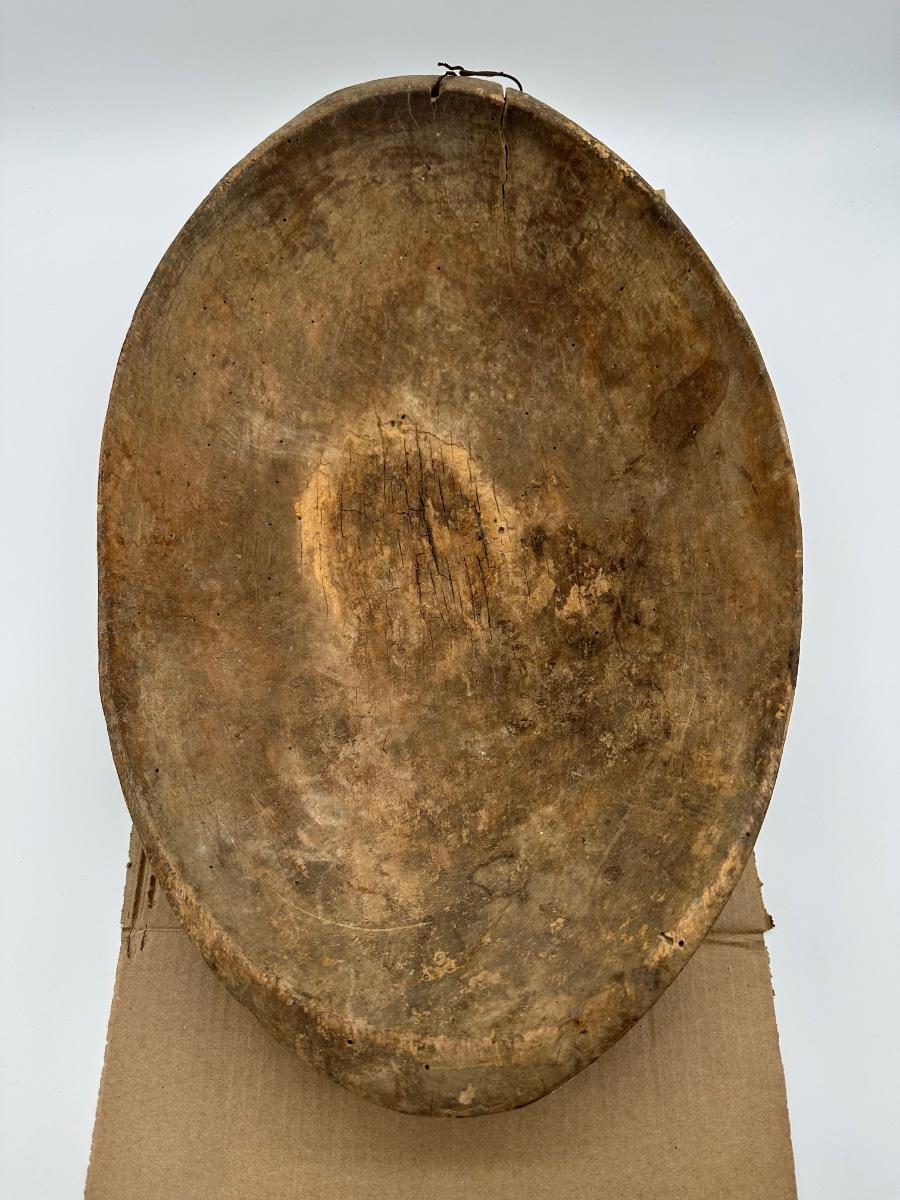 Authentic early hand-carved wooden dough bowl with deep oval form and rich, worn patina. Thick walls, tool marks, and age cracks throughout. Originally used for bread making or food prep; now ideal as primitive décor, centerpiece, or farmhouse display.