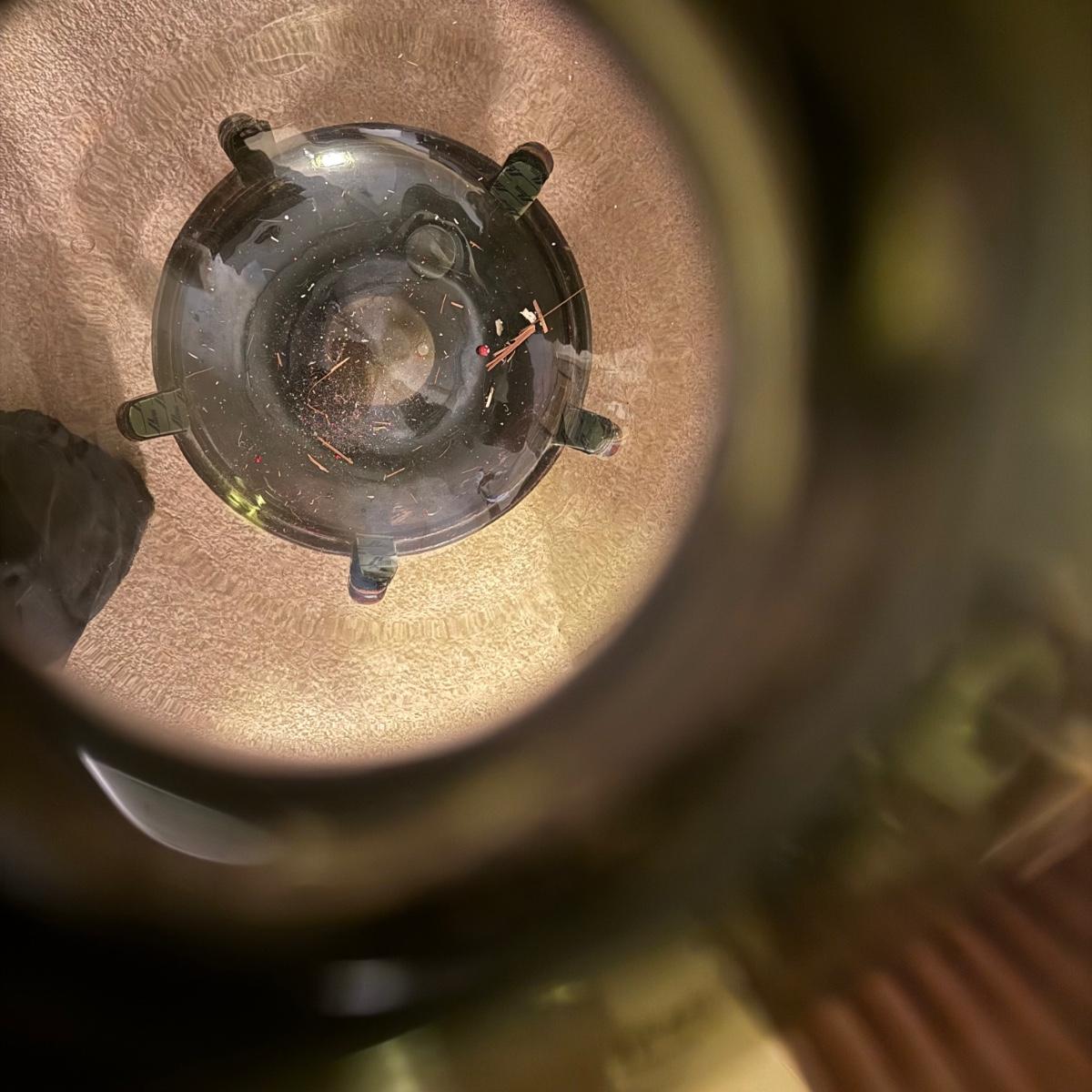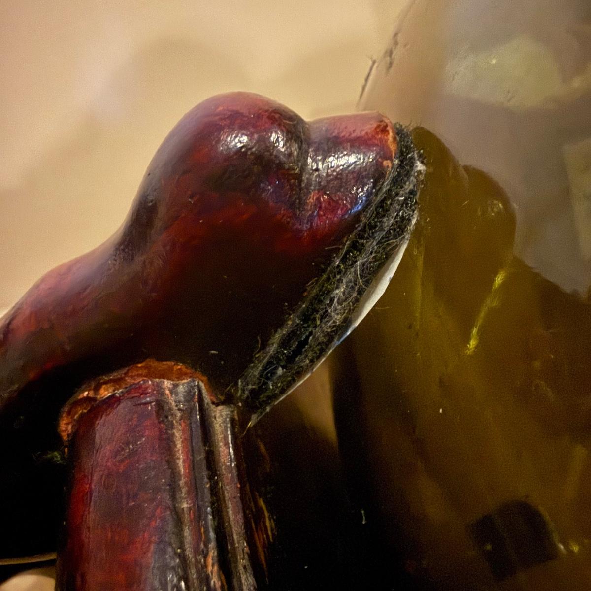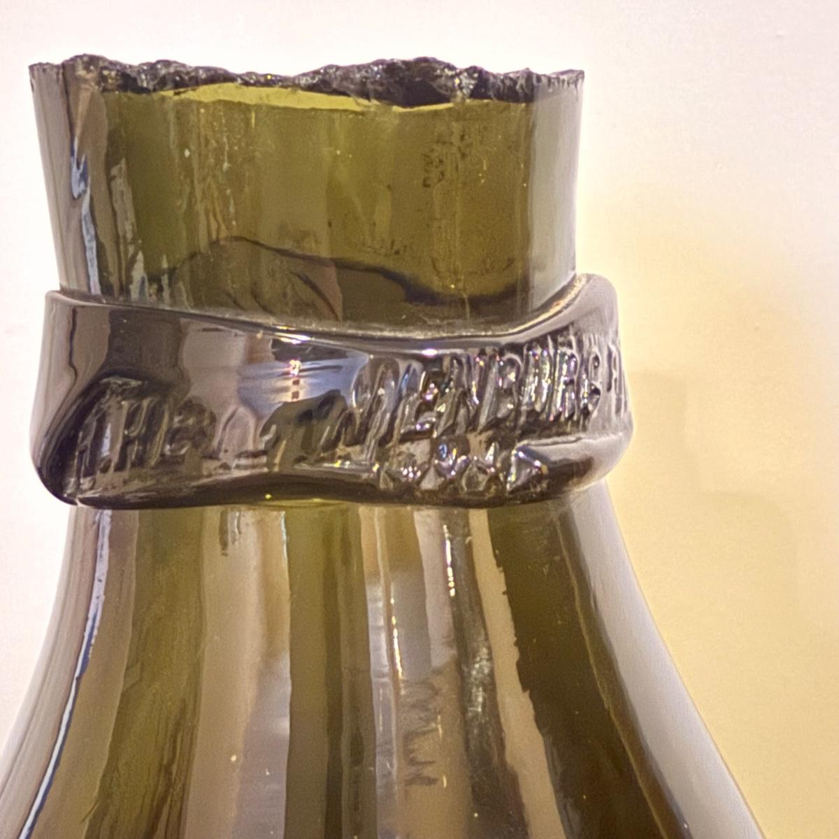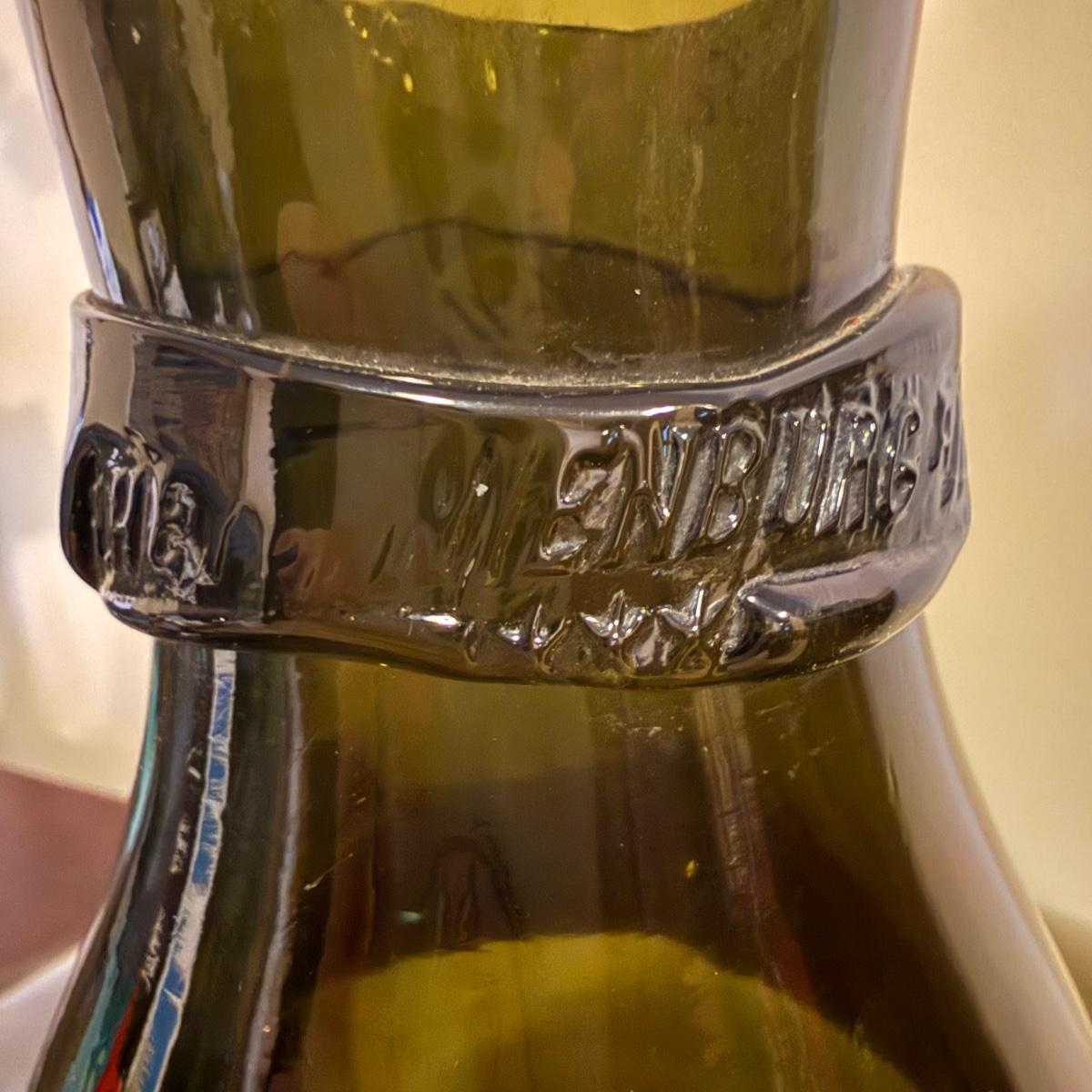 Lightly transparent green glass bottle on wooden stand. This size is/was known as a demijohn, used for transporting liquids such as wine or oil. Bottle and stand measures 17.5"D x 33.5"H. Top of bottle is a bit ragged and slightly sharp. Some writing appears on the band around the neck. There is an '04' in an oval stamp and also the letters 'LHL' and possibly 'HENBURG'. Some scratches in glass and nicks in wooden feet of base. The glass is attached to the base with Velcro tabs that are likely removable. See photos for details.