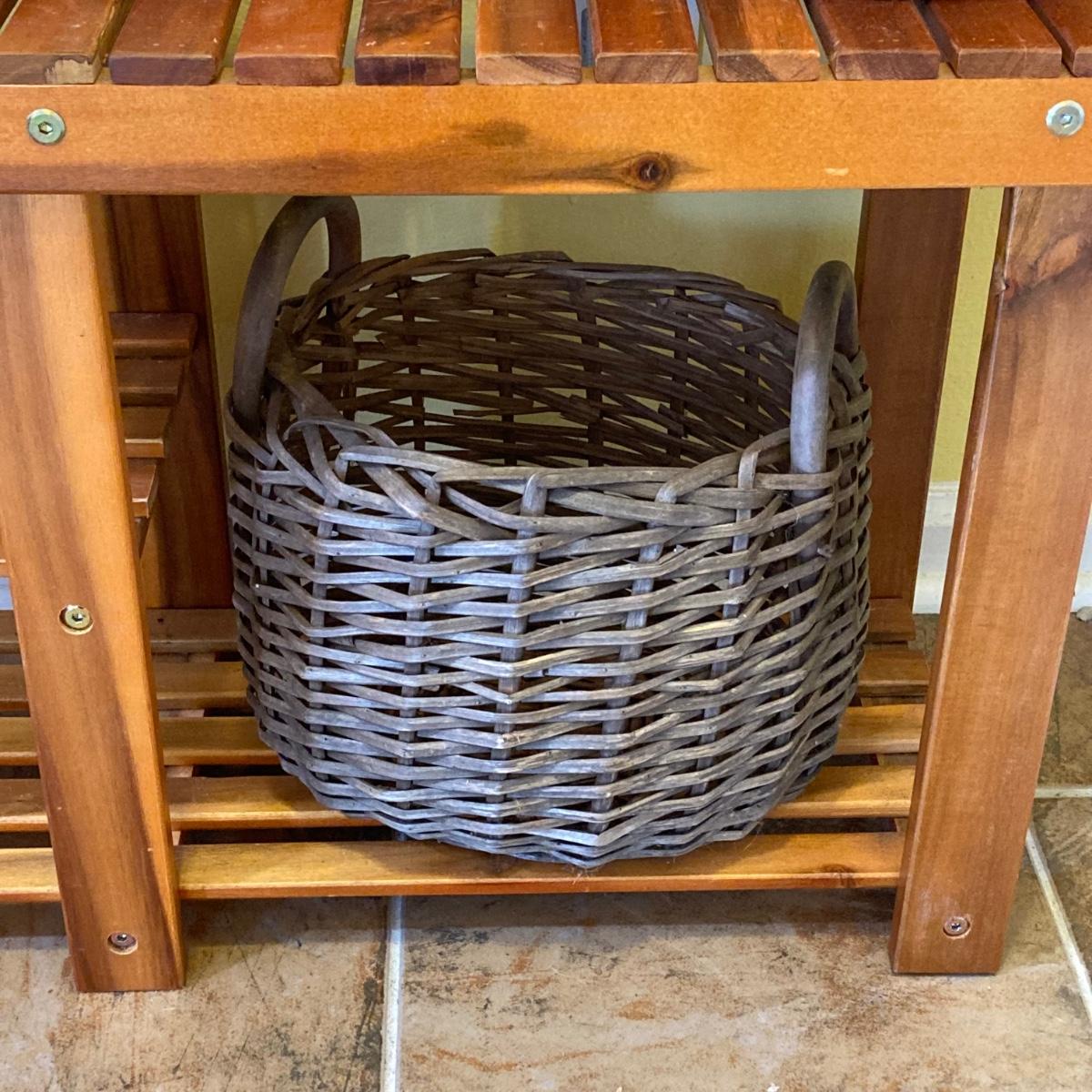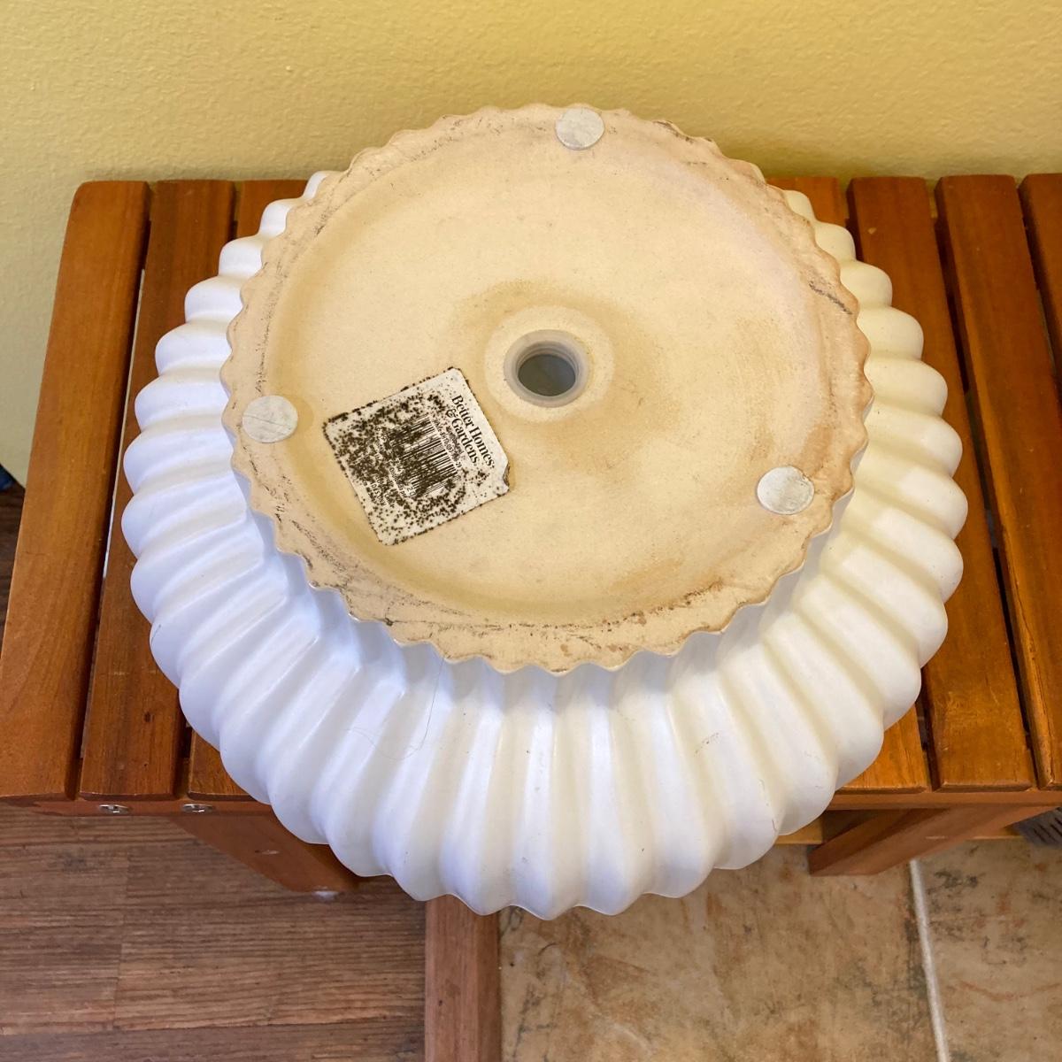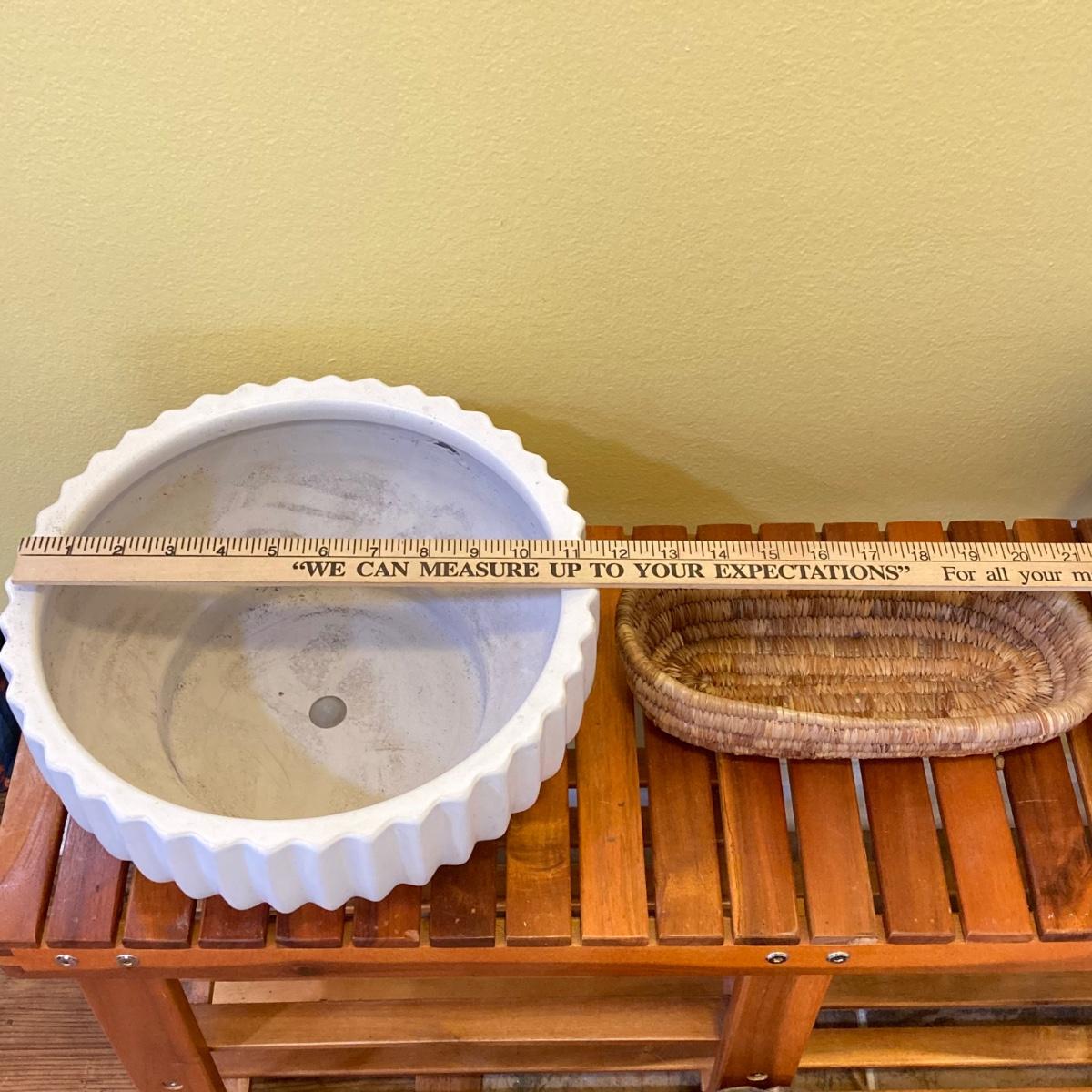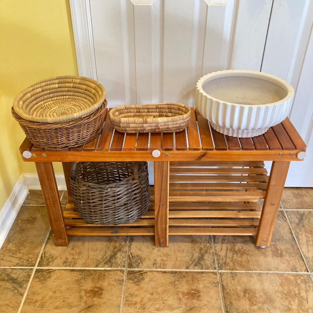 LOT 46: Wood Patiojoy Costway Bench with Baskets and White Better Homes and Gardens Planter