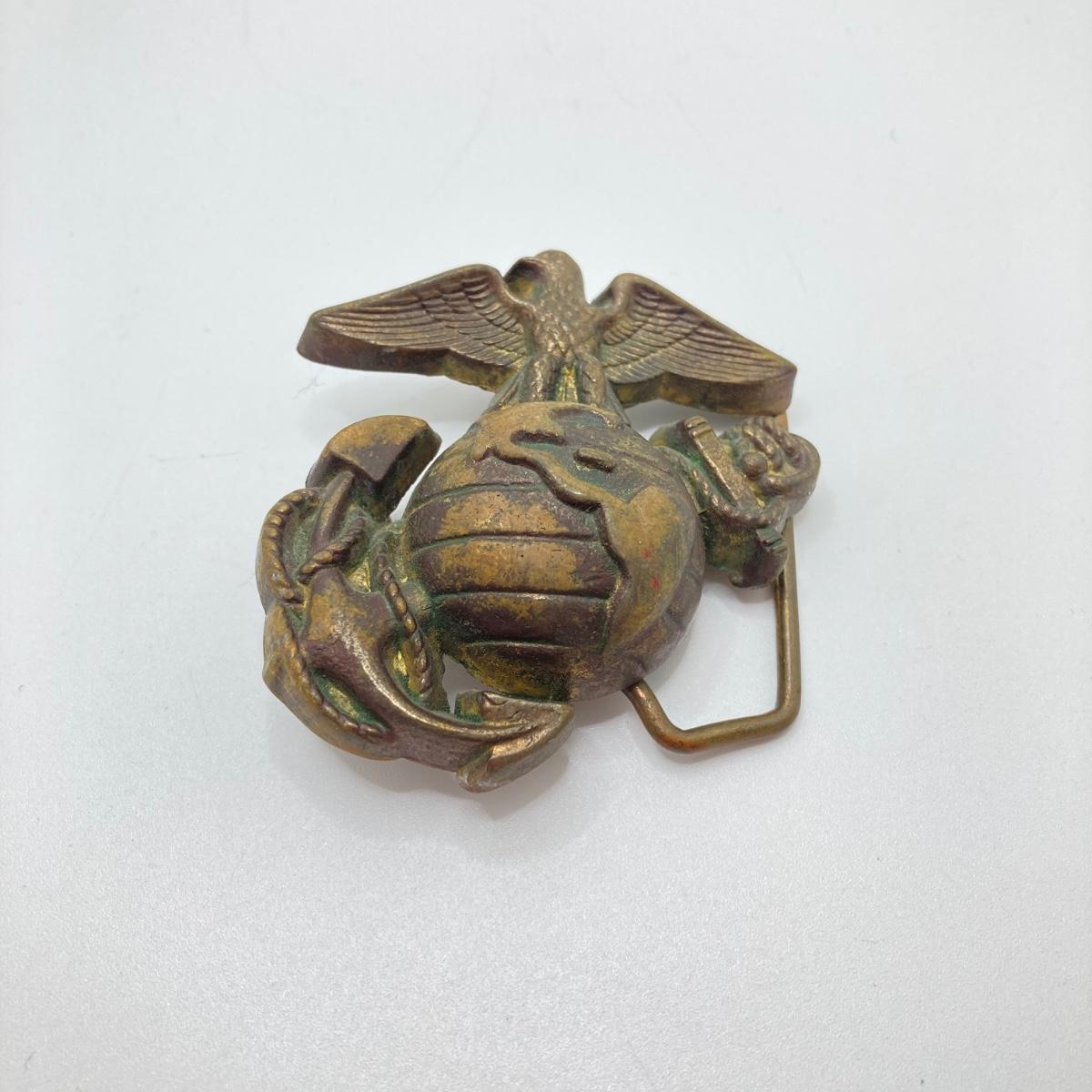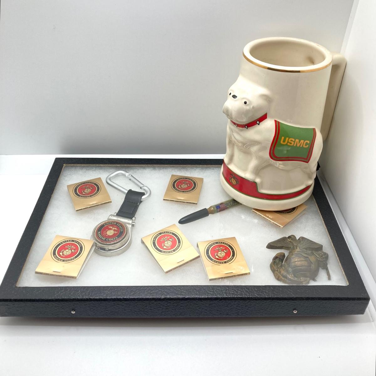 LOT 48: Vintage Militaria / Marines Collection - Baron Brass Belt Buckle, Key Chain / Watch, Souvenir Pen, USMC Mug and Matchbooks