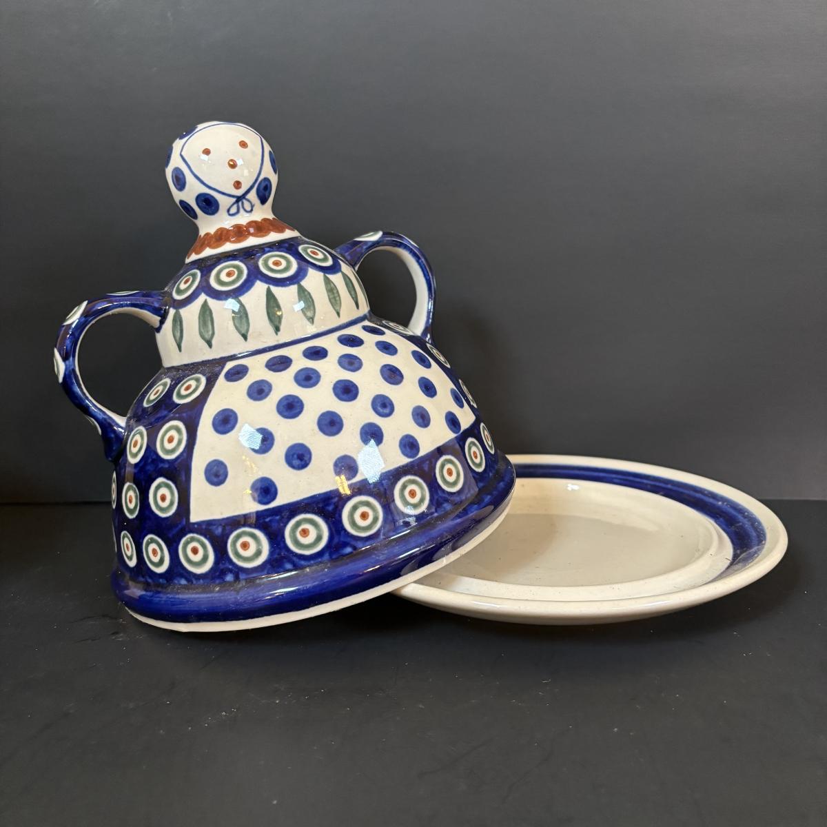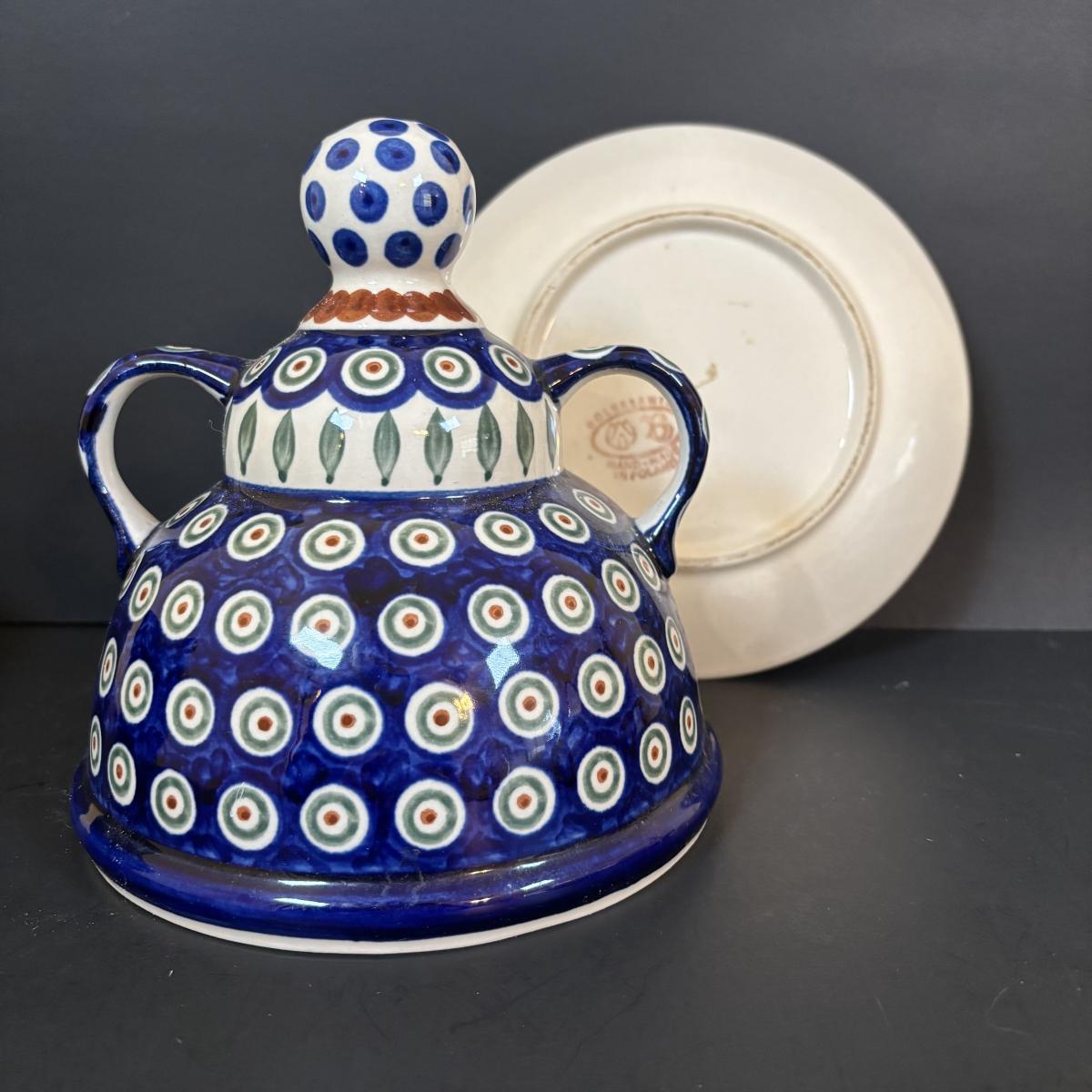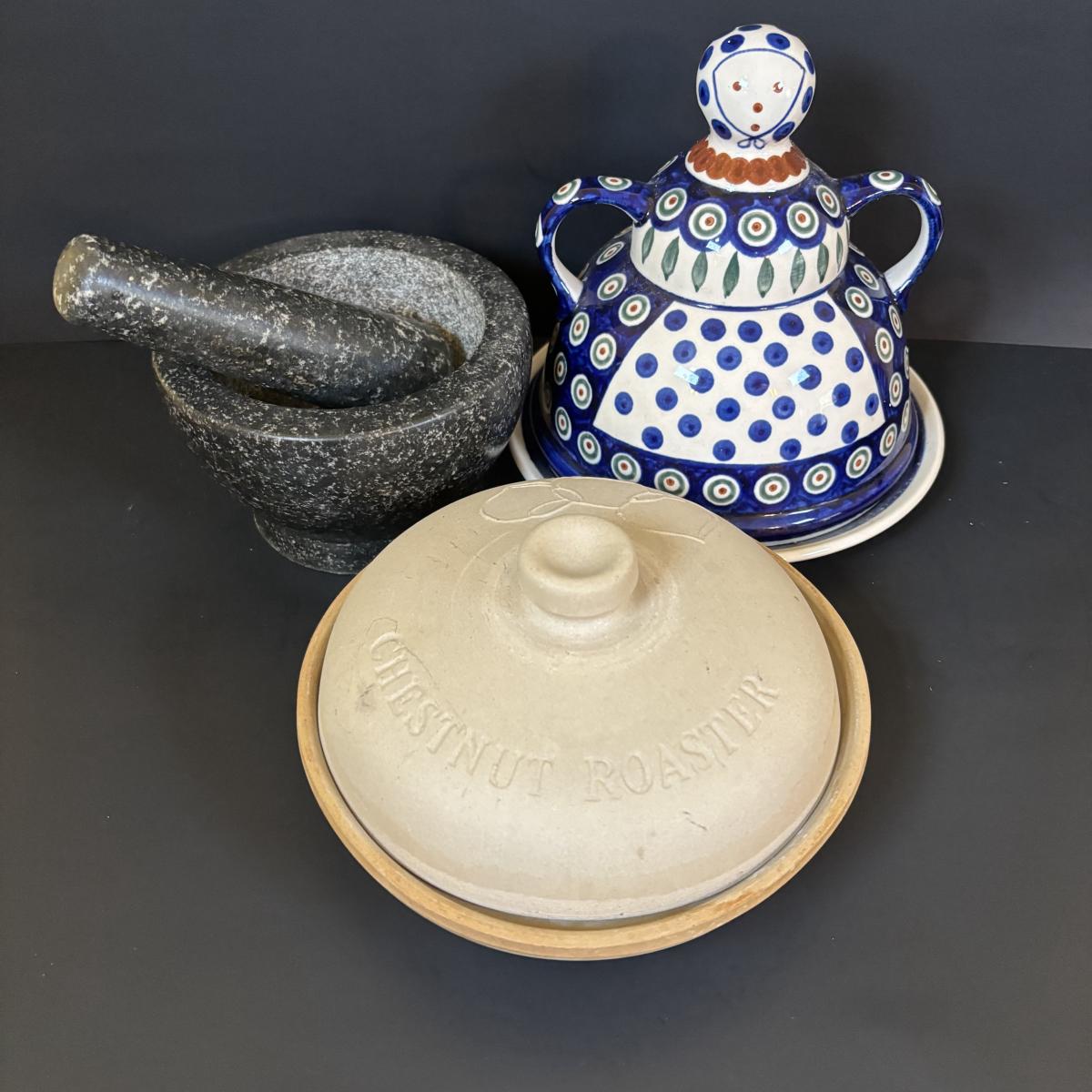 LOT 90: Vintage Polish Pottery Cheese Lady/Server, Vintage Sassafras Stoneware Chestnut Roaster along with a Mortar & Pestle