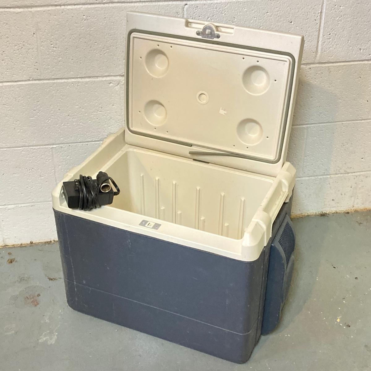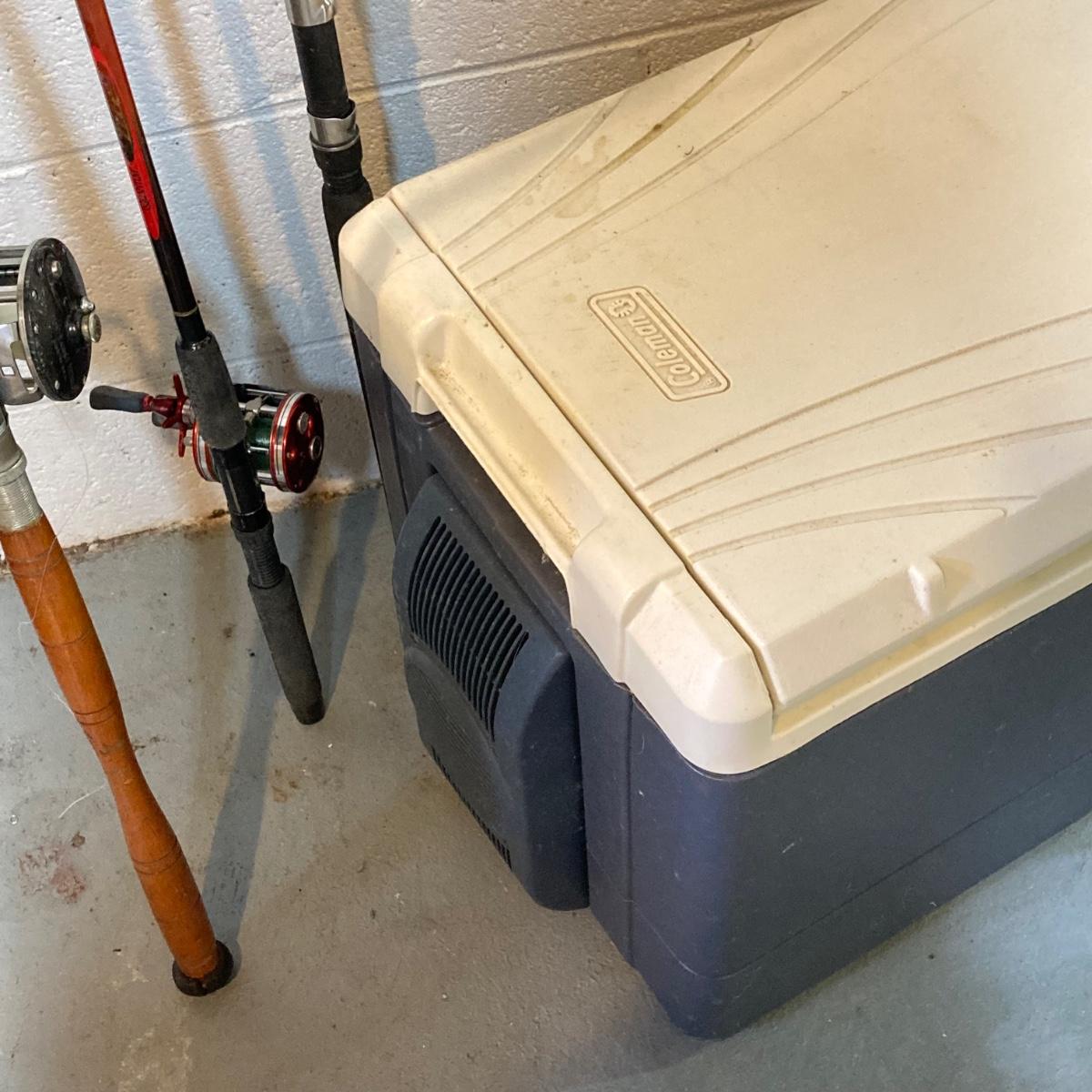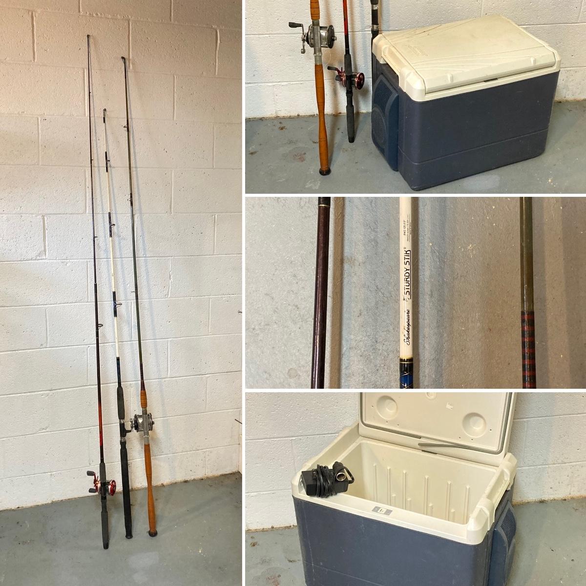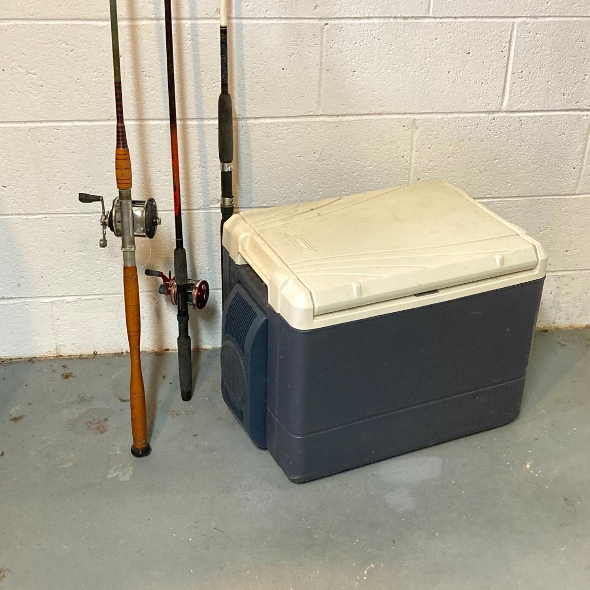 LOT 220: Three Fishing Rods (Two with Reels) and Coleman Powerchill with Car Adapter