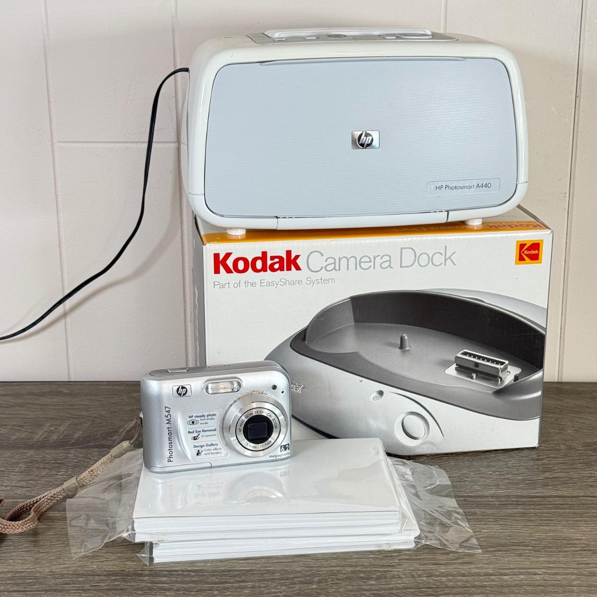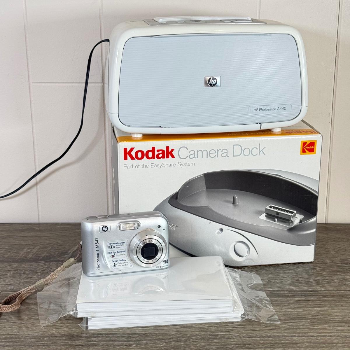 LOT 7K: HP Photosmart M547 Digital Camera, HP Photosmart A440 Photo Printer & Kodak Camera Dock