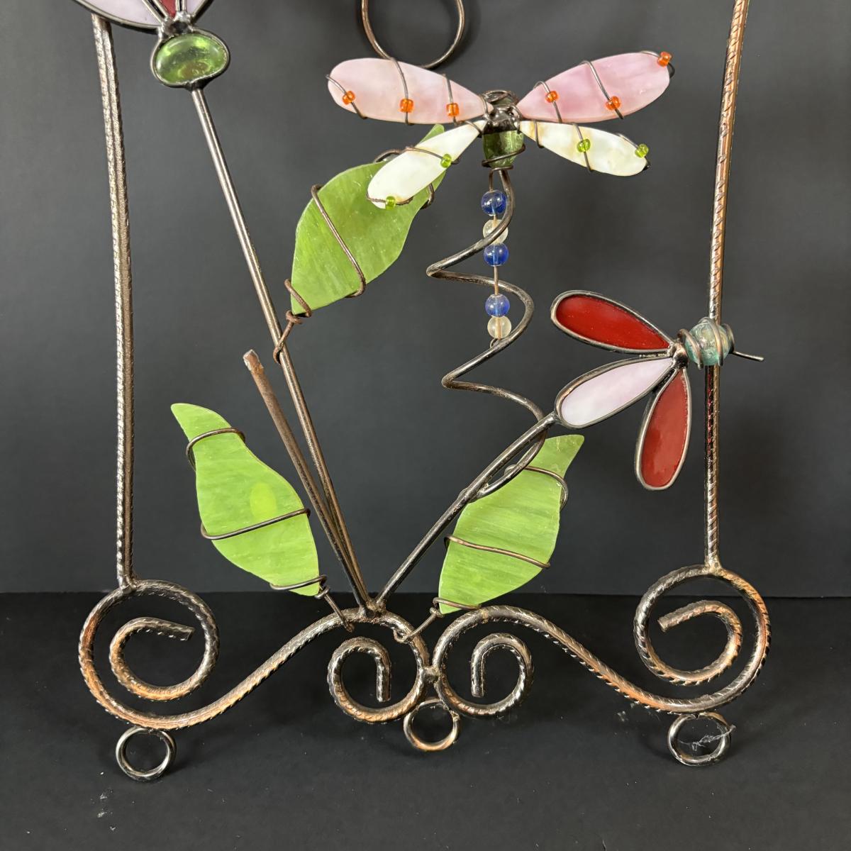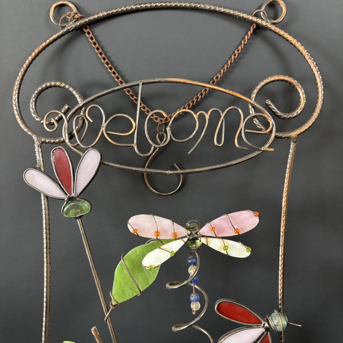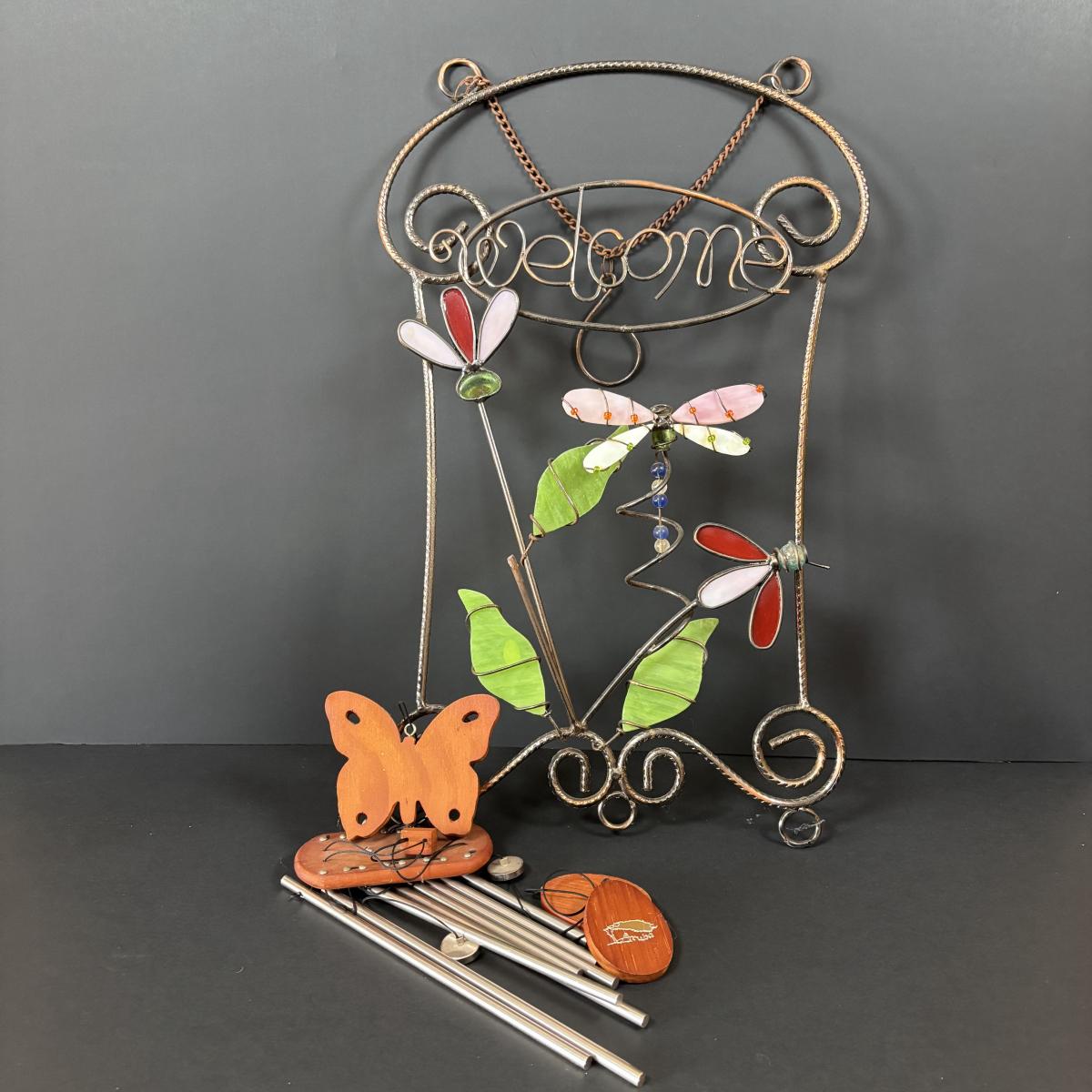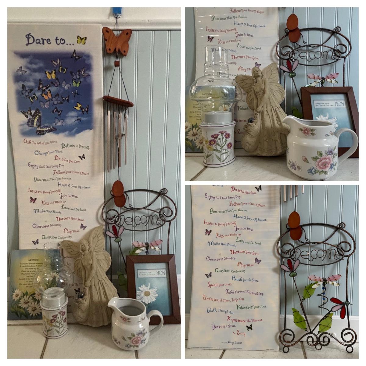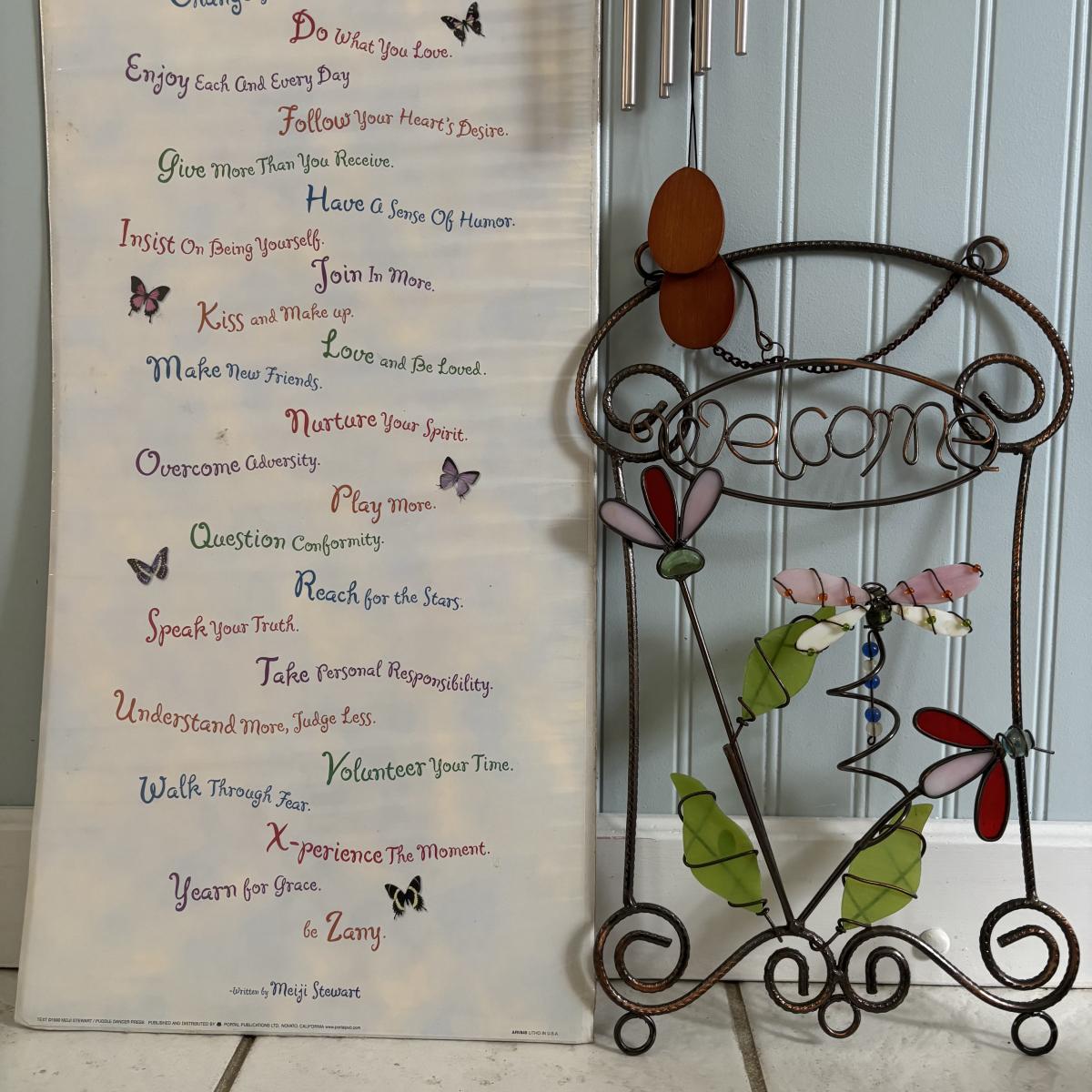 LOT 29: Home Decor: Cement Fairy Plaque, Portal "Dare To" Poster, Windchimes, Welcome Sign w/Stained Glass Accents, Colonial Candle Votive Holder. Floral Ceramic Pitcher
