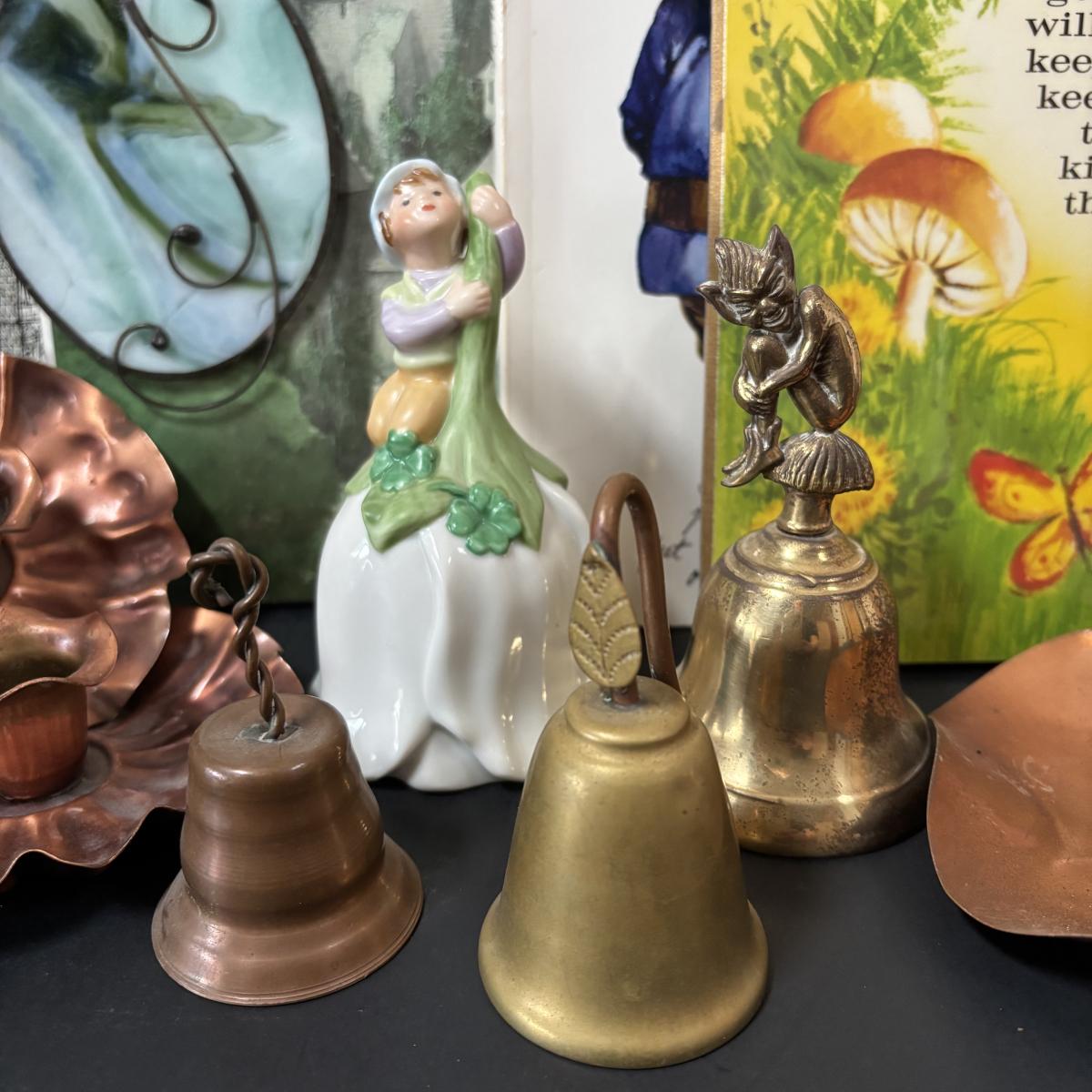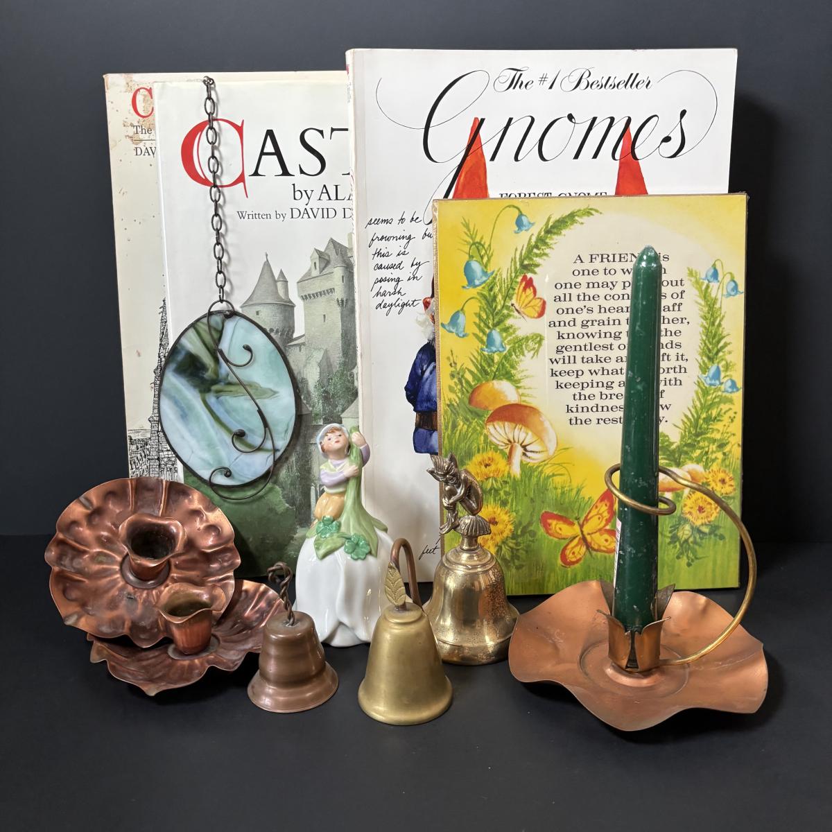 LOT 37: Home Decor: Made in England Pixie Bell, Hammered Copper Candle Holders, Stained Glass, Gnomes Softcover Book & More