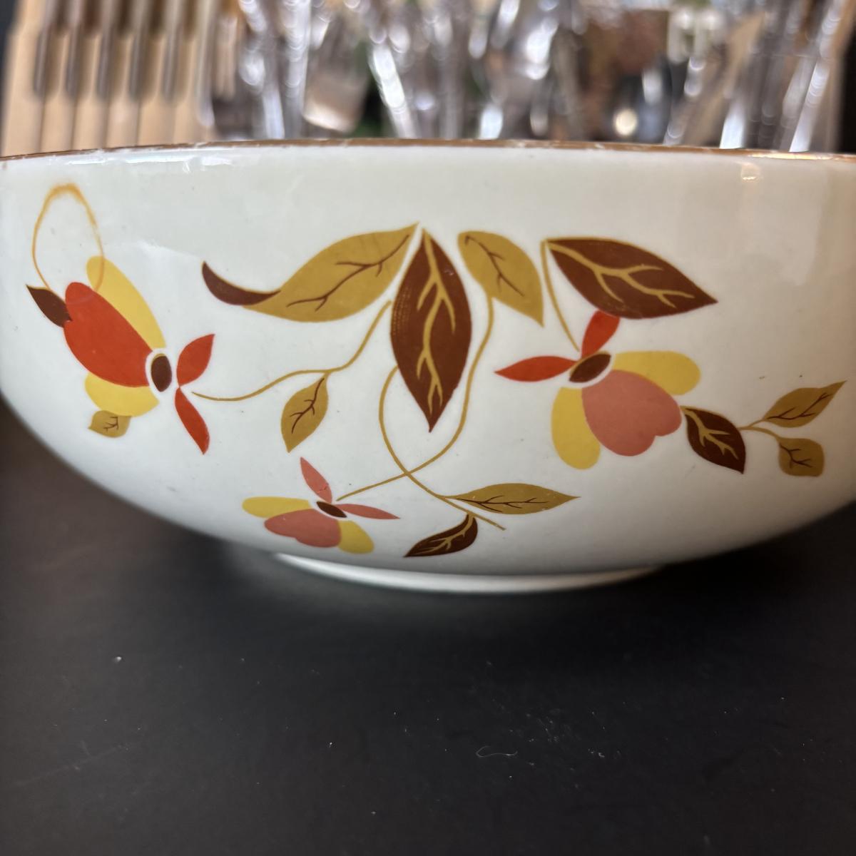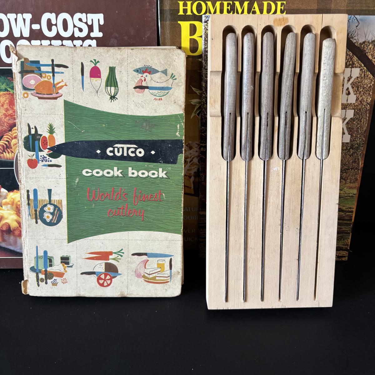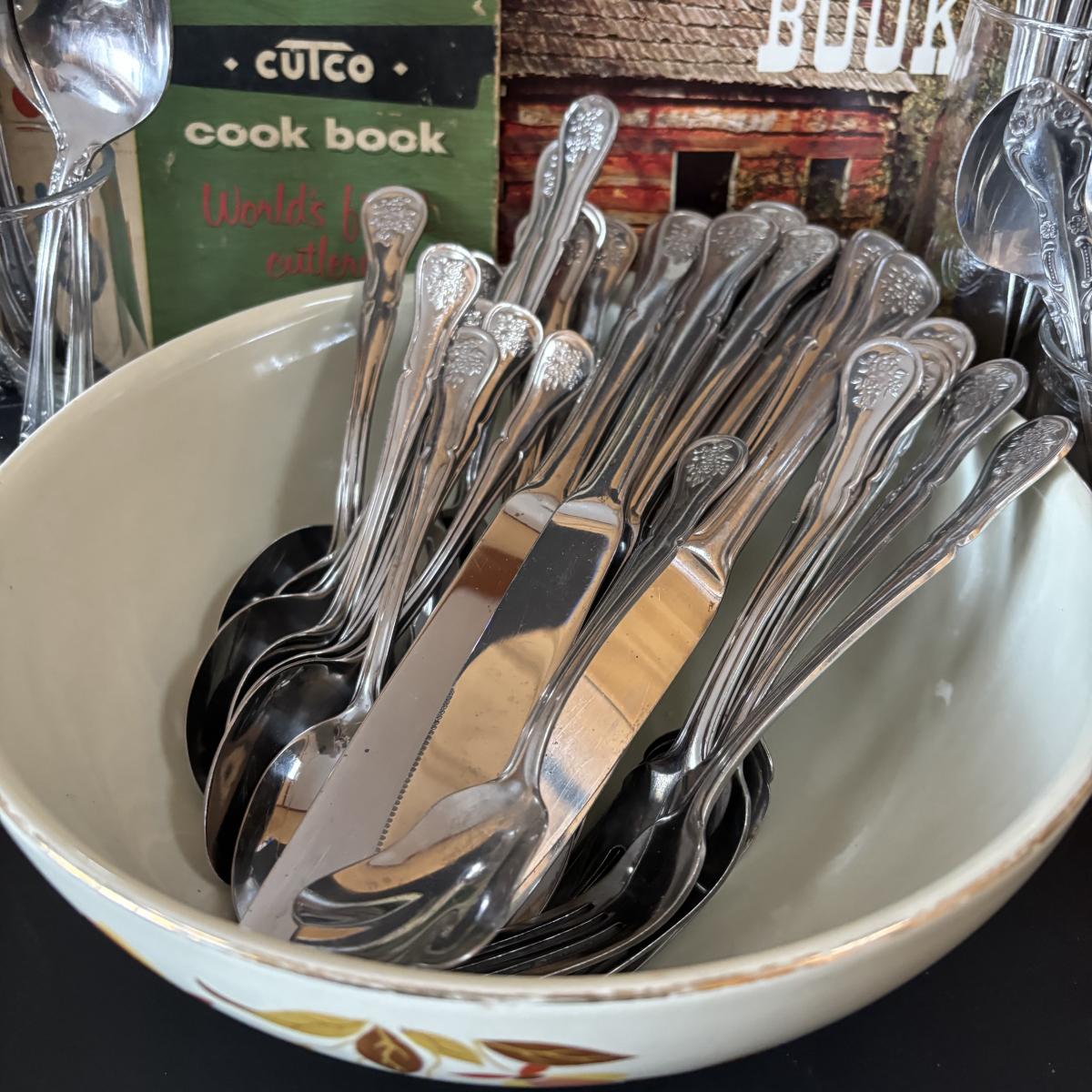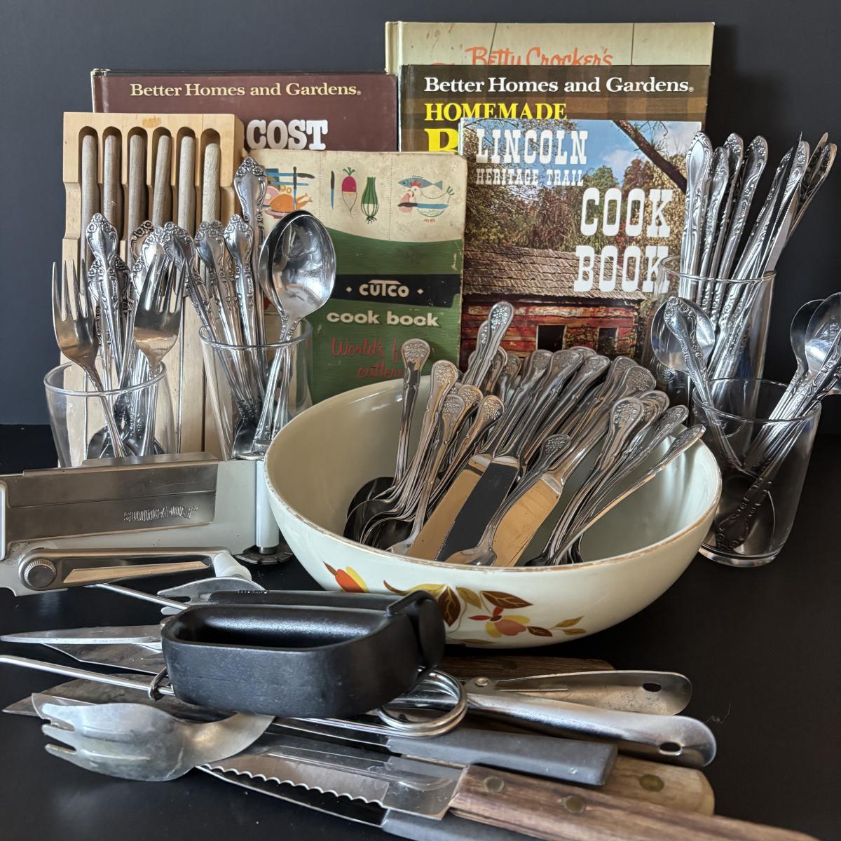 LOT 41: Vintage Hall Autumn Leaf Kitchenware Bowl, Swing Anyway Can Opener, Knives, Flatware & Cookbooks