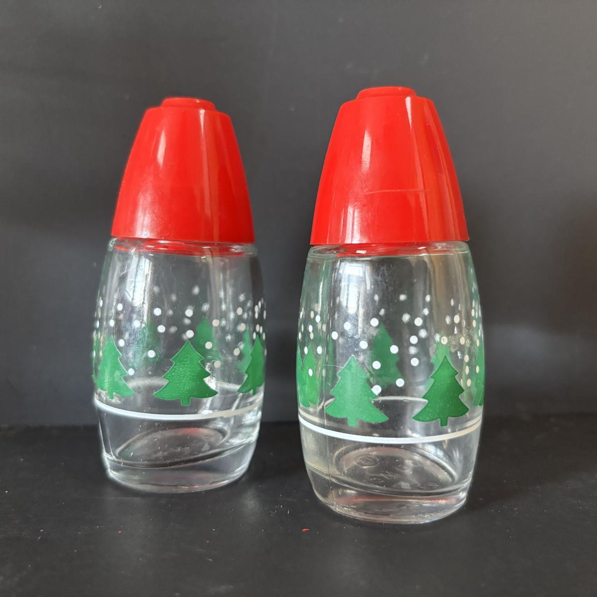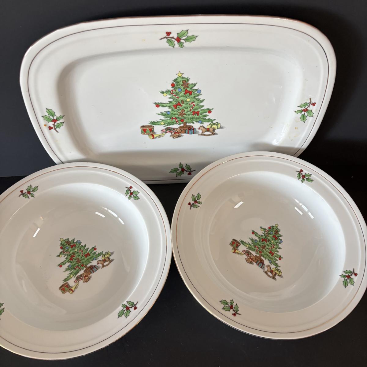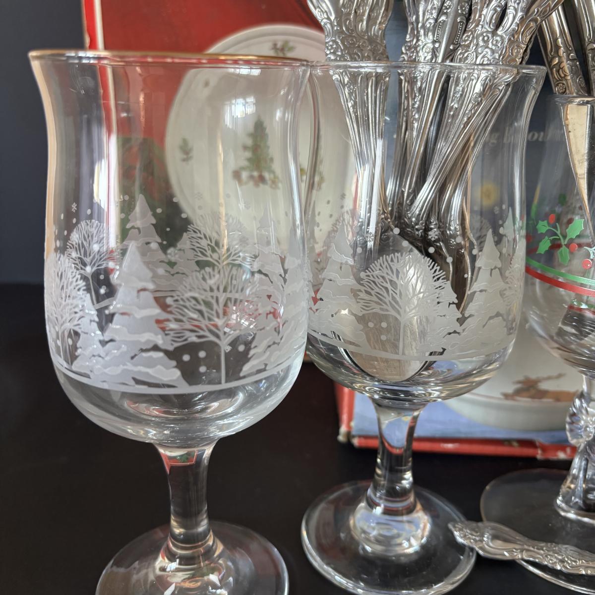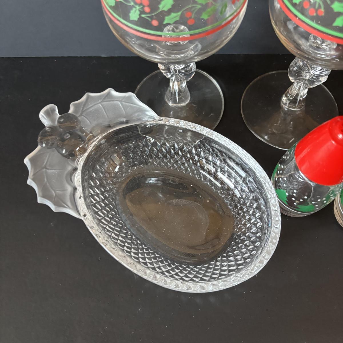 LOT 42: Vintage Gemco Christmas Tree Salt/Pepper Shakers, Holiday Water Goblets, Holiday Hostess 3-pc Serving Set, Susan Winget "Over the House Tops" Serving Bowls & More