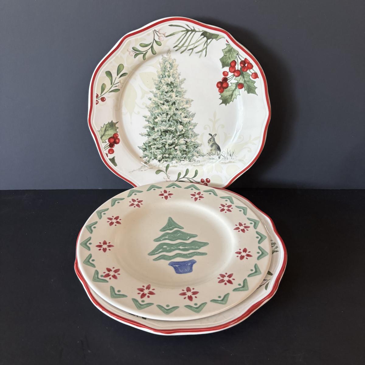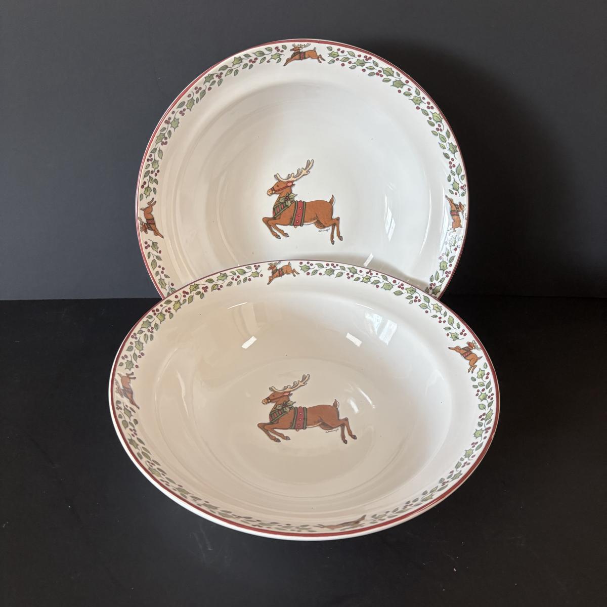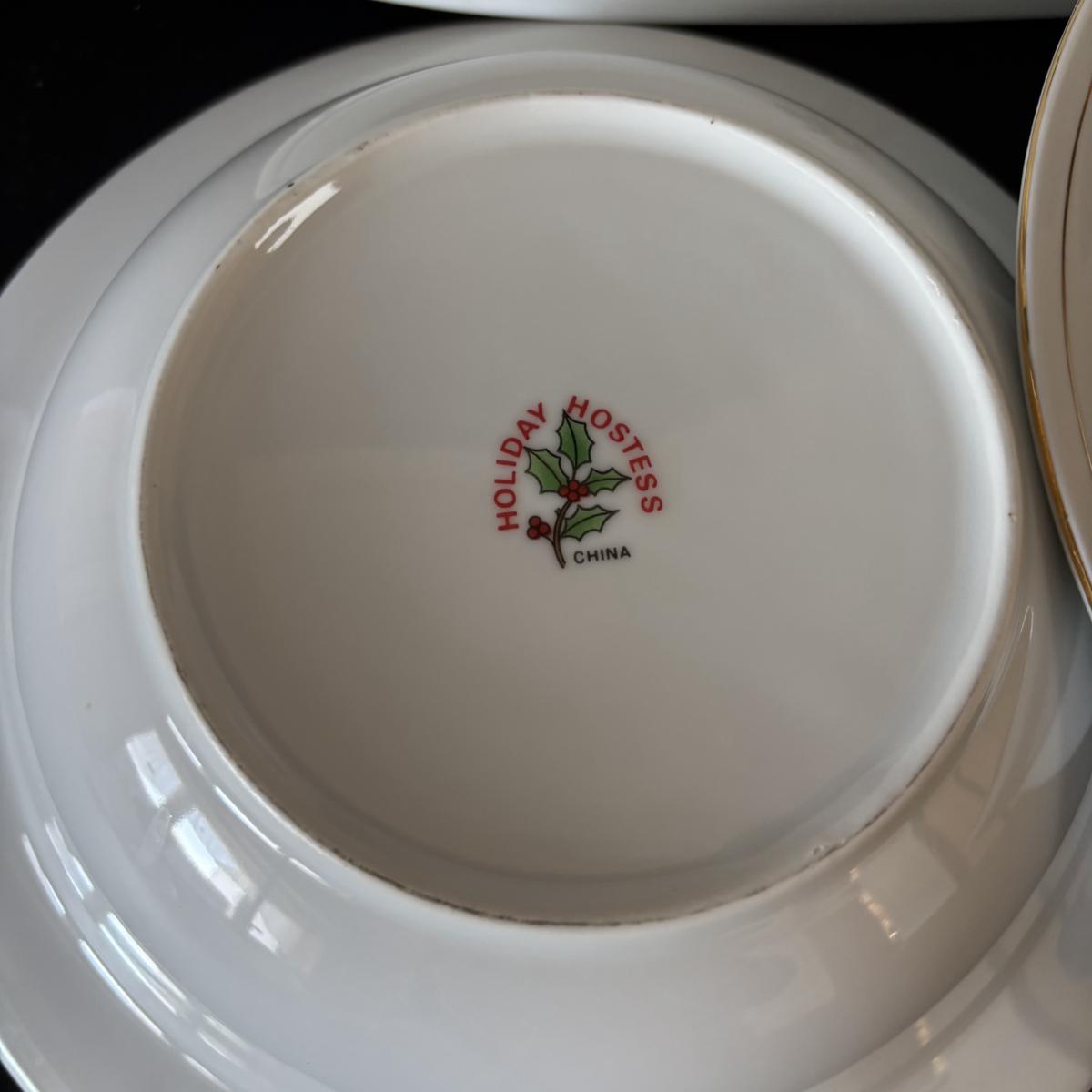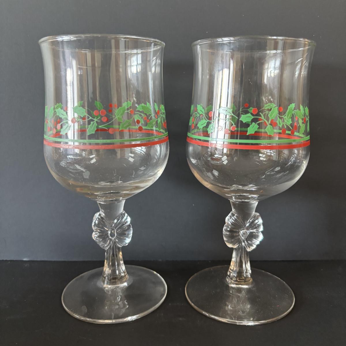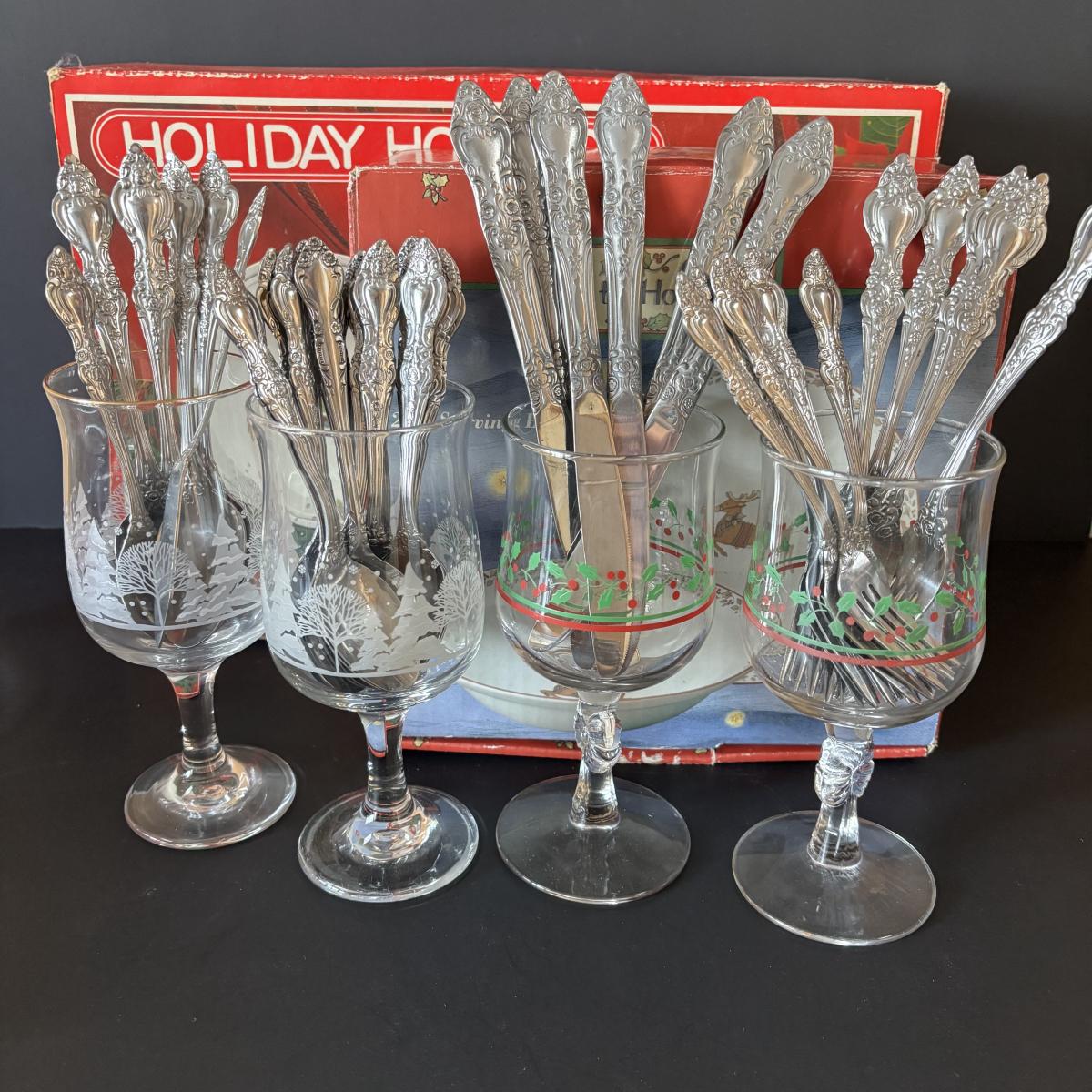 LOT 42: Vintage Gemco Christmas Tree Salt/Pepper Shakers, Holiday Water Goblets, Holiday Hostess 3-pc Serving Set, Susan Winget "Over the House Tops" Serving Bowls & More
