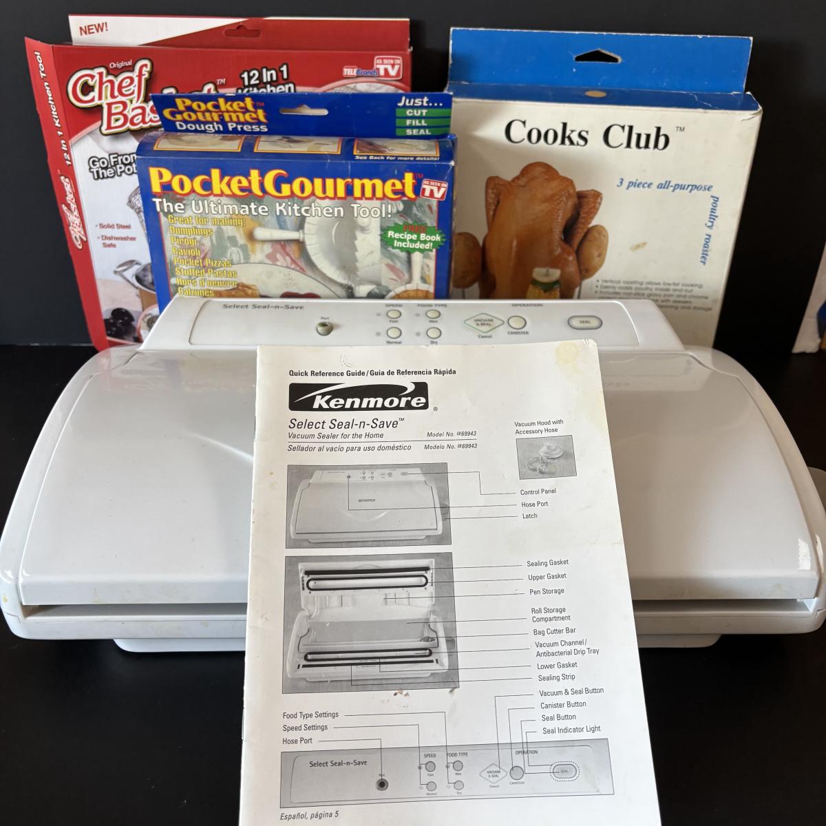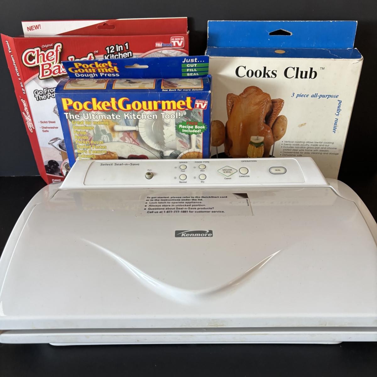 LOT 43: Kenmore Seal n Save Food Saver, Cooks Club Roaster, Pocket Gourmet & Chef Basket