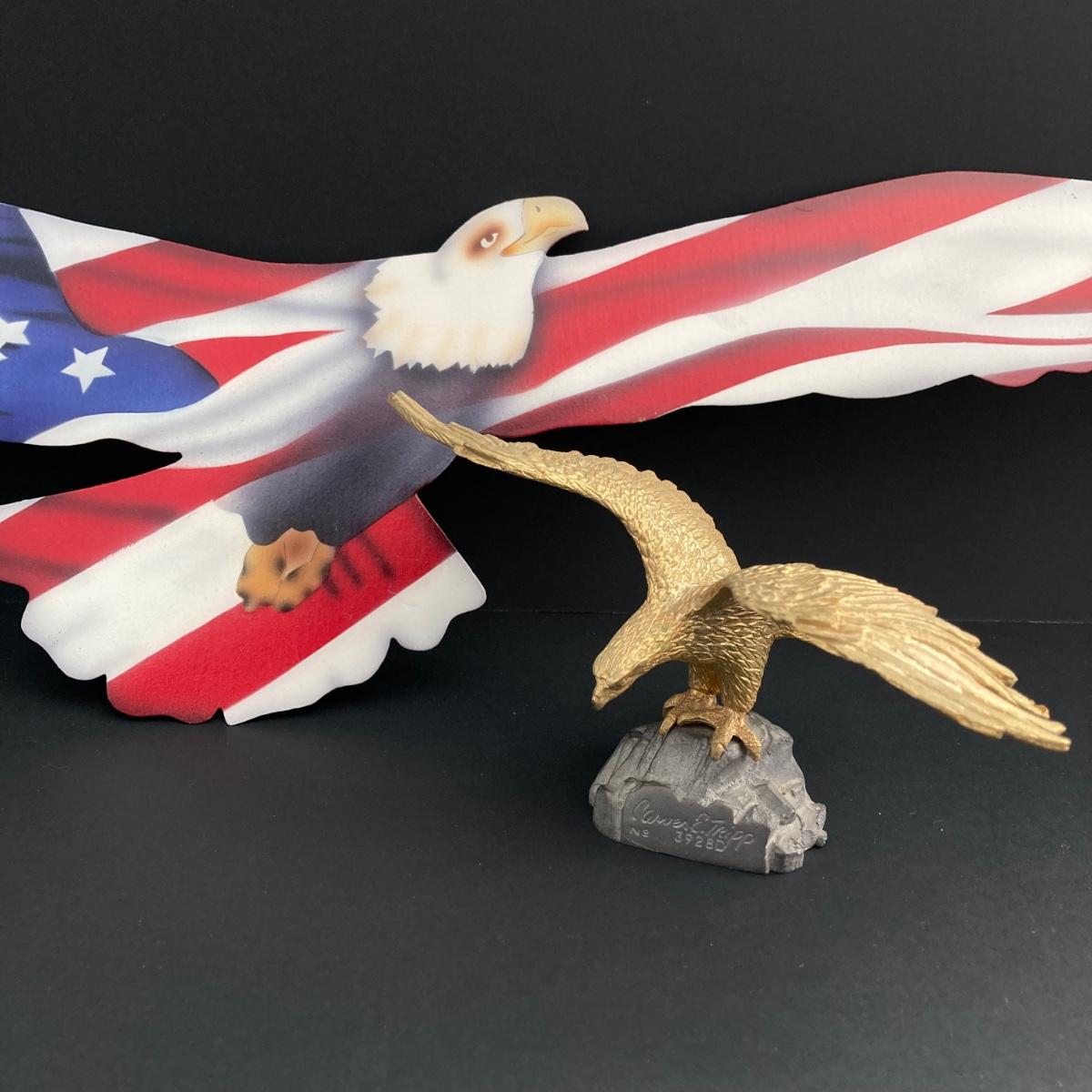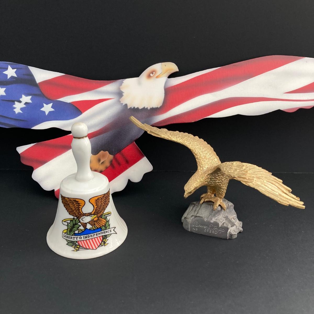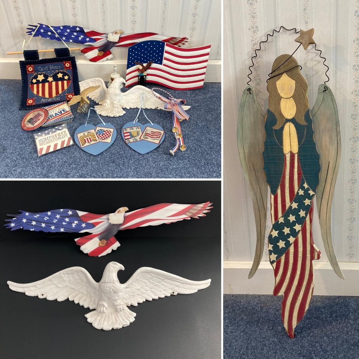LOT 81L: Collection of Patriotic Decor - Wall Hangings, American Eagles, Carver E Tripp Numbered Figurine, Angel, Coasters and More