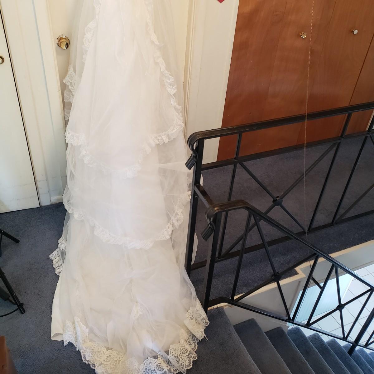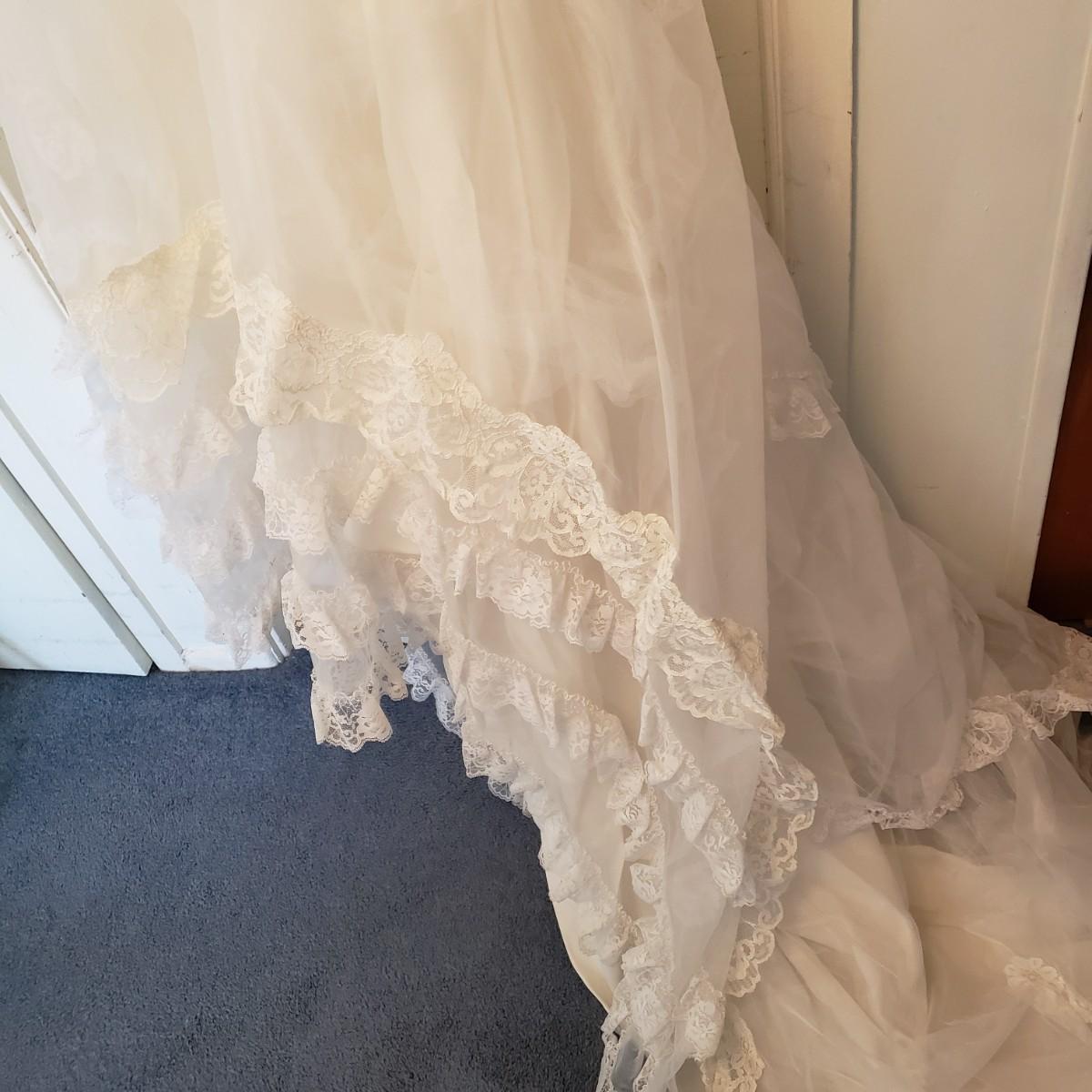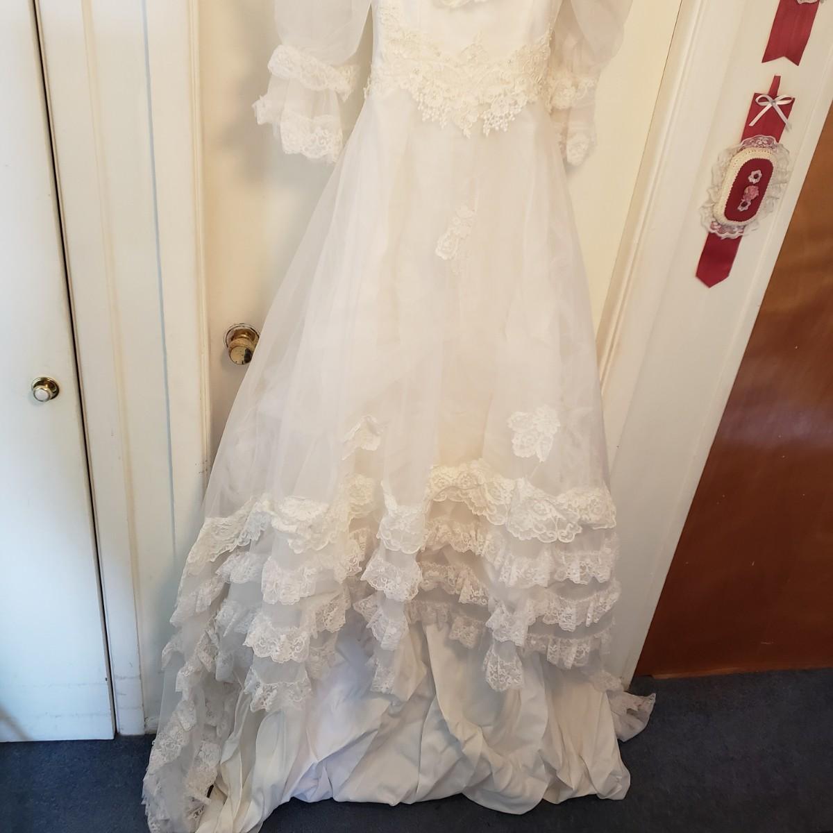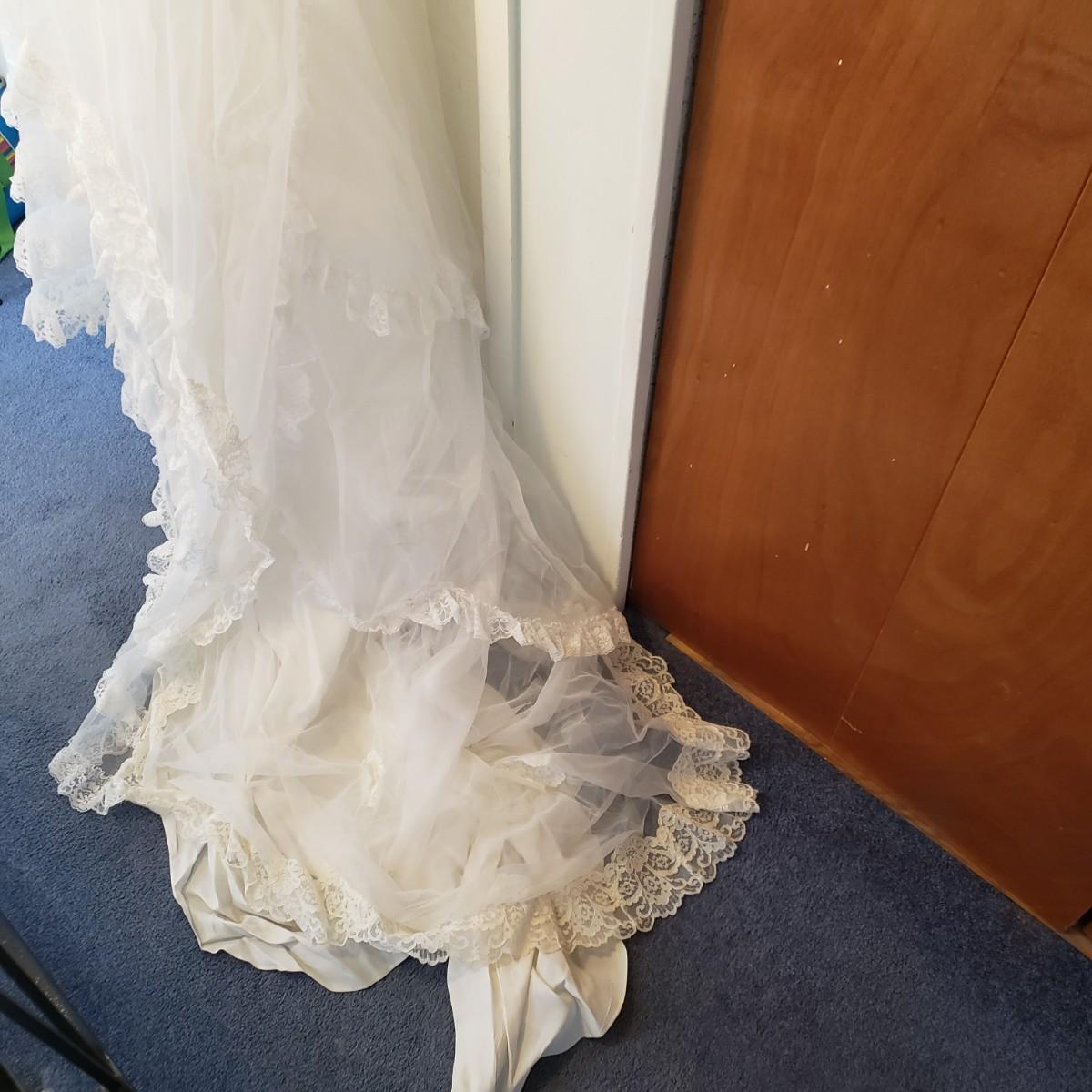 LOT 107: Vintage 1970s/80s Wedding Dress with Lace Ruffle Train & Veil