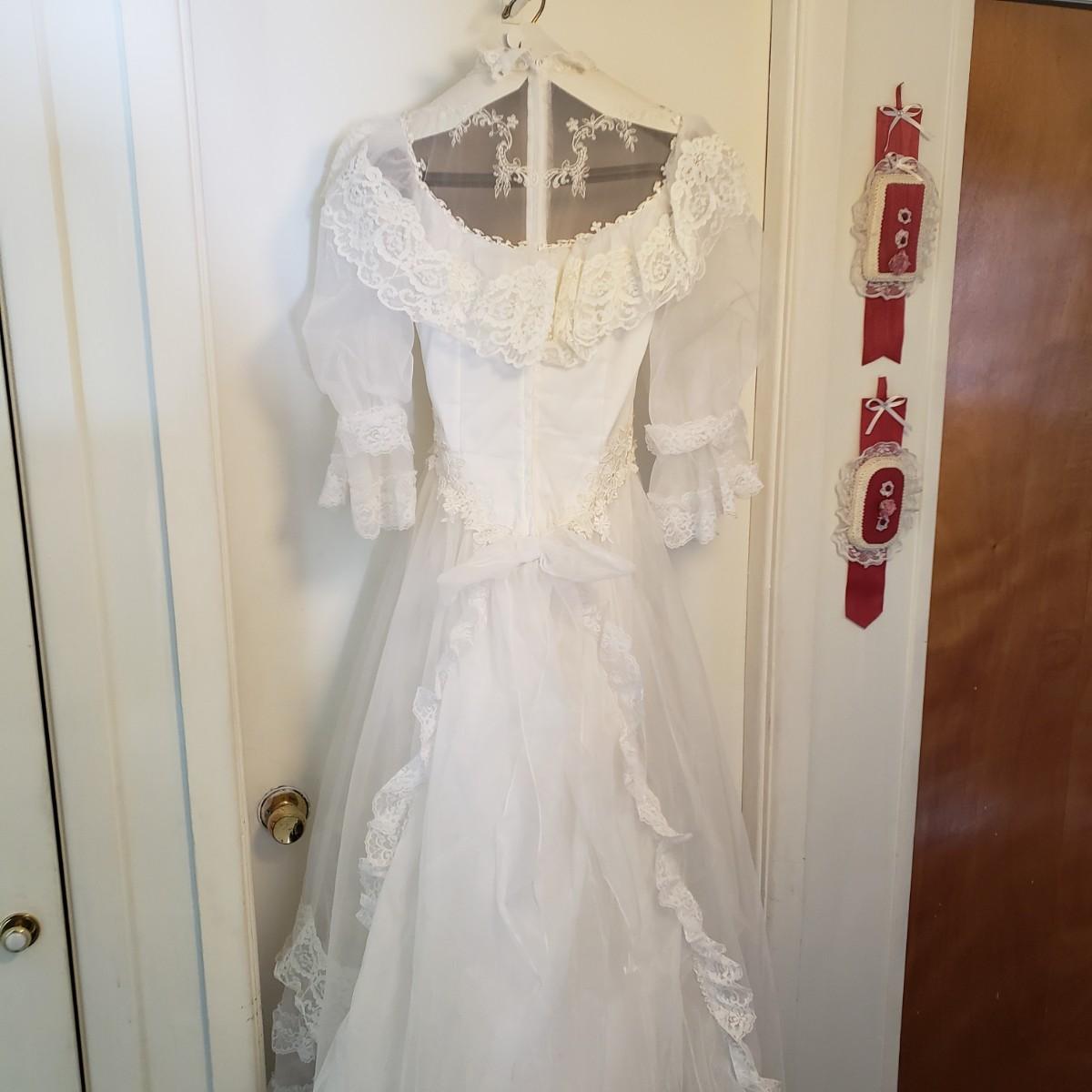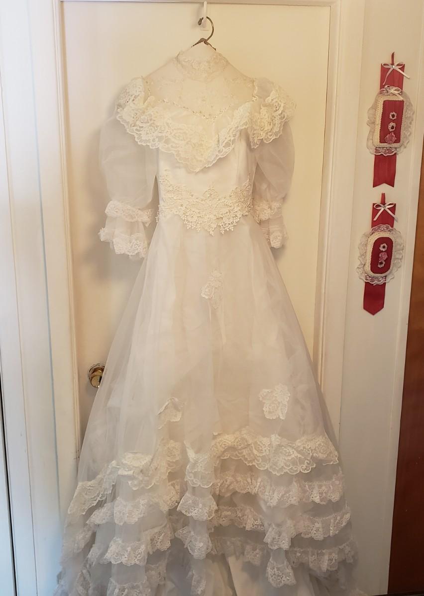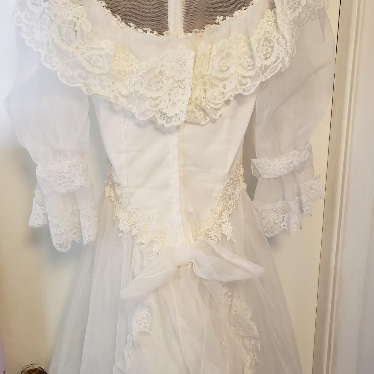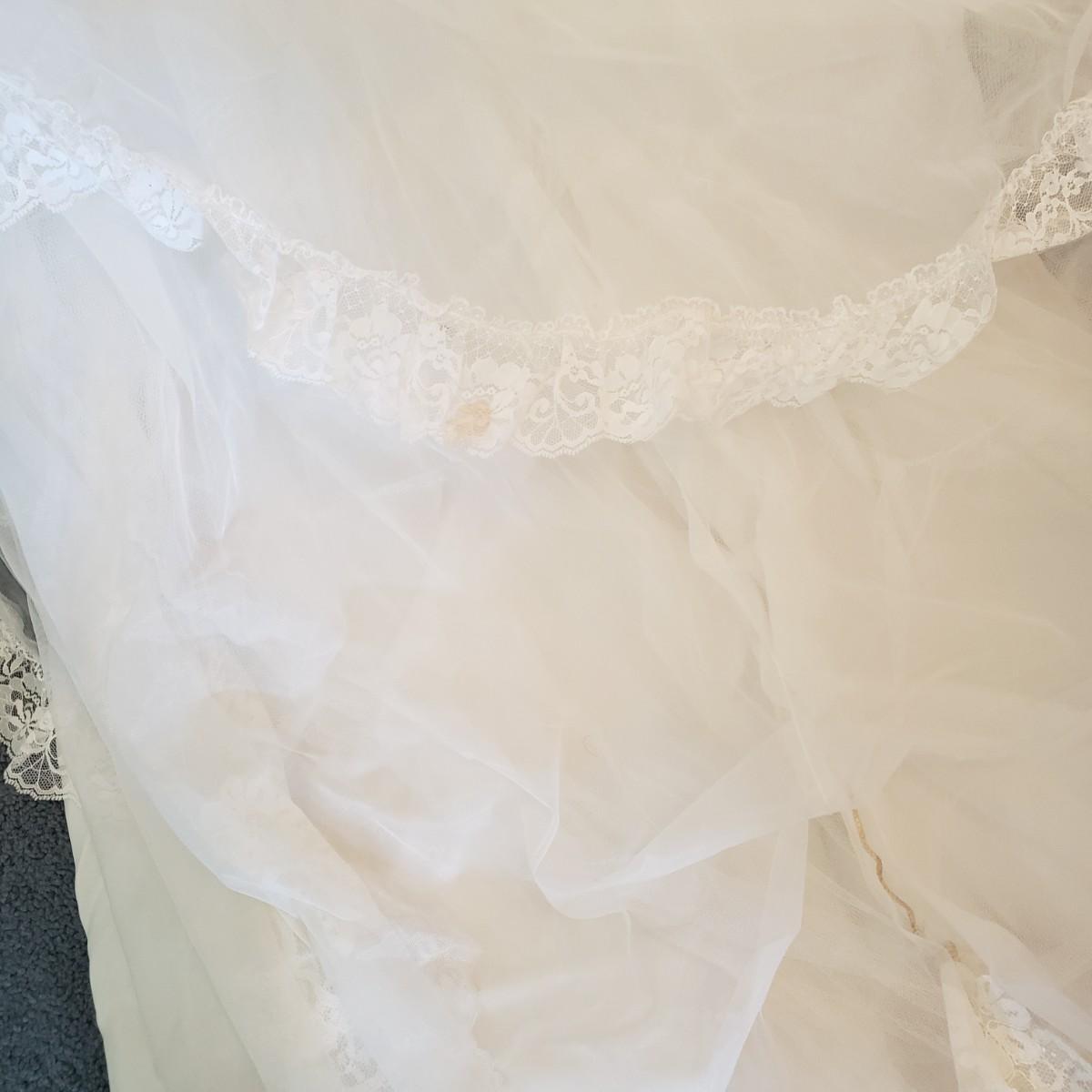 LOT 107: Vintage 1970s/80s Wedding Dress with Lace Ruffle Train & Veil
