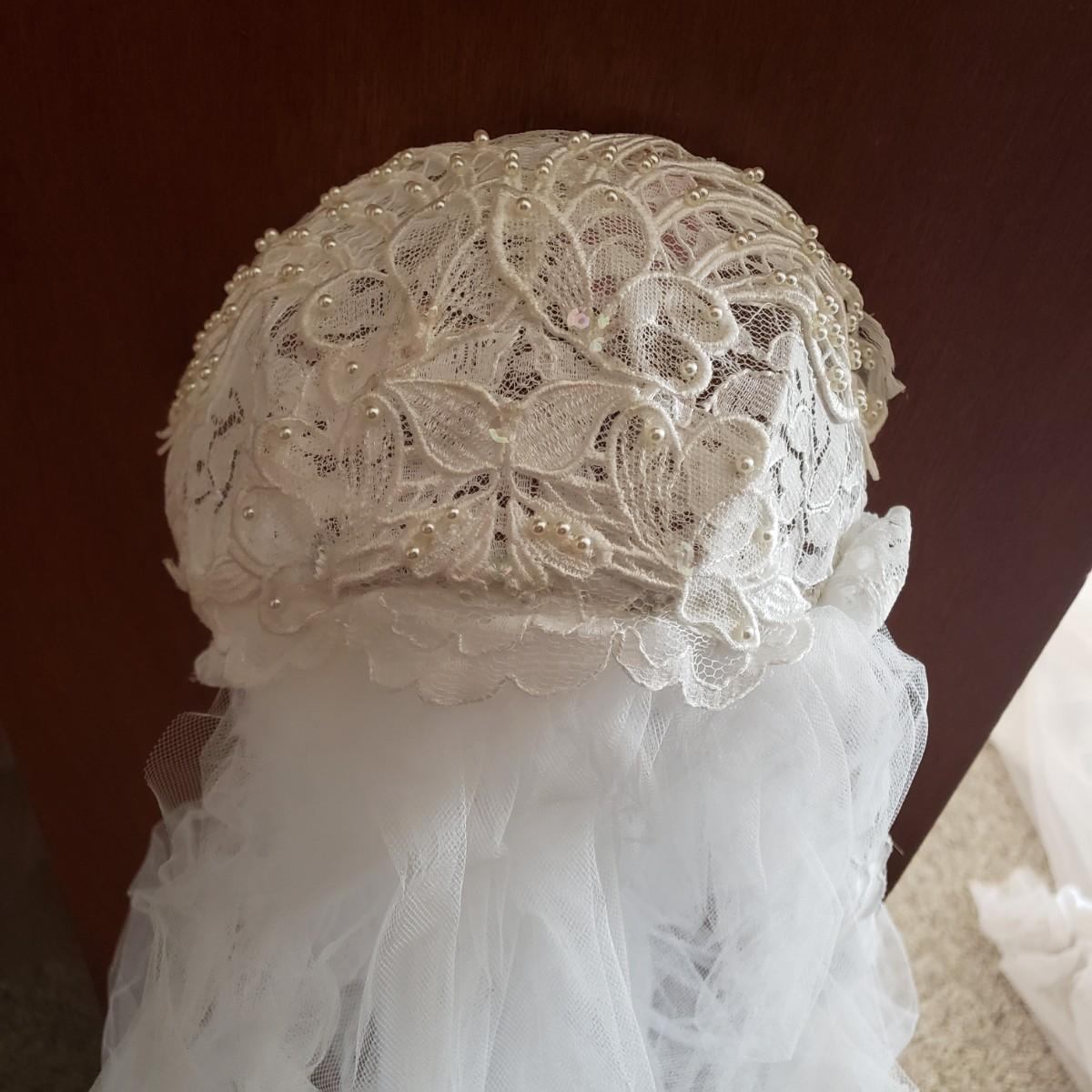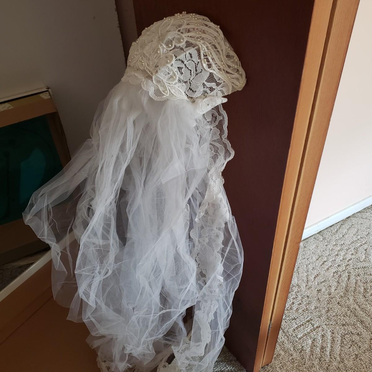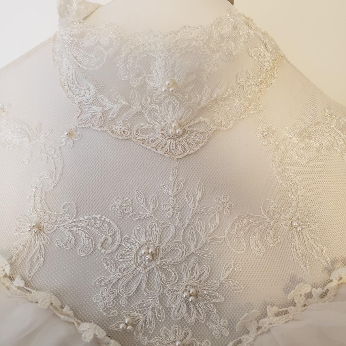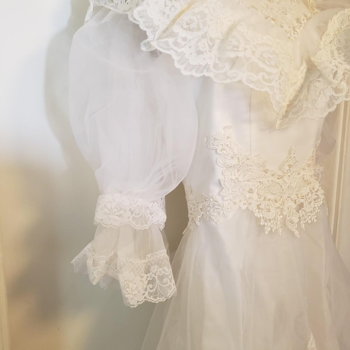 LOT 107: Vintage 1970s/80s Wedding Dress with Lace Ruffle Train & Veil