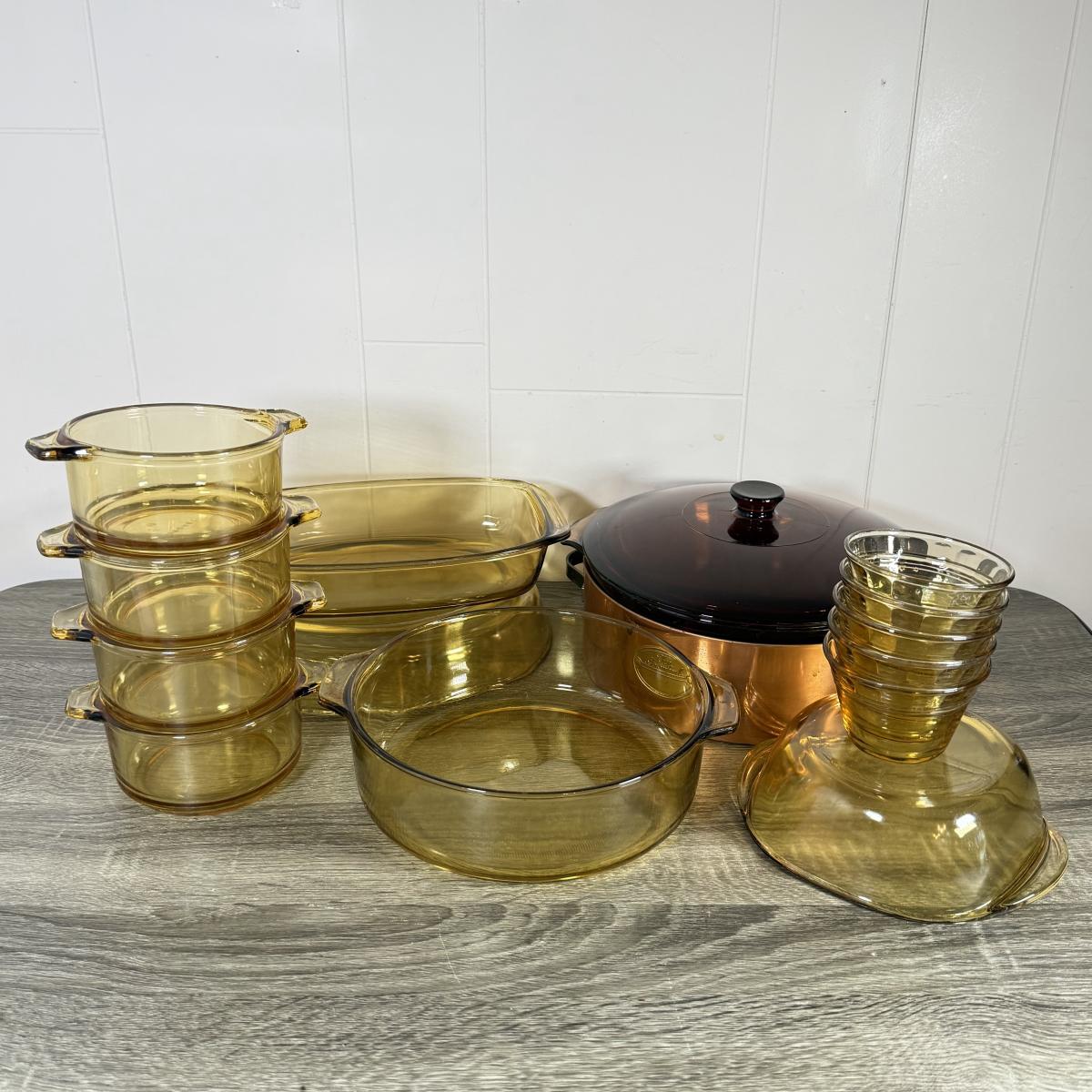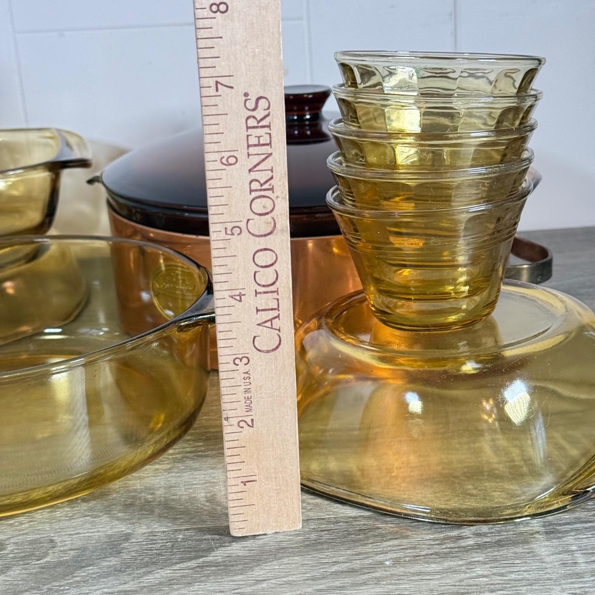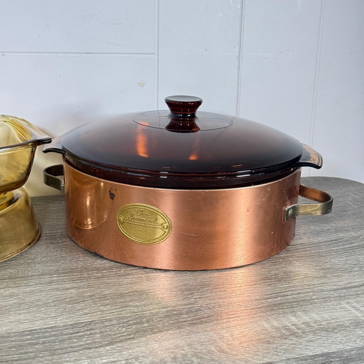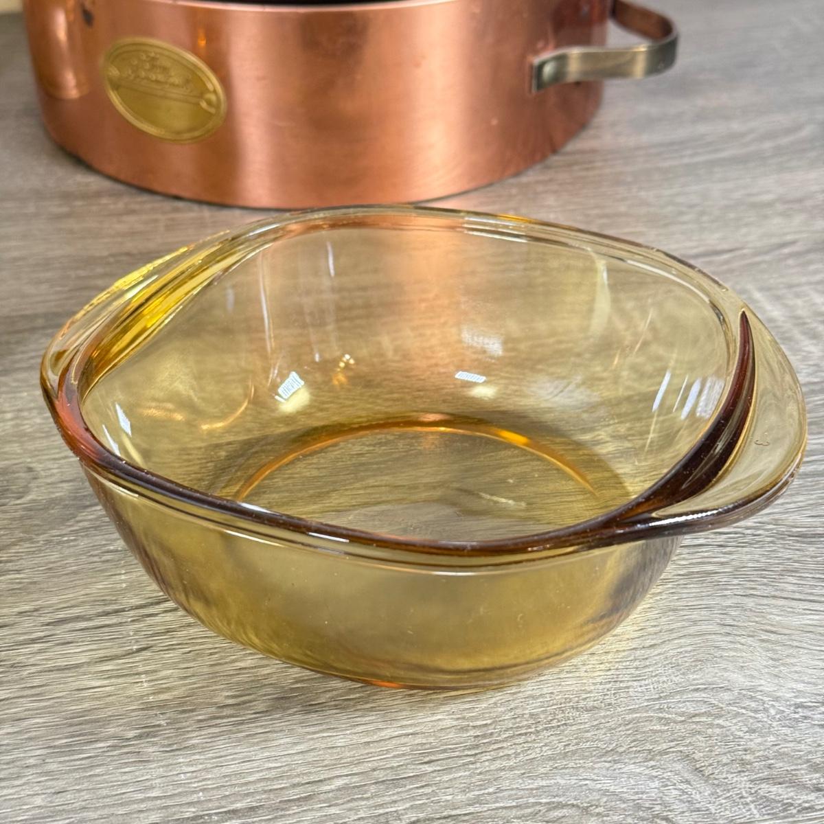 LOT 109K: Vaseline Yellow Pyrodry Glass Baking Dishes & Gregorian Copper Dish Holder