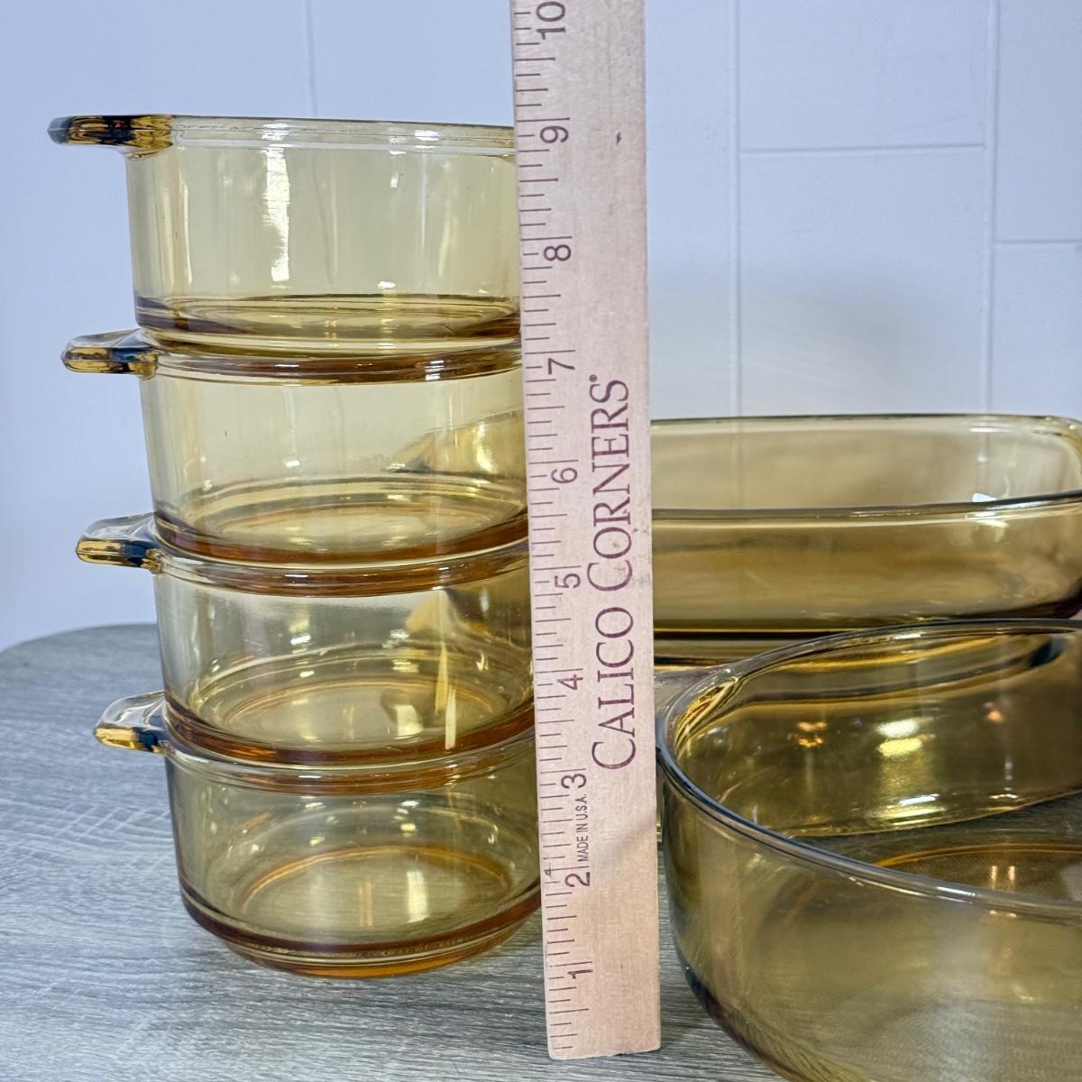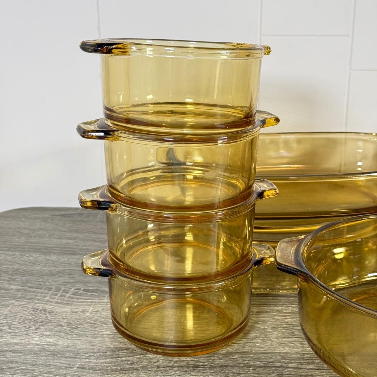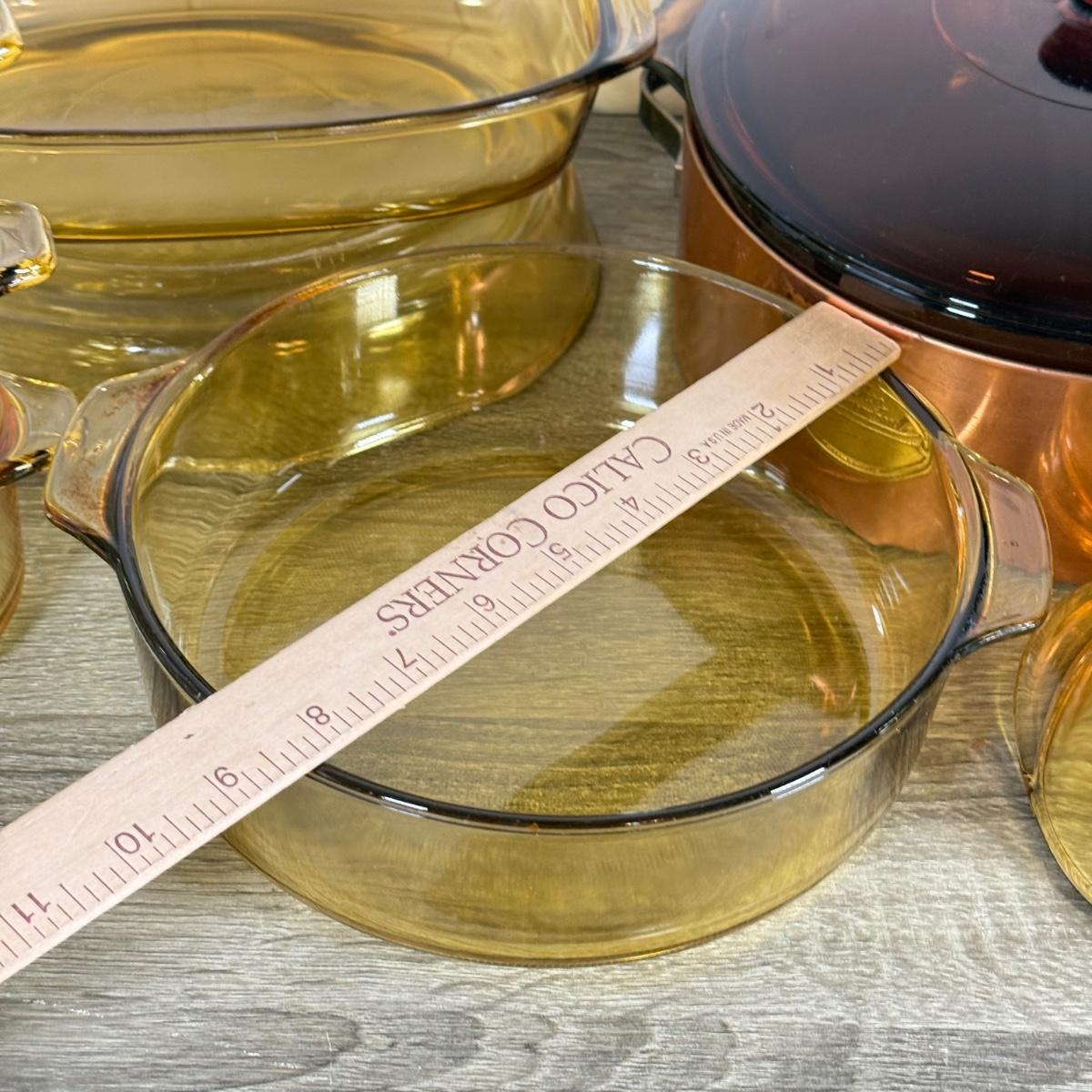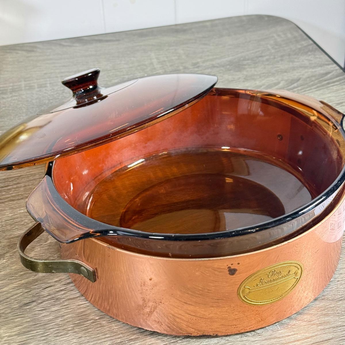 LOT 109K: Vaseline Yellow Pyrodry Glass Baking Dishes & Gregorian Copper Dish Holder