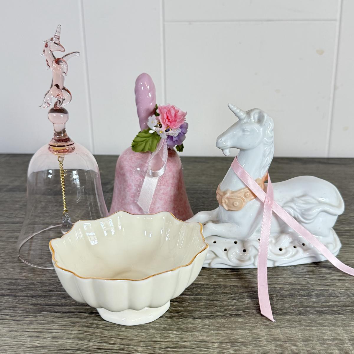 LOT 122K: Spring Pastel Collection: Avon Bell, Unicorn Glass Bell, 1981 Tapestry Collection Unicorn & More
