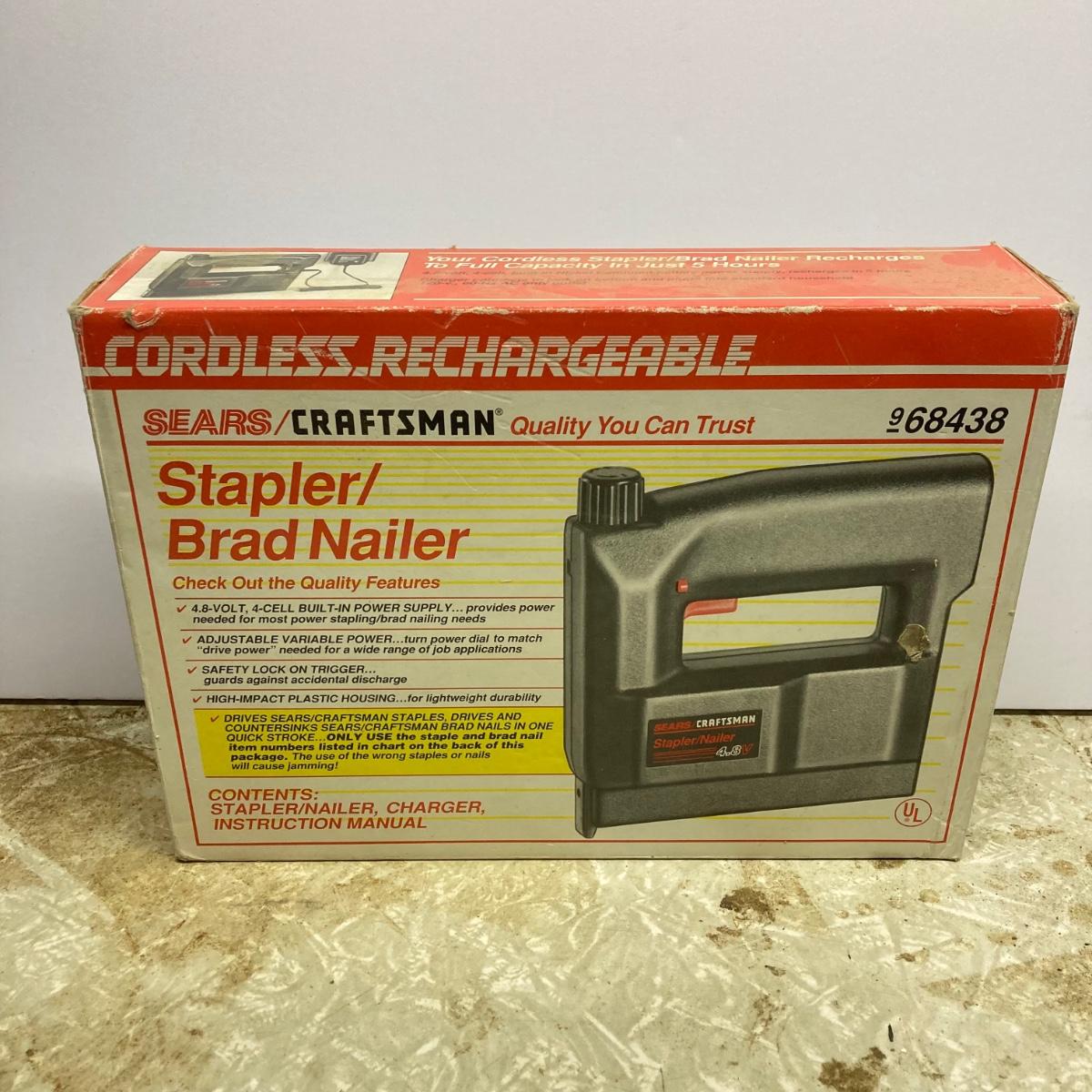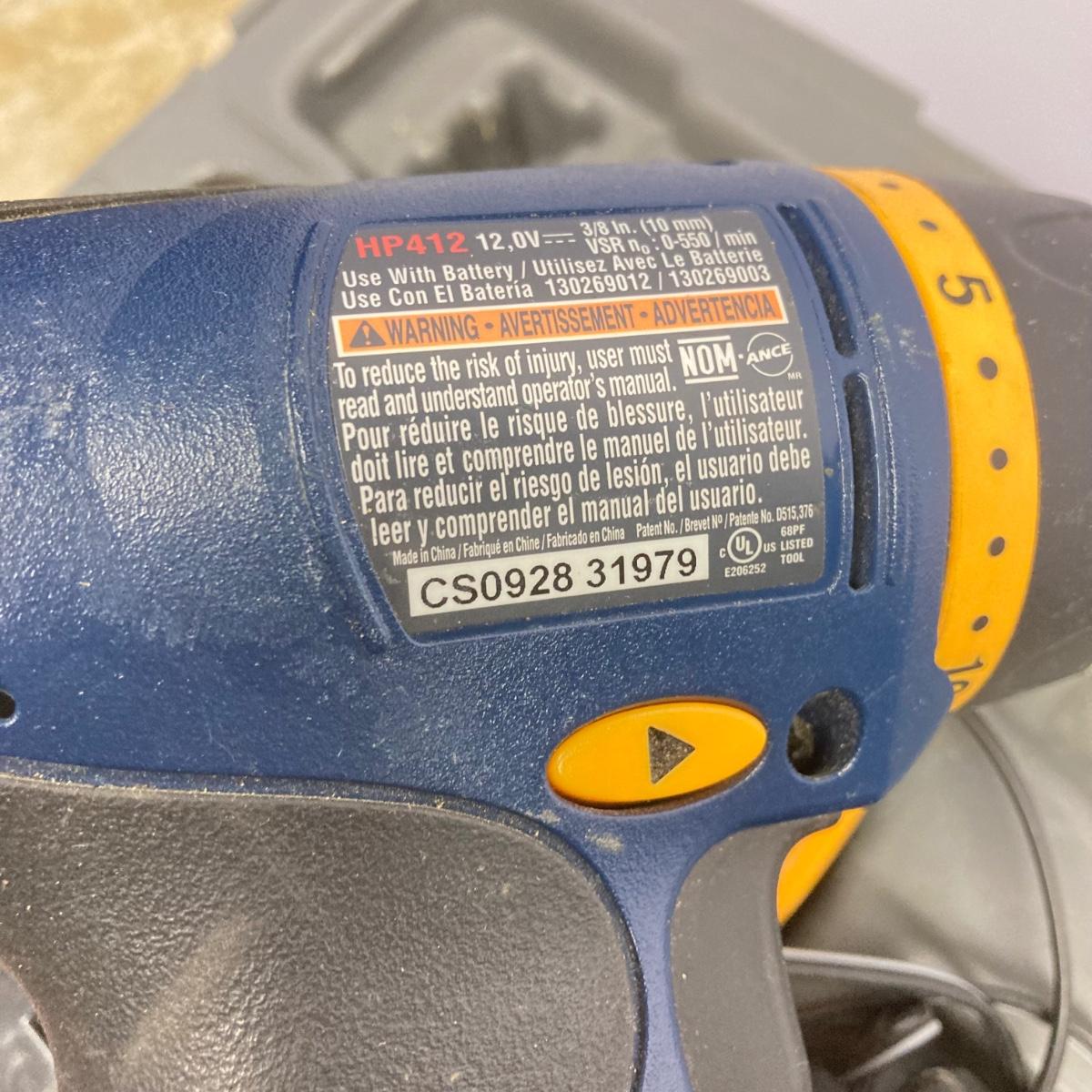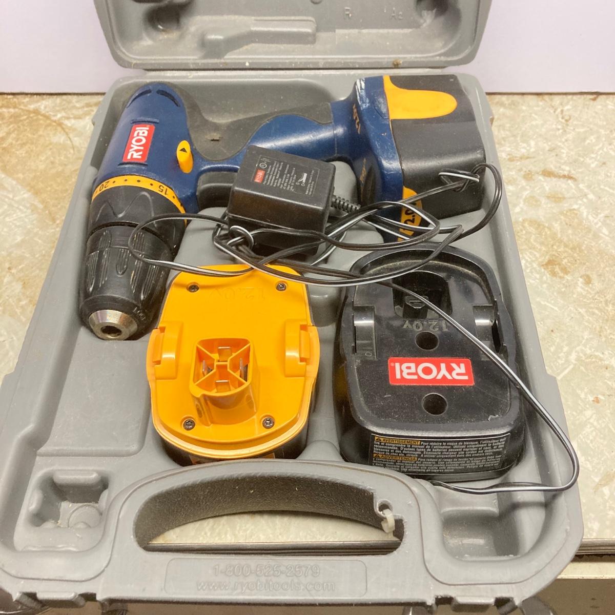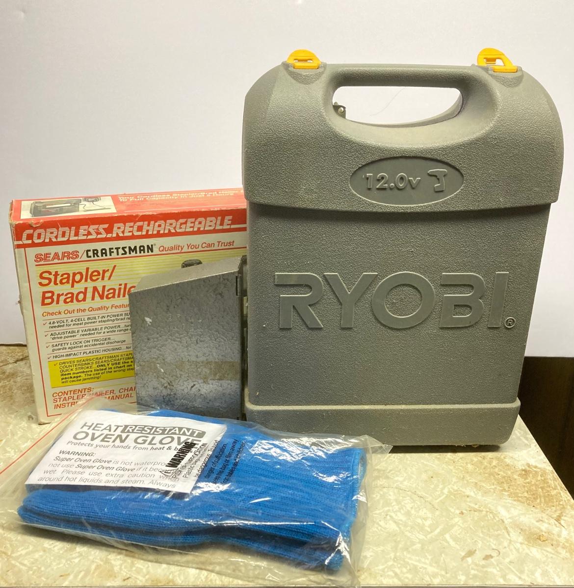 LOT 171G: Ryobi 12.0v HP412 Battery Operated Drill with Batteries and Chargers, Sears Craftsman Cordless Rechargeable Stapler Brad Nailer in Original Box and Heat Gloves