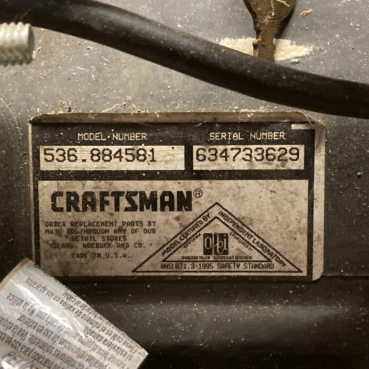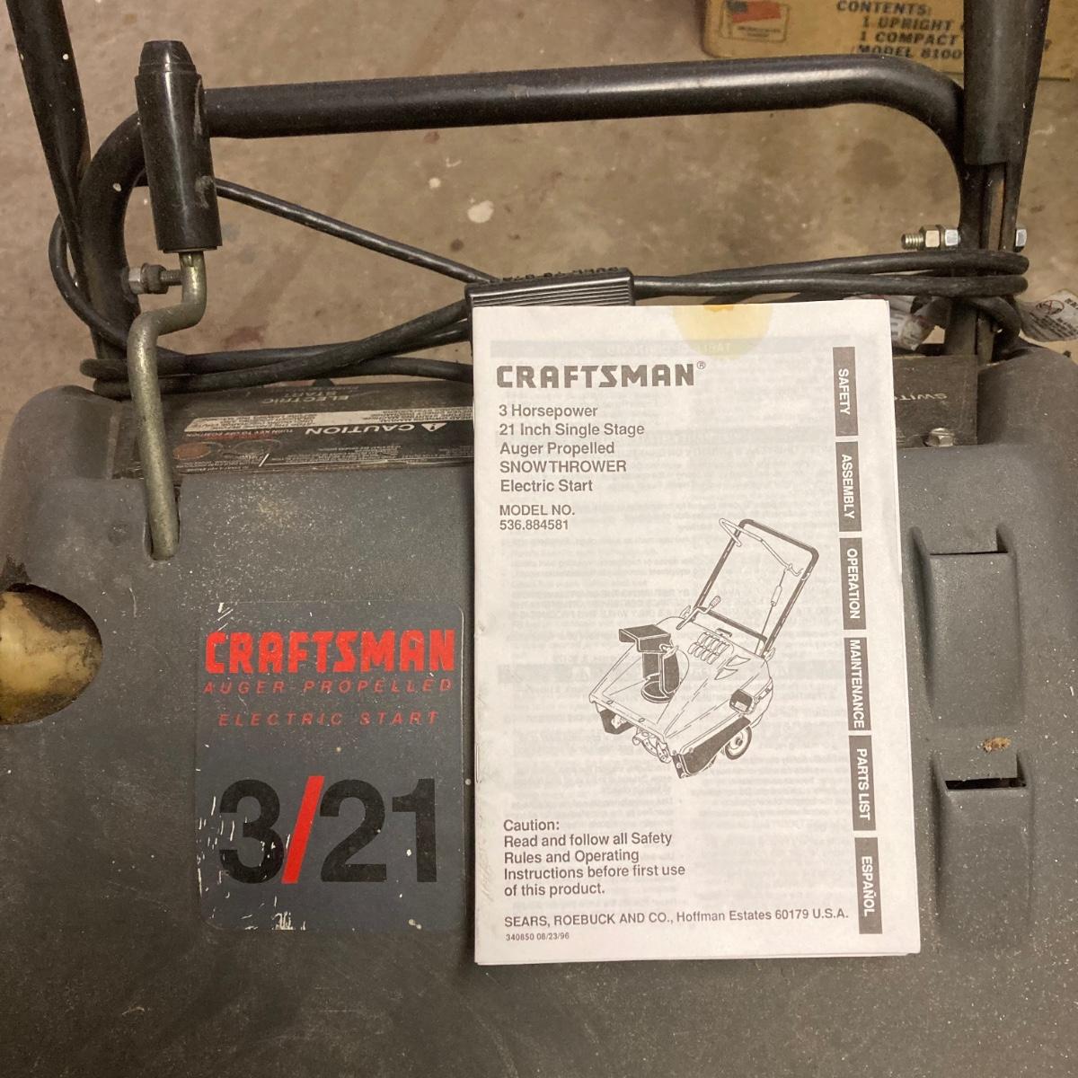 LOT 172G: Craftsman Model Number 536.884581 3/21 3 Horsepower 21 Inch Snow Blower