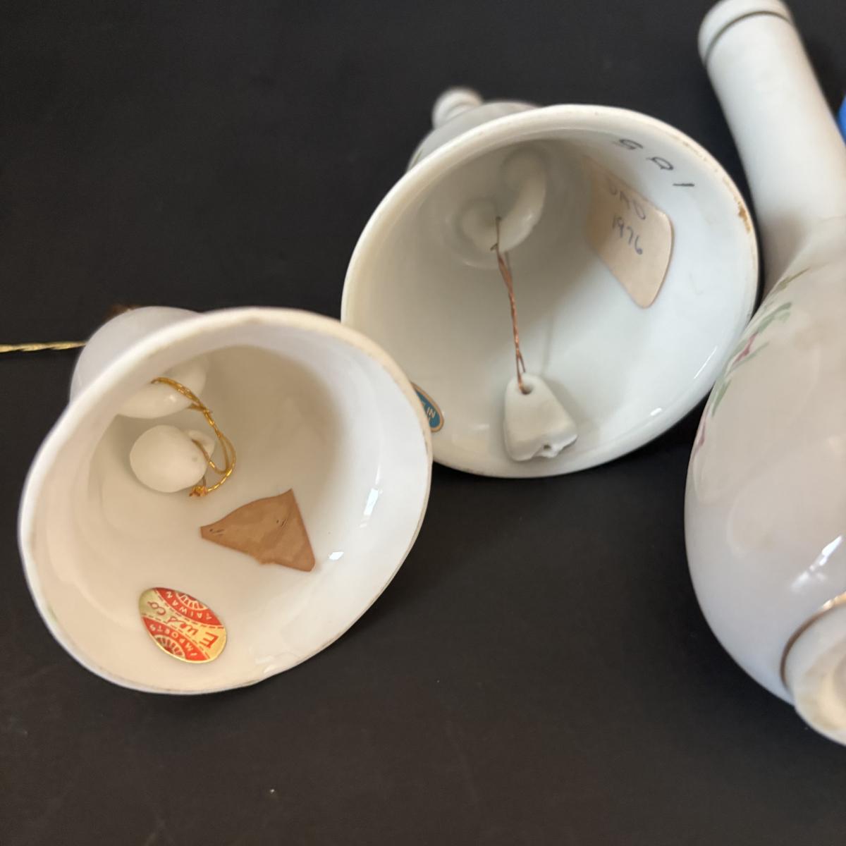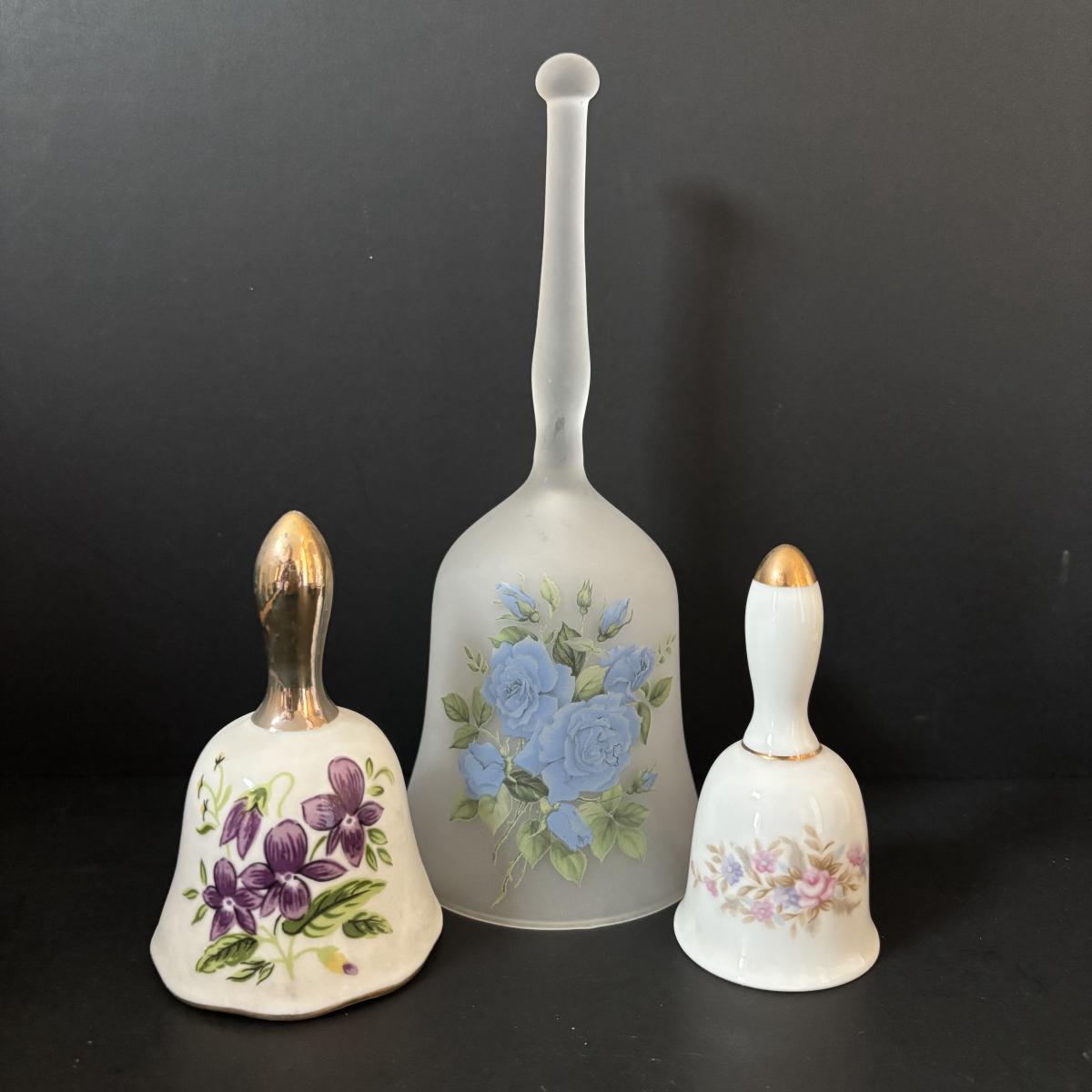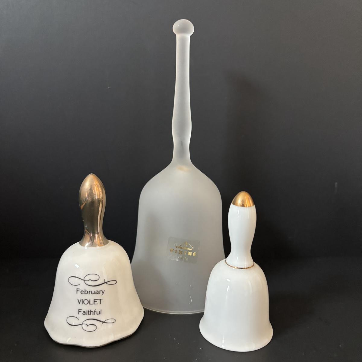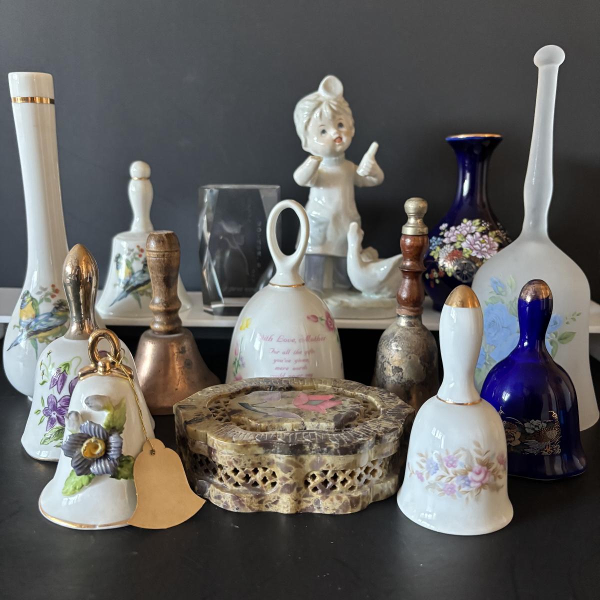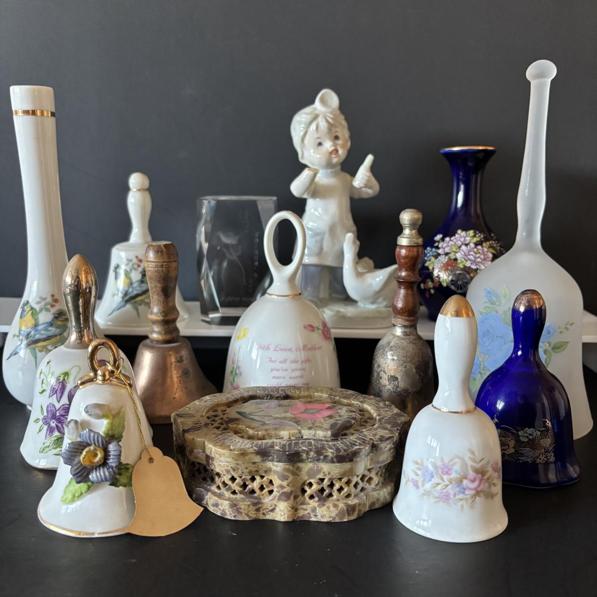 LOT 185: Vintage Porcelain Bells, Frosted Floral Viking Glass Bell, Soap Stone Trinket Dish w/Inlaid Floral Motif & More