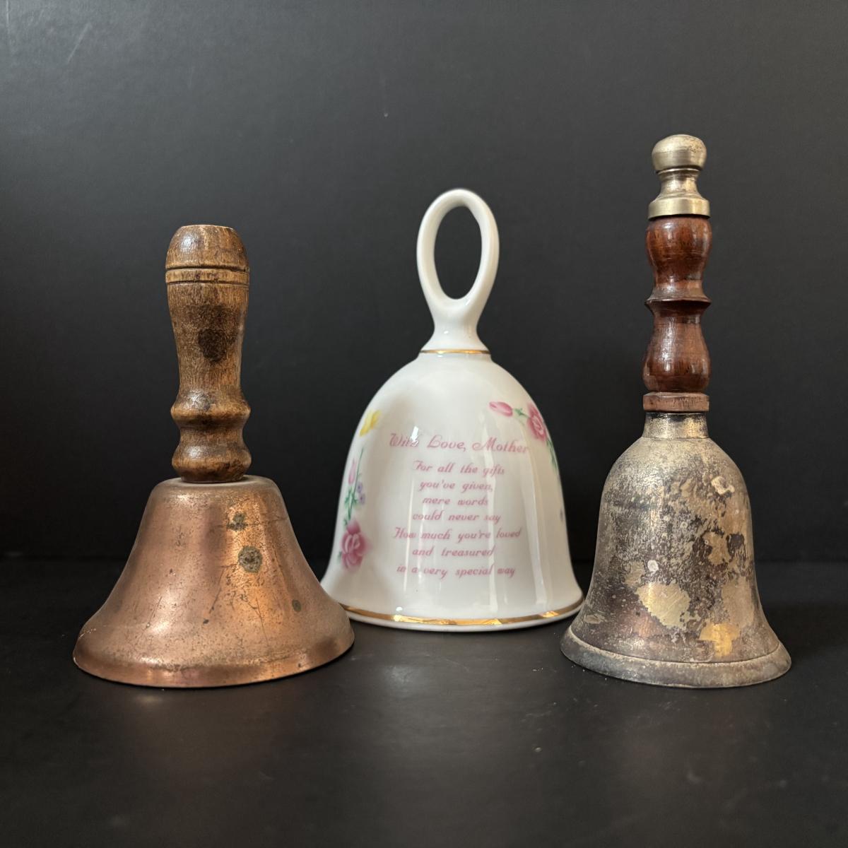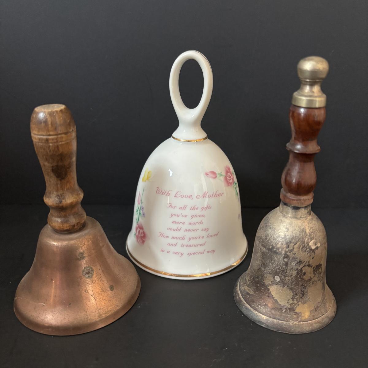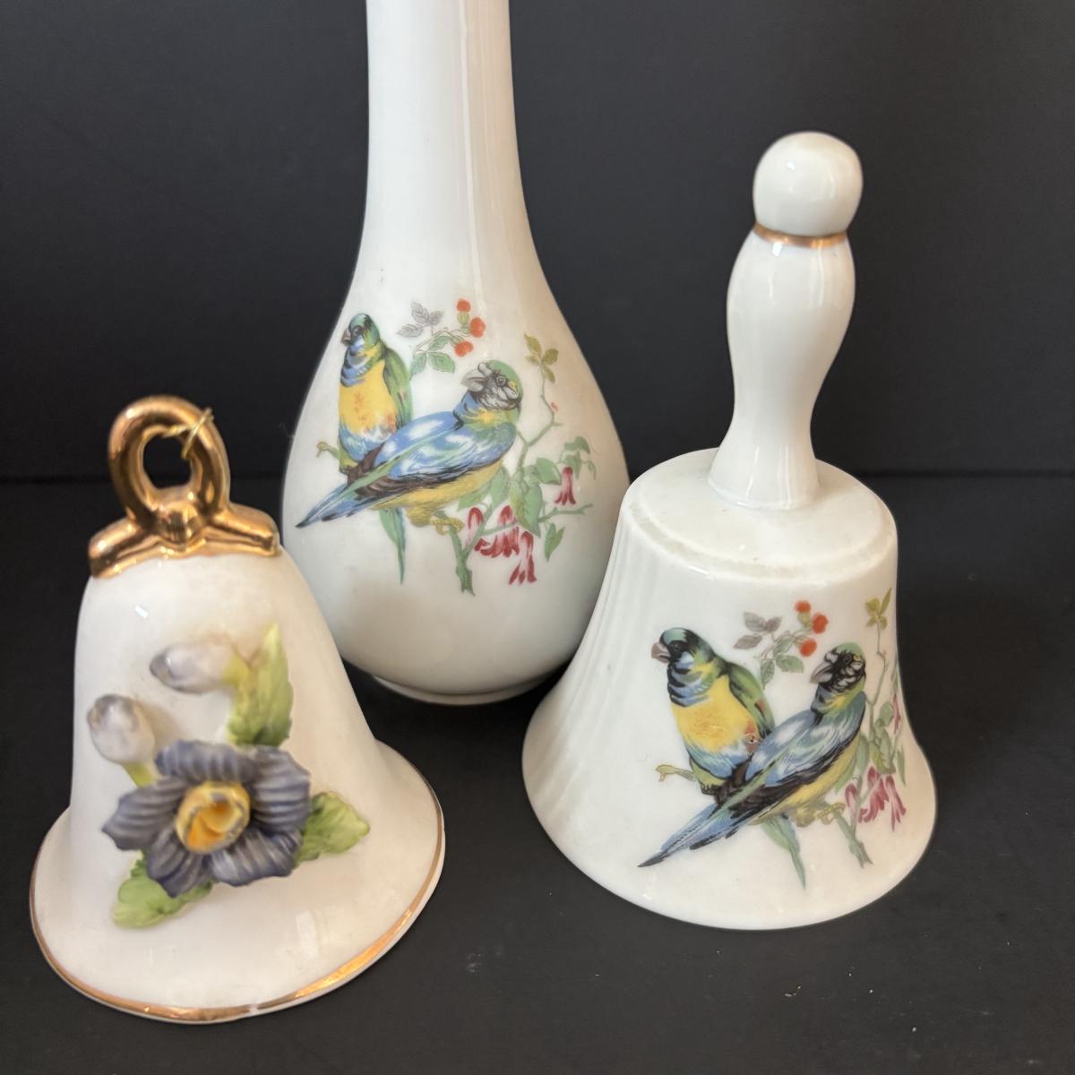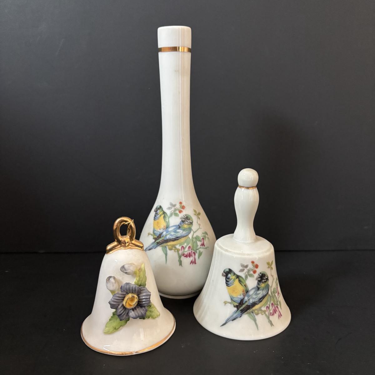 LOT 185: Vintage Porcelain Bells, Frosted Floral Viking Glass Bell, Soap Stone Trinket Dish w/Inlaid Floral Motif & More