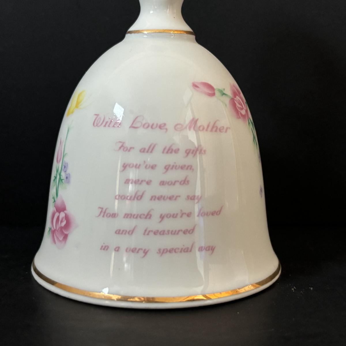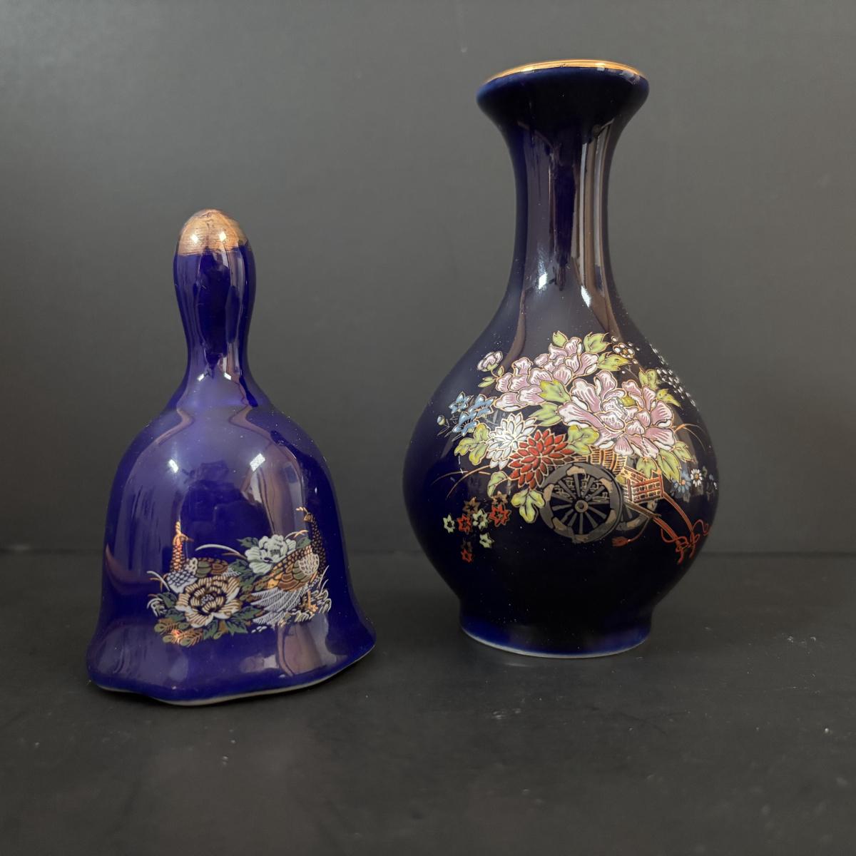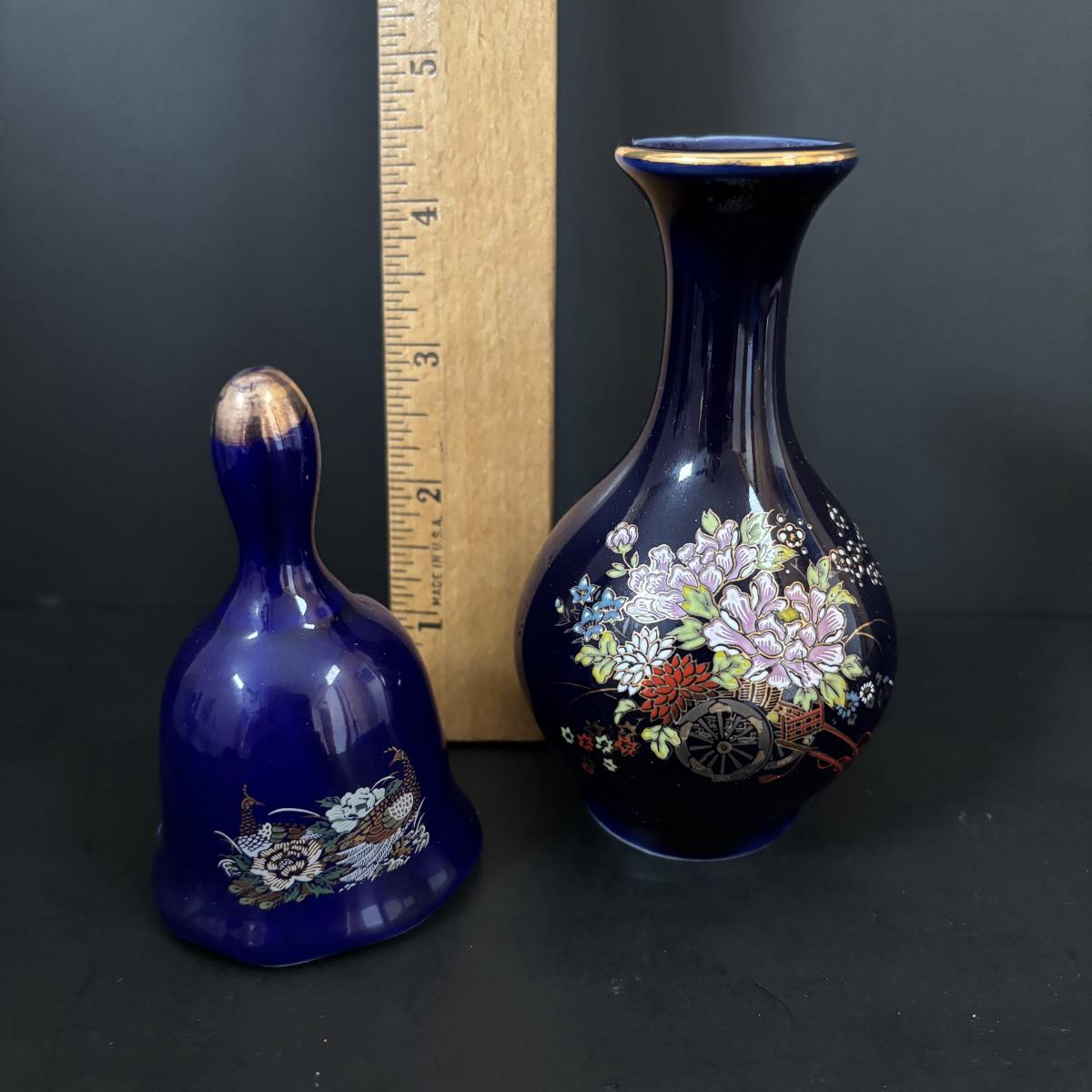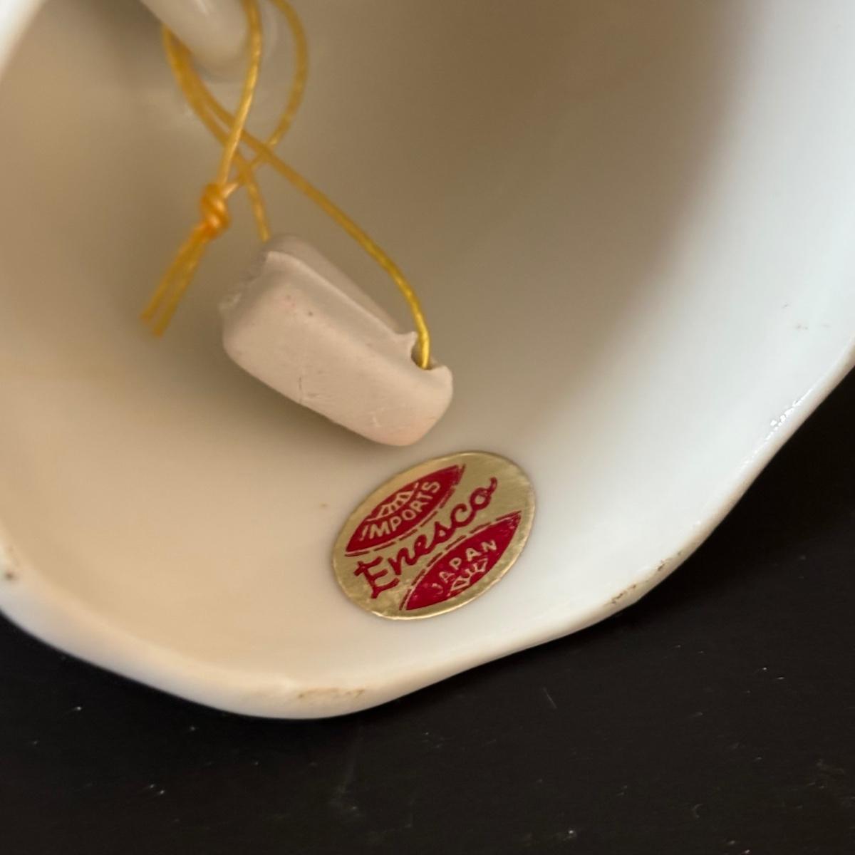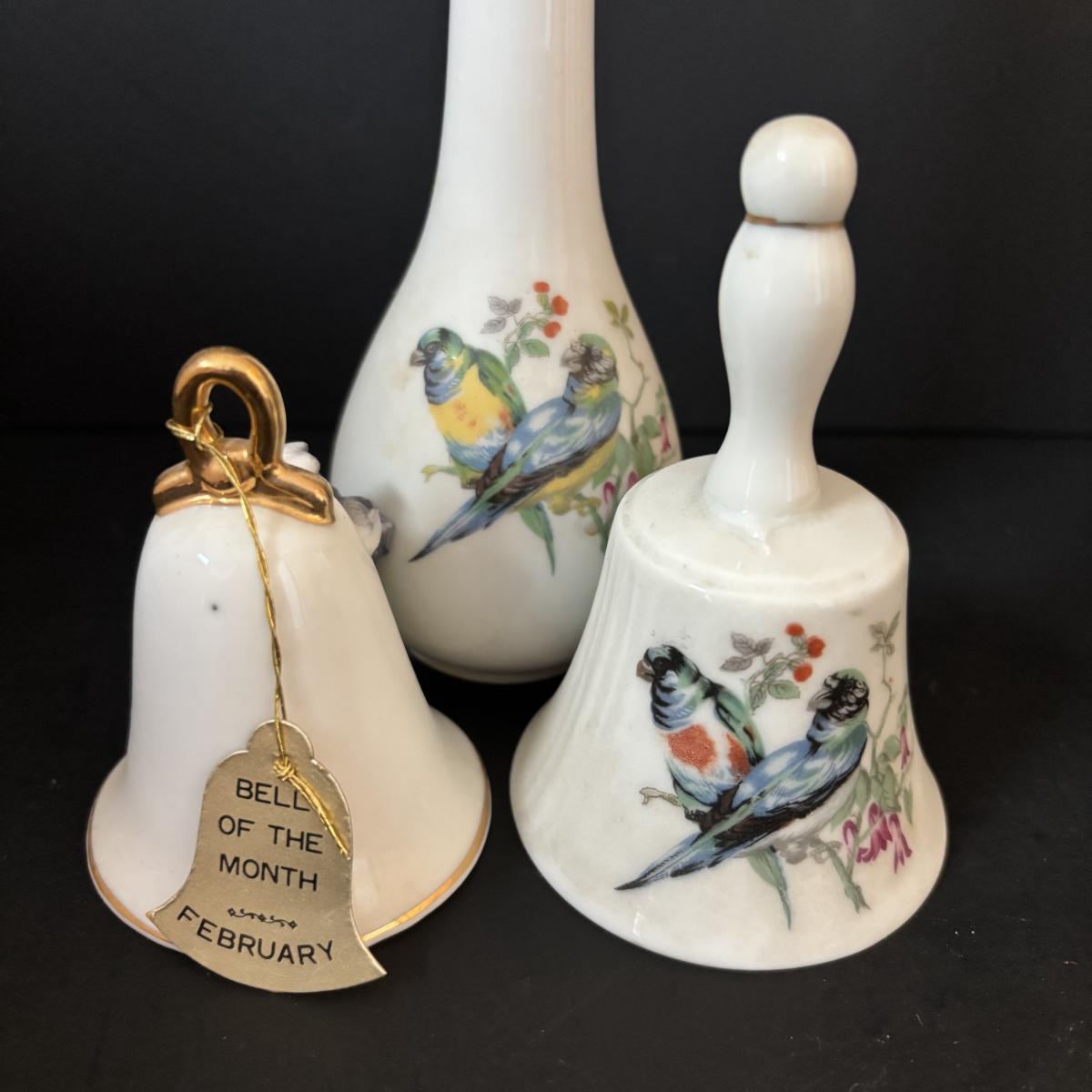 LOT 185: Vintage Porcelain Bells, Frosted Floral Viking Glass Bell, Soap Stone Trinket Dish w/Inlaid Floral Motif & More