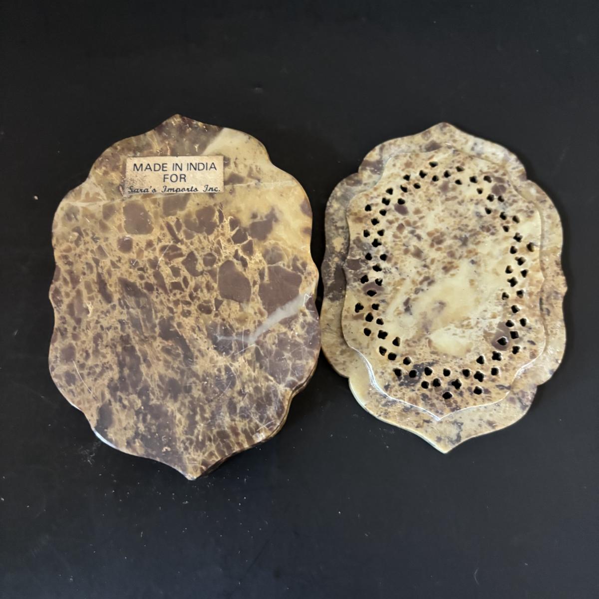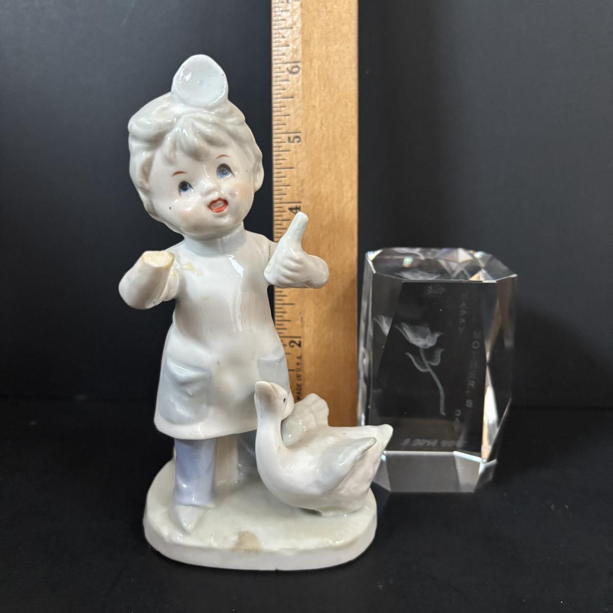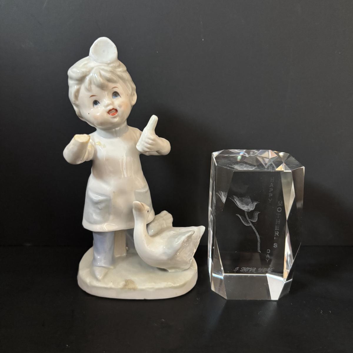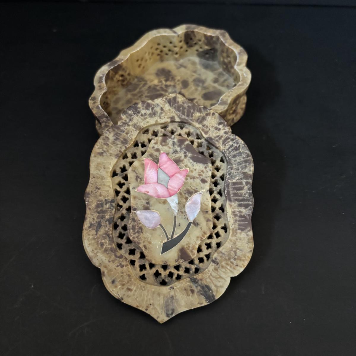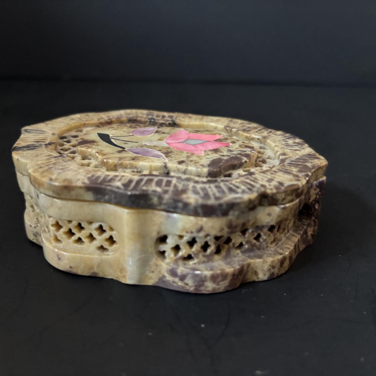 LOT 185: Vintage Porcelain Bells, Frosted Floral Viking Glass Bell, Soap Stone Trinket Dish w/Inlaid Floral Motif & More