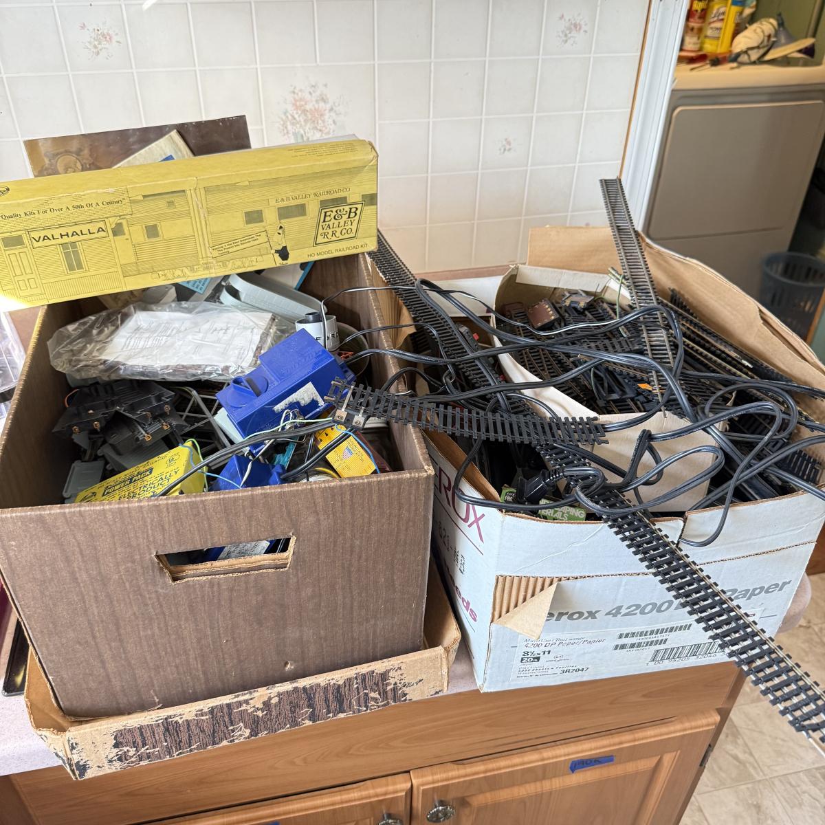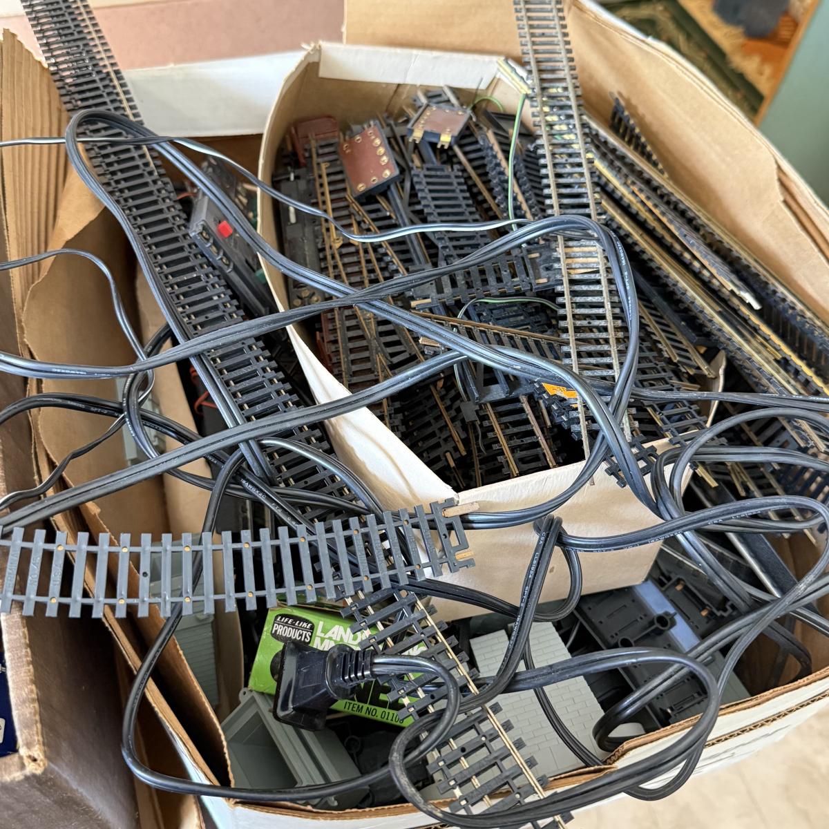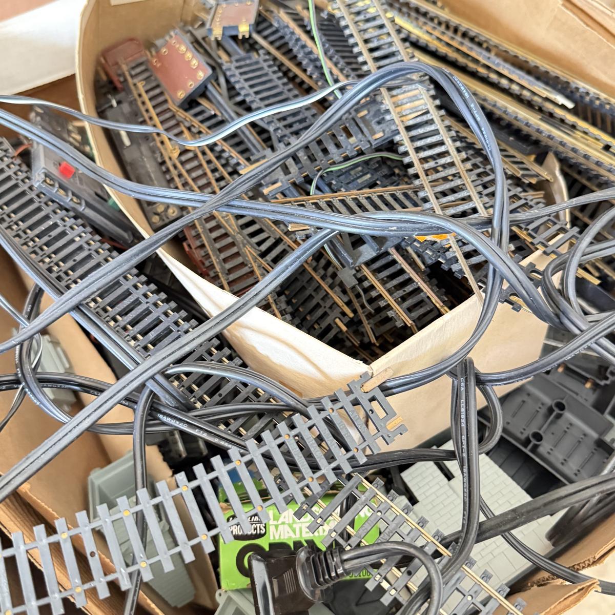 LOT 199K: 2 Boxes of Unsorted Train HO Scale Track, Transformers & More