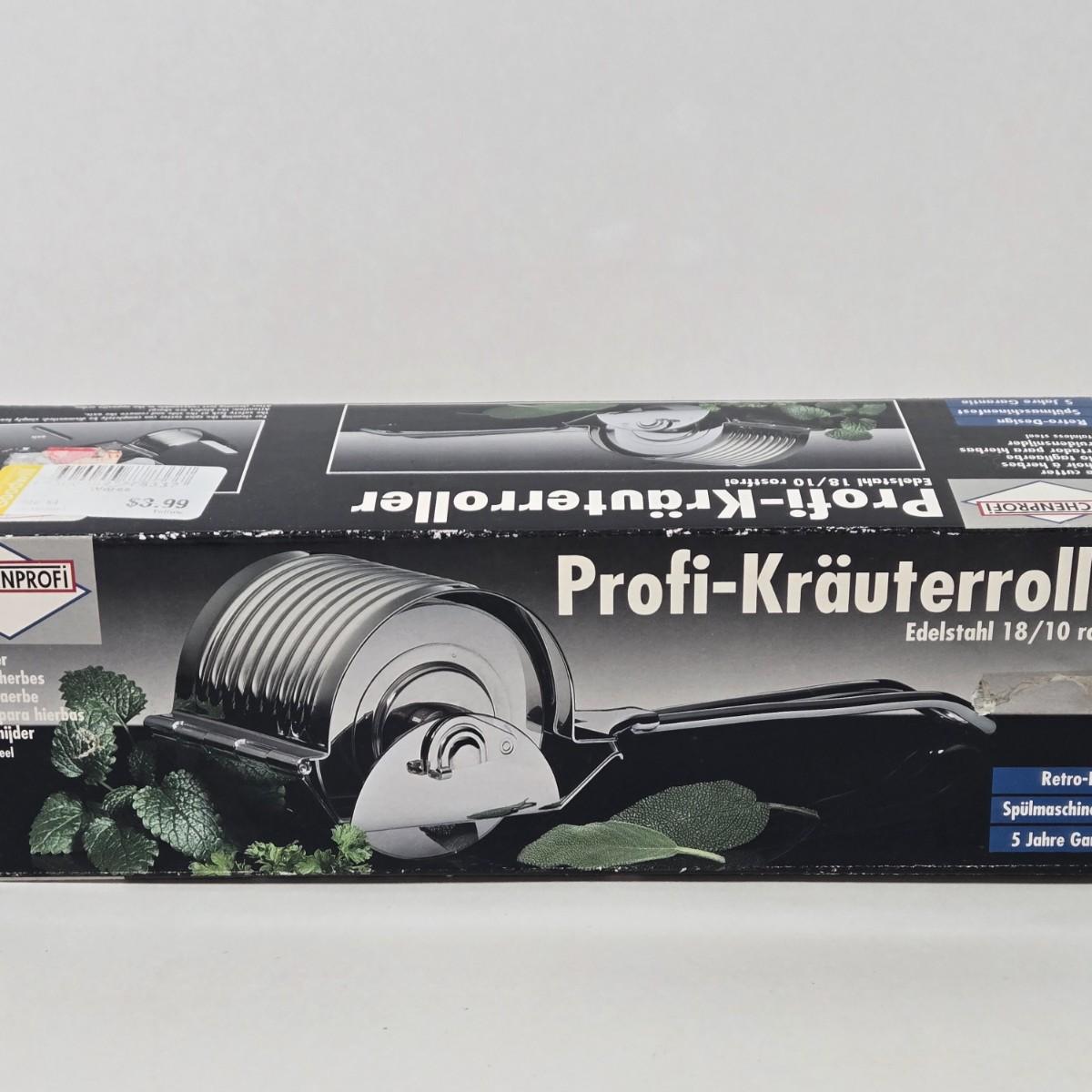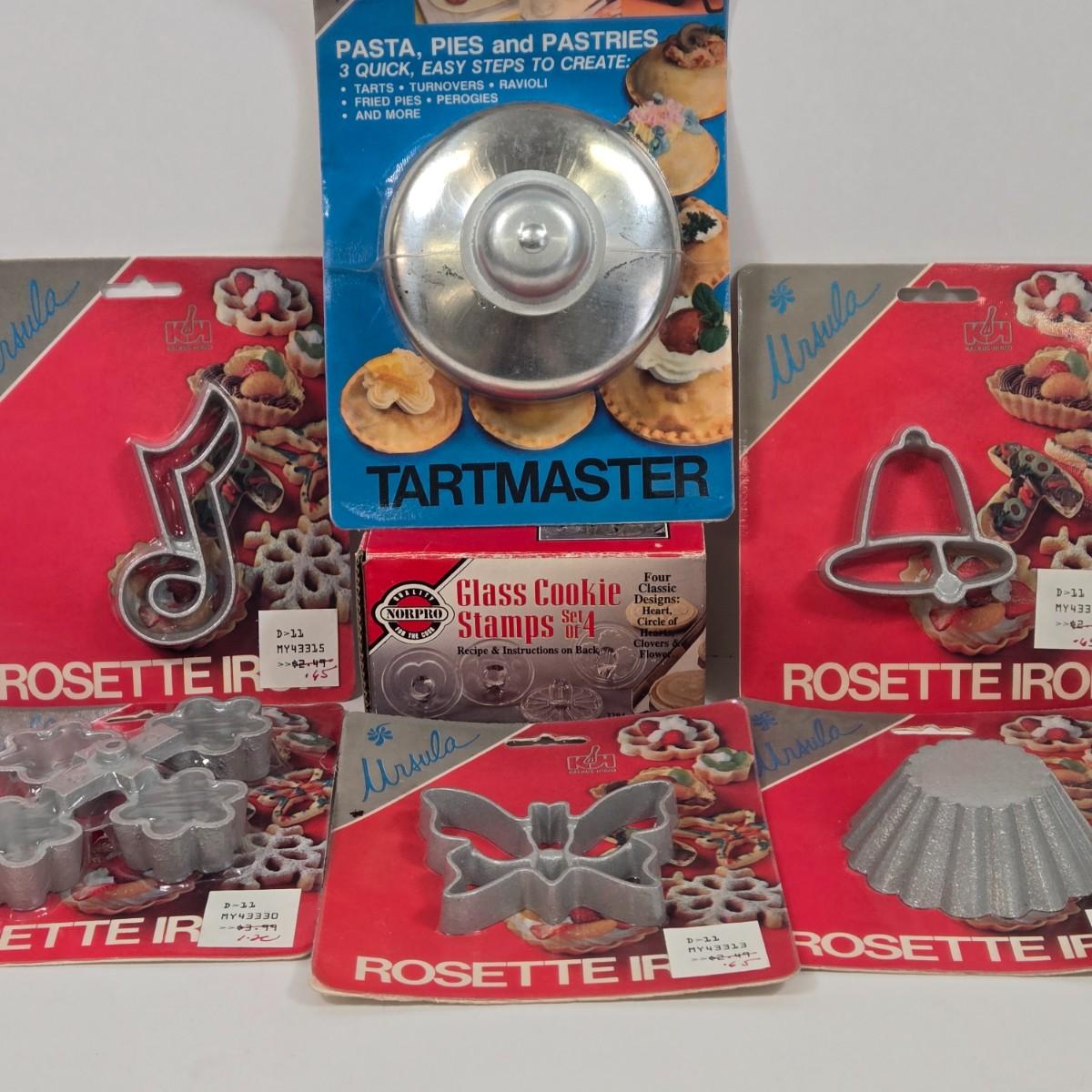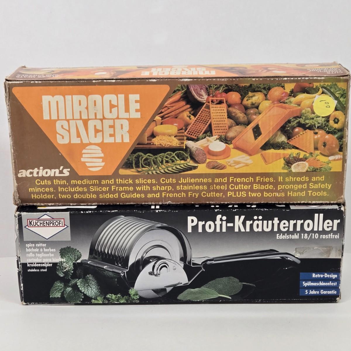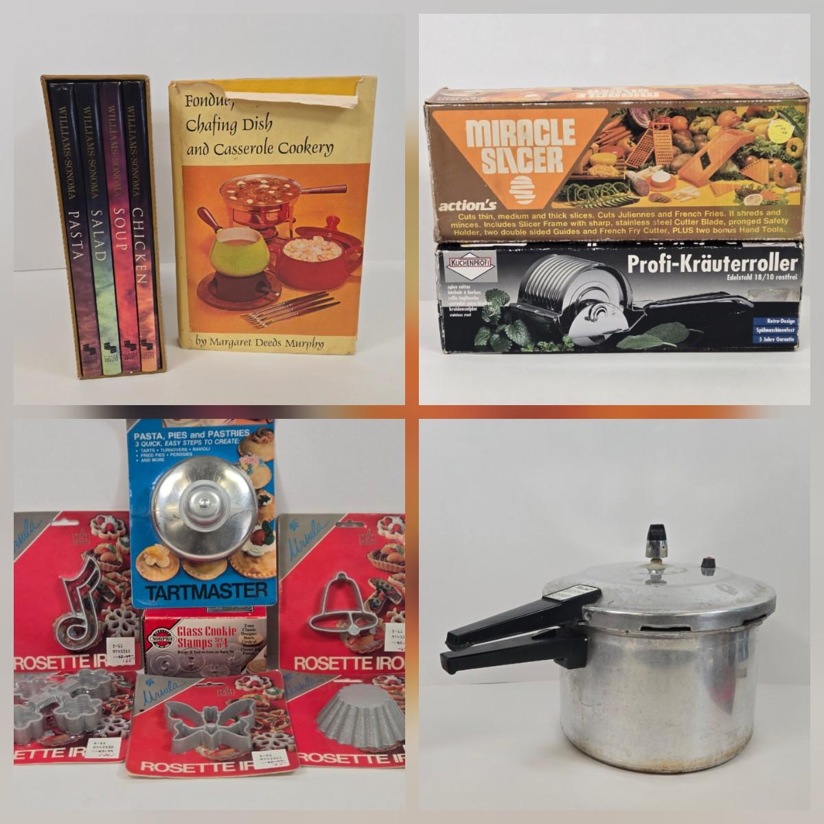 LOT 15: Cookbooks, Vintage 1984 Action’s MIRACLE SLICER, Küchenprofi Stainless Steel Herb Cutter, Ursula Rosette Irons & Tart Master, and Maitre’s Pressure Cooker