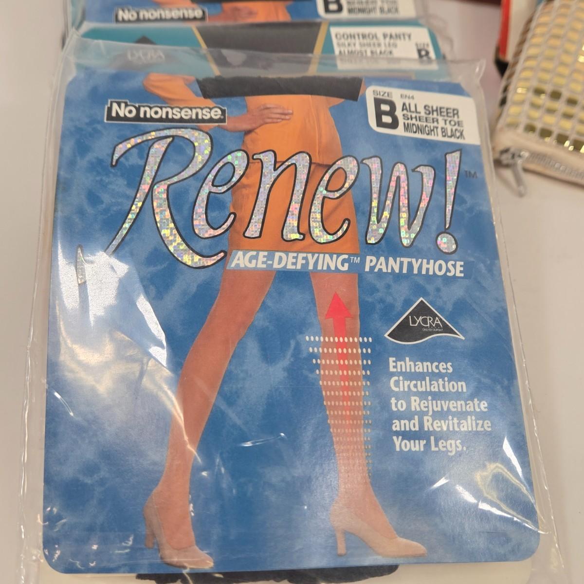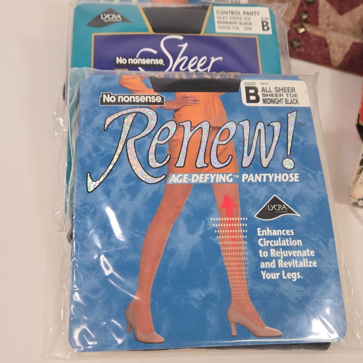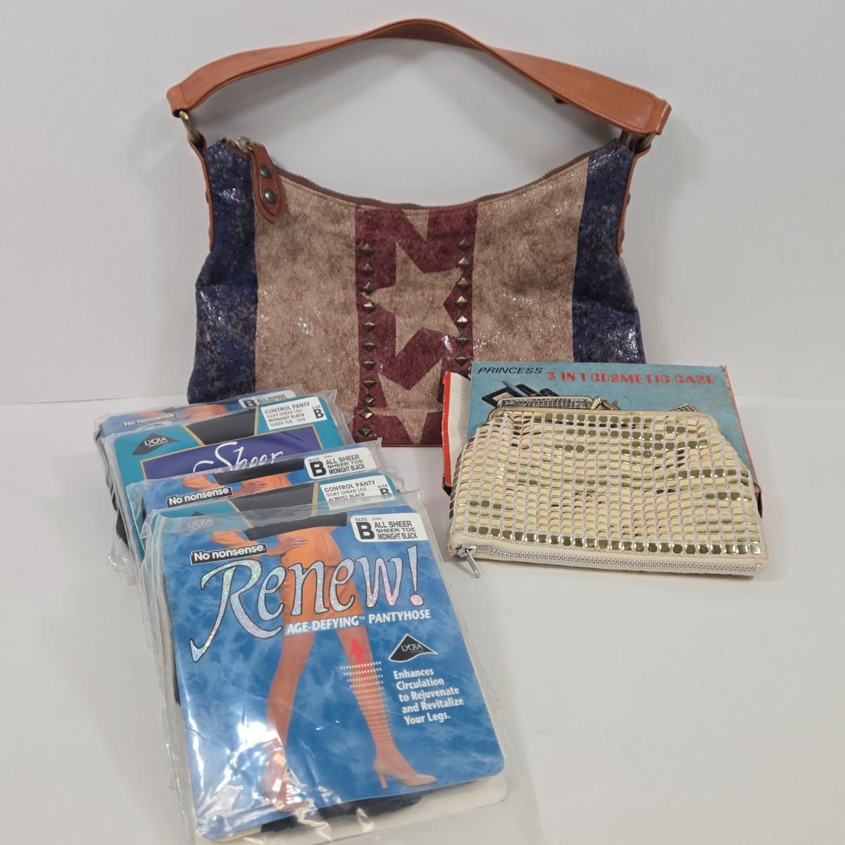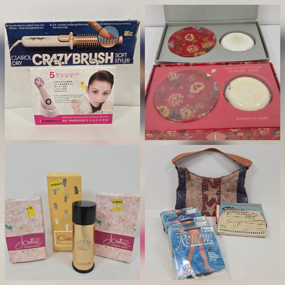 LOT 20: Clairol Crazy Brush Soft Styler, EMS & Electroporation Beauty Device, 2 Boxes of Luxury Soap, Vintage Perfume, Handbag, Princess 3 in 1 Cosmetic Case, and Multiple Pairs of Pantyhose