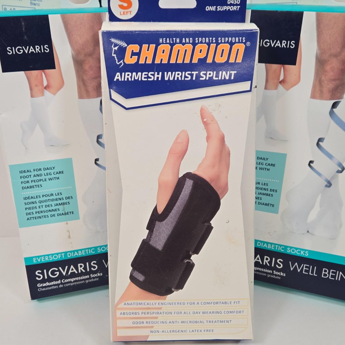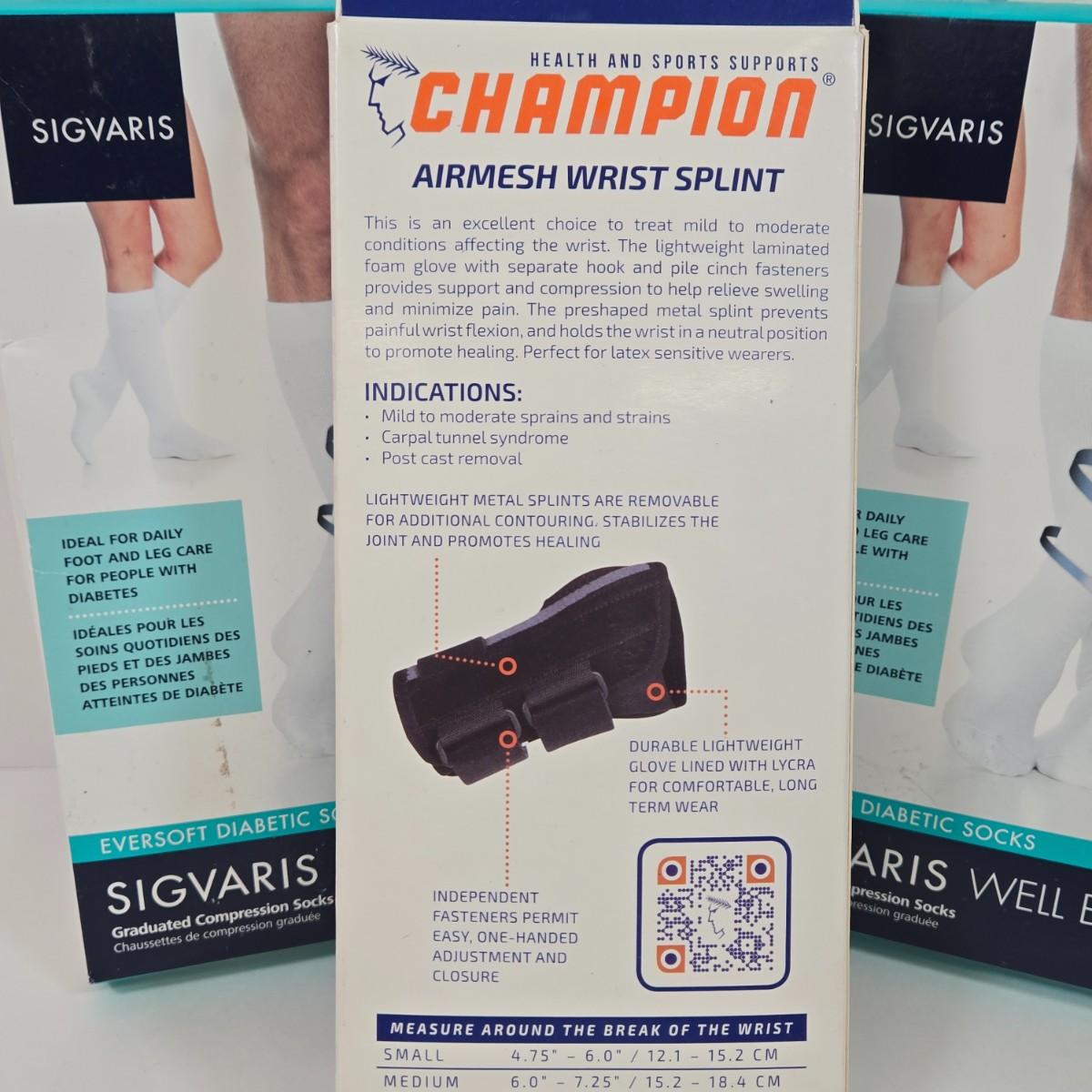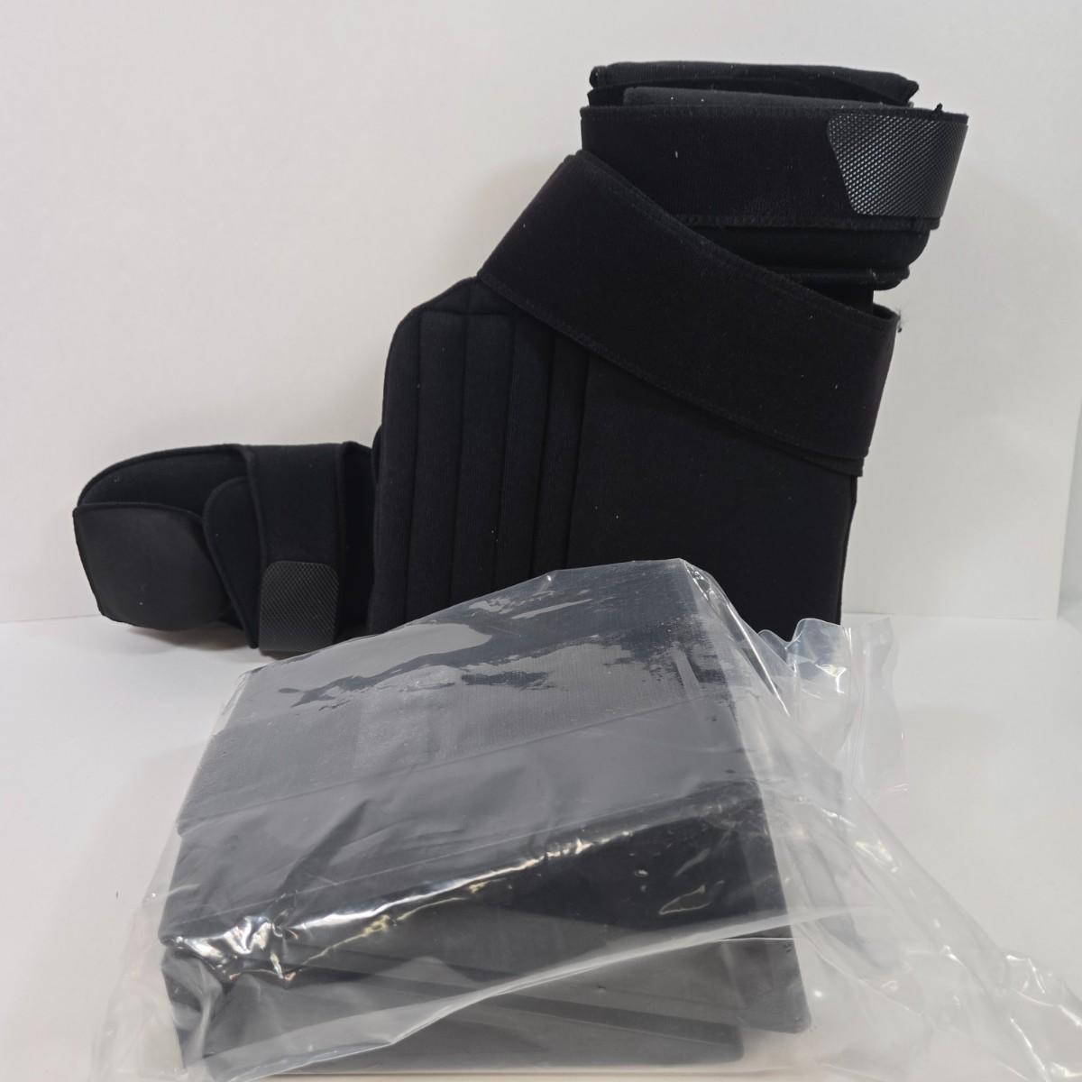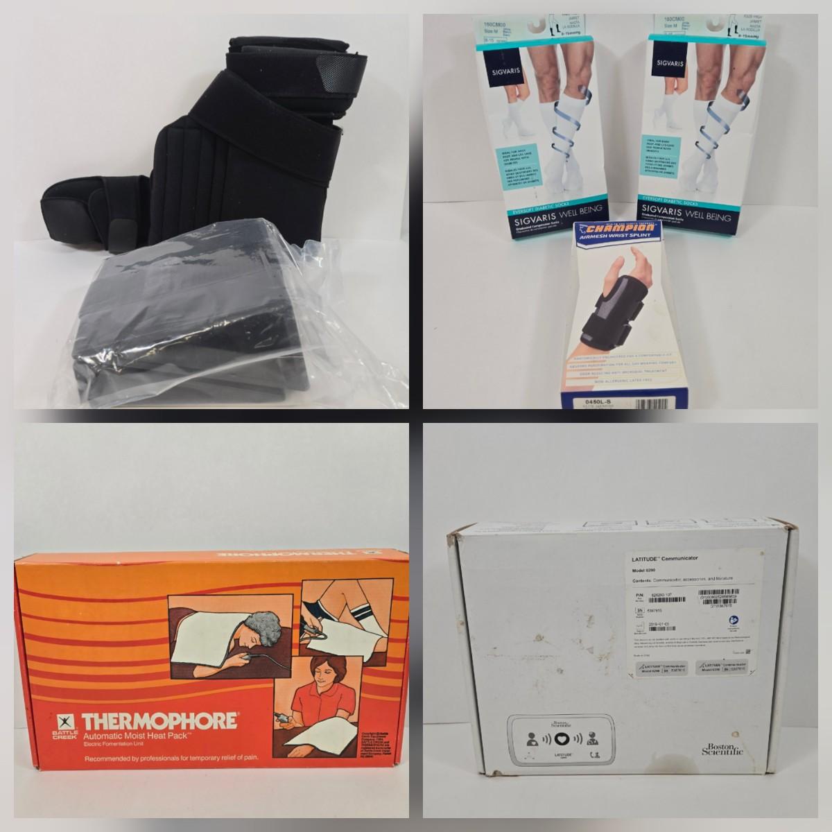 LOT 28: DR Medical Shoulder Abduction System, 2 Pairs of Sigvaris Diabetic Socks, Champion Airmesh Wrist Splint, Battle Creek Thermophore Automatic Moist Heating Heat Pad, and LATITUDE Communicator