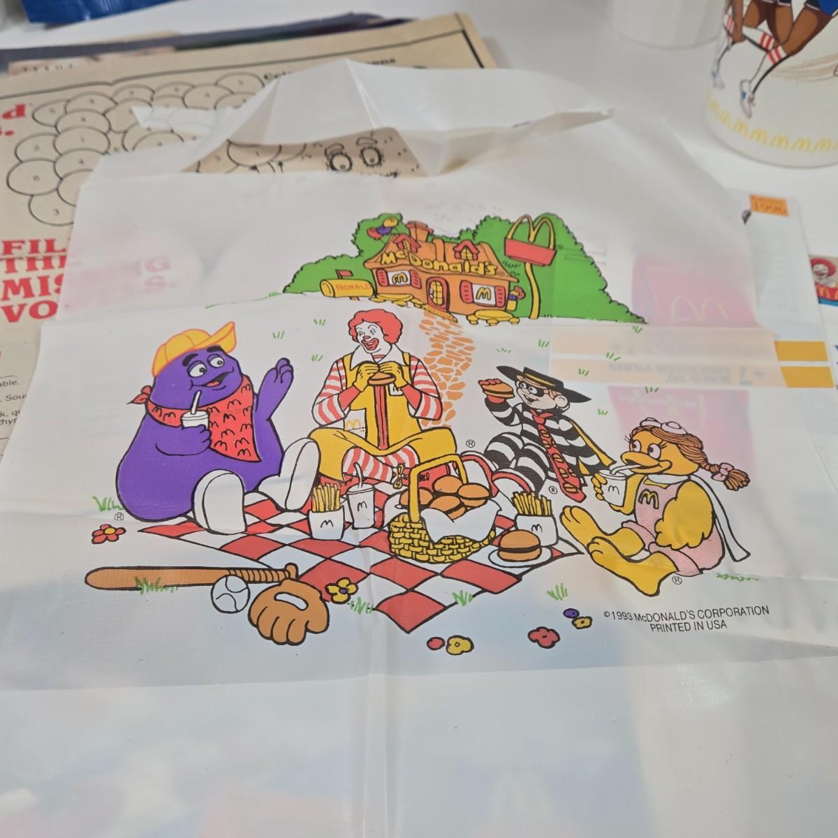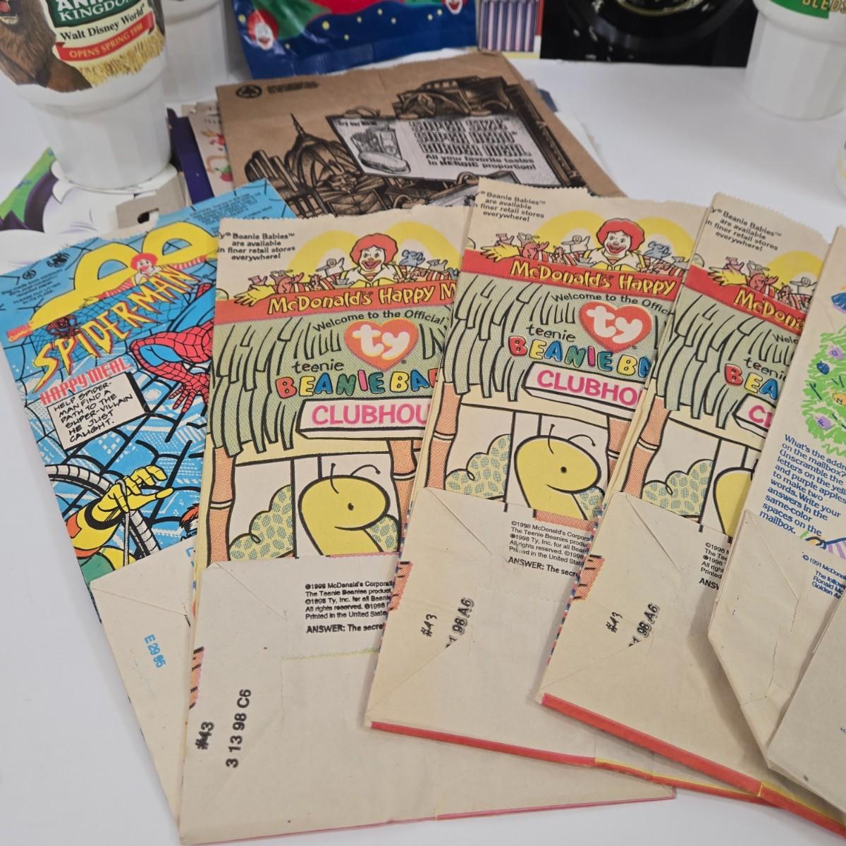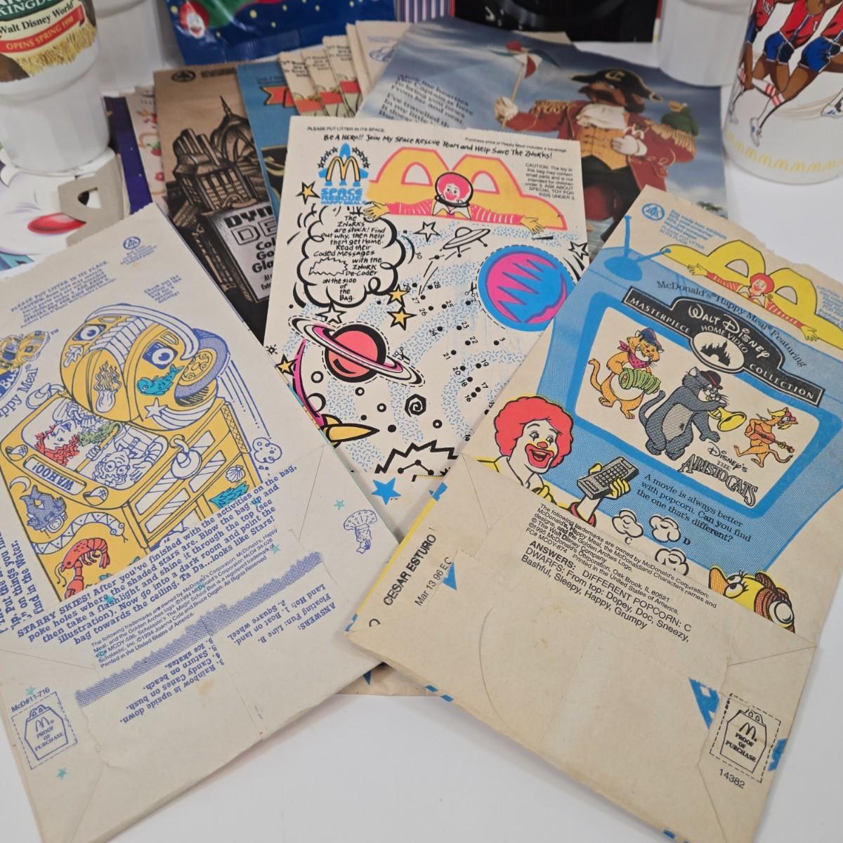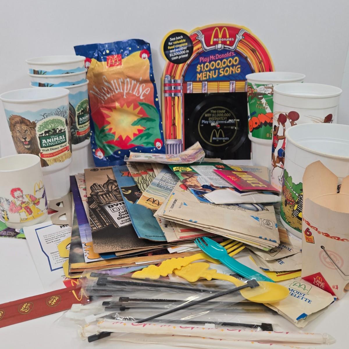 LOT 37: Vintage McDonald's Items Including Happy Meal Bags, Placemats, Bib, Plastic Utensils, Cups, and Much More