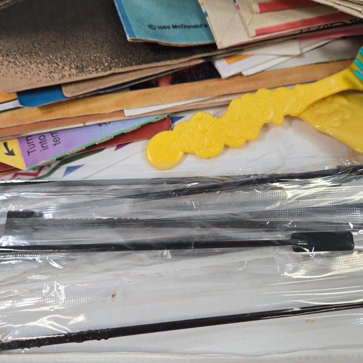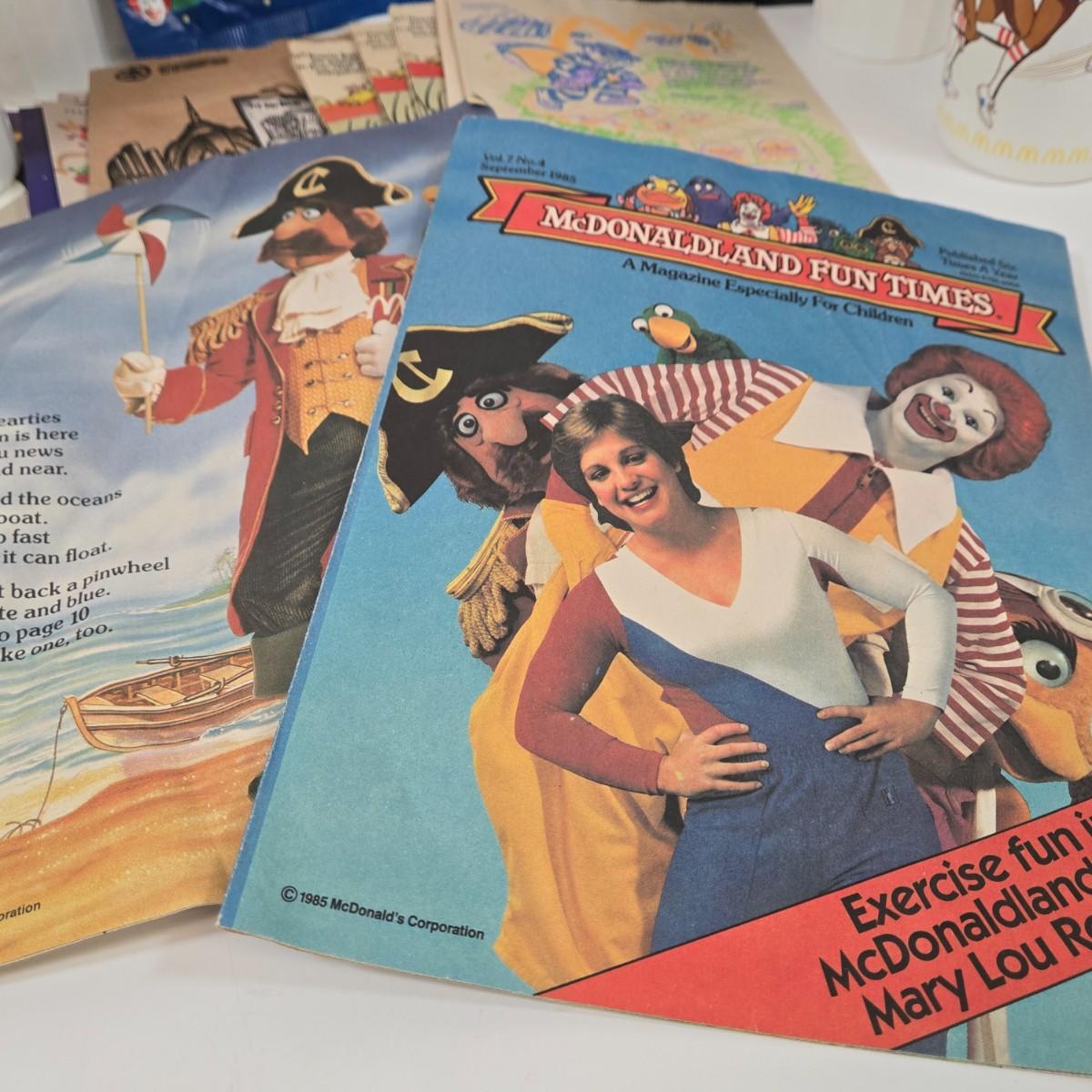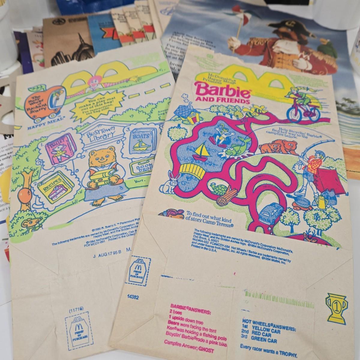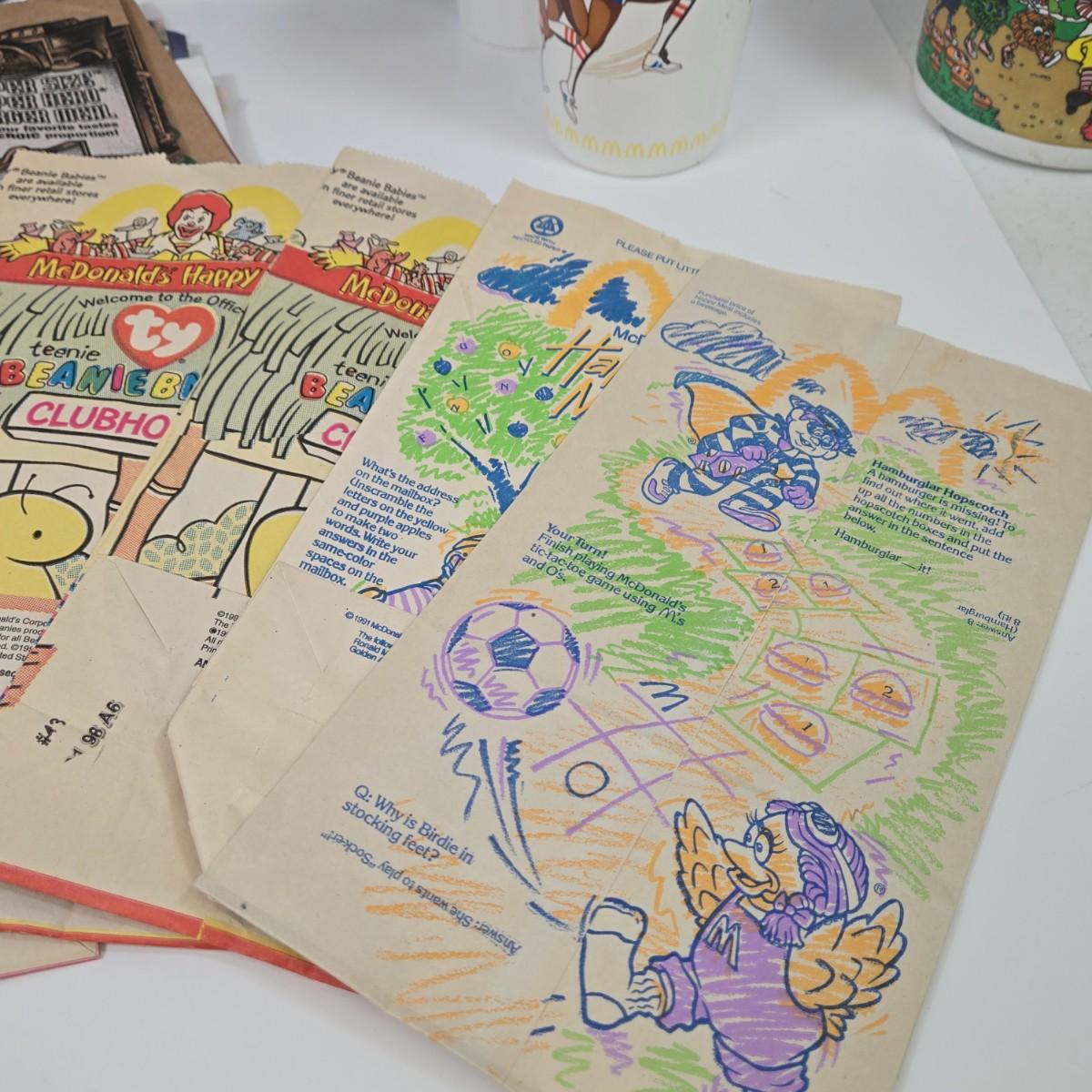 LOT 37: Vintage McDonald's Items Including Happy Meal Bags, Placemats, Bib, Plastic Utensils, Cups, and Much More