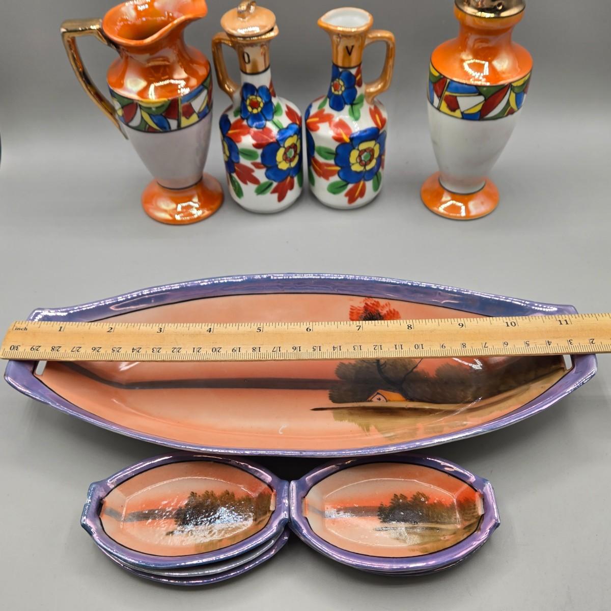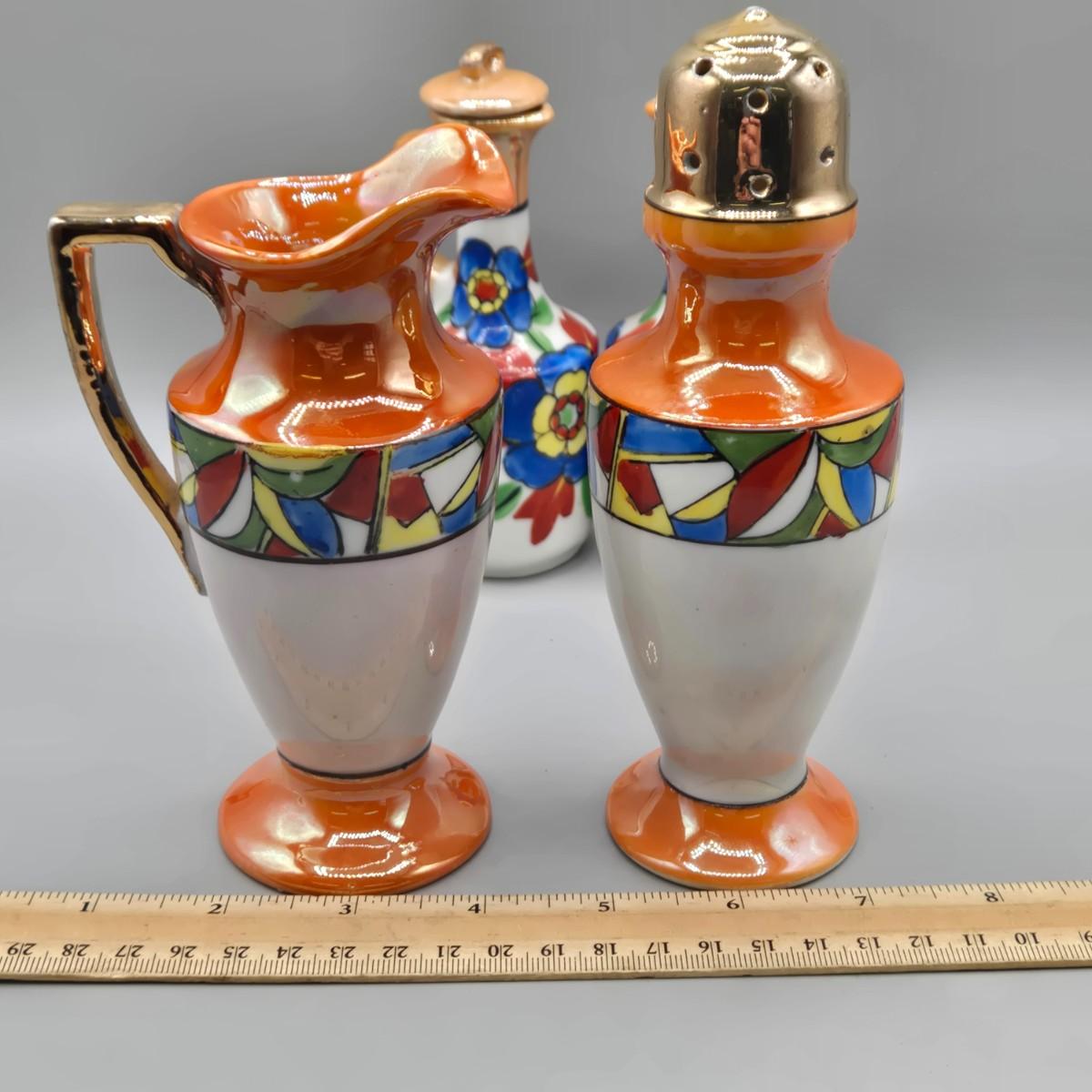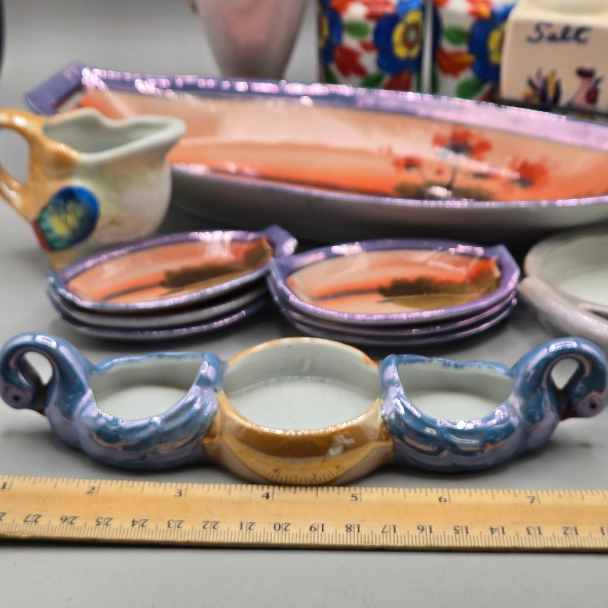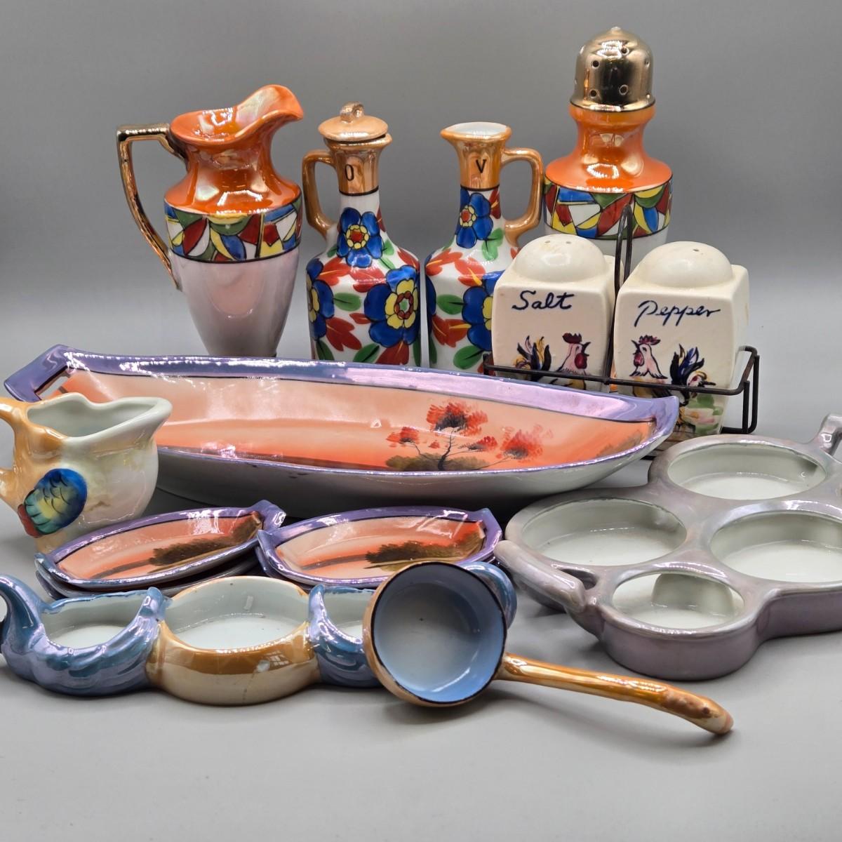 LOT 53: Vintage Japanese Lusterware Celery Dish and Salt Dips, Elite Lustreware Lustre Sugar Shaker Muffineer & Creamer, Rooster Salt & Pepper Shakers, and More