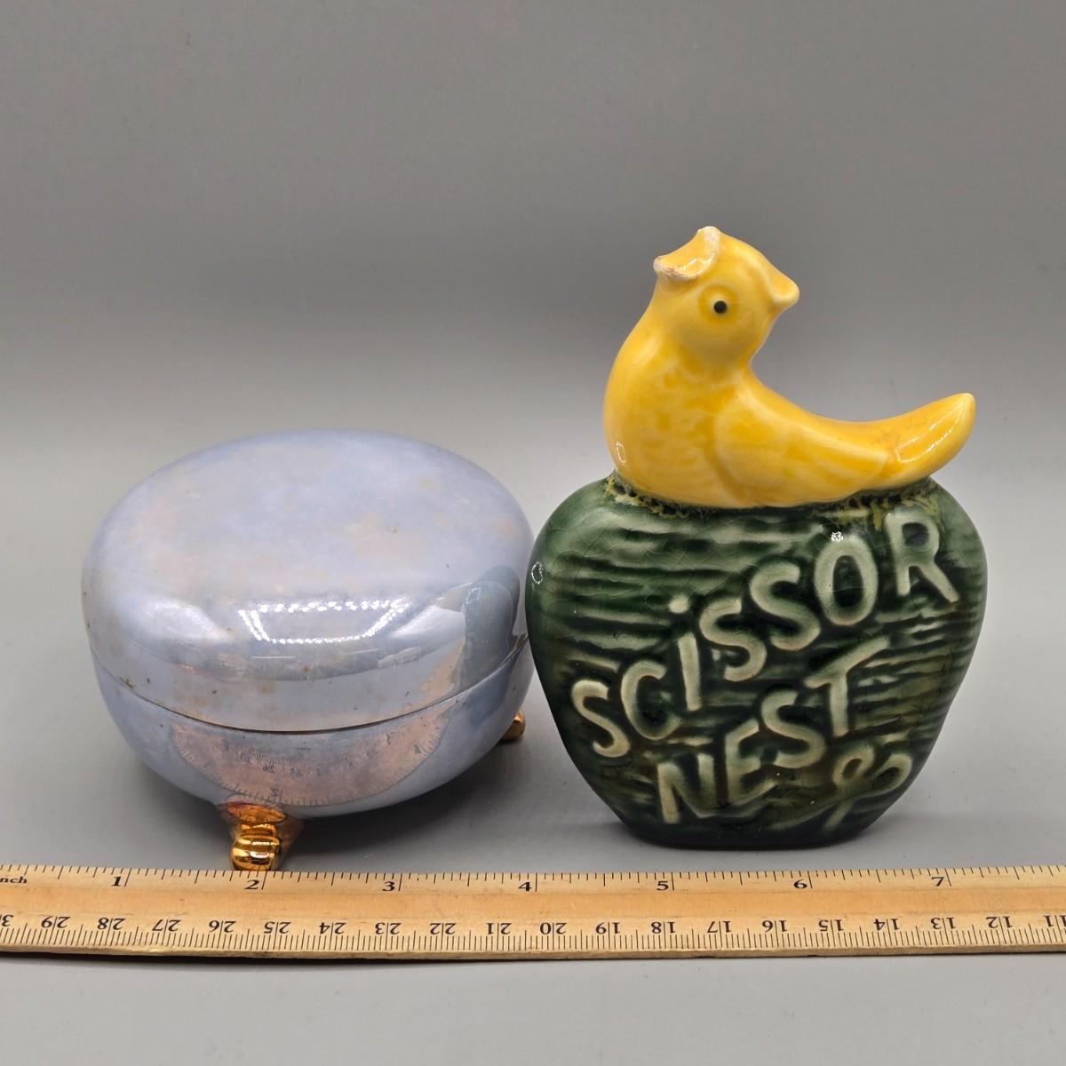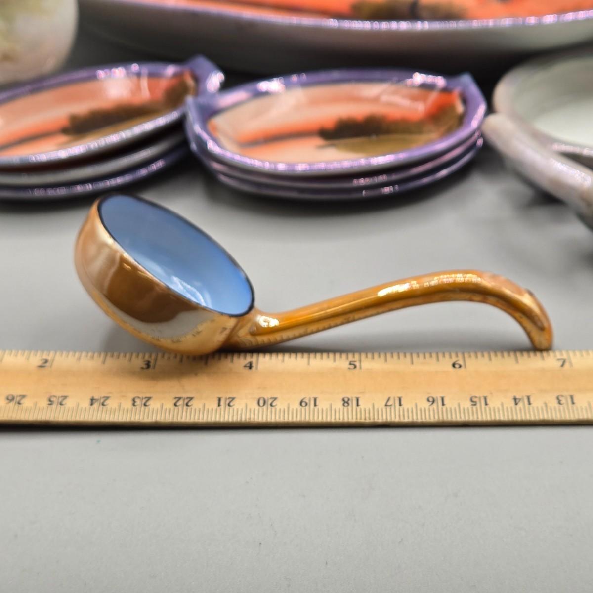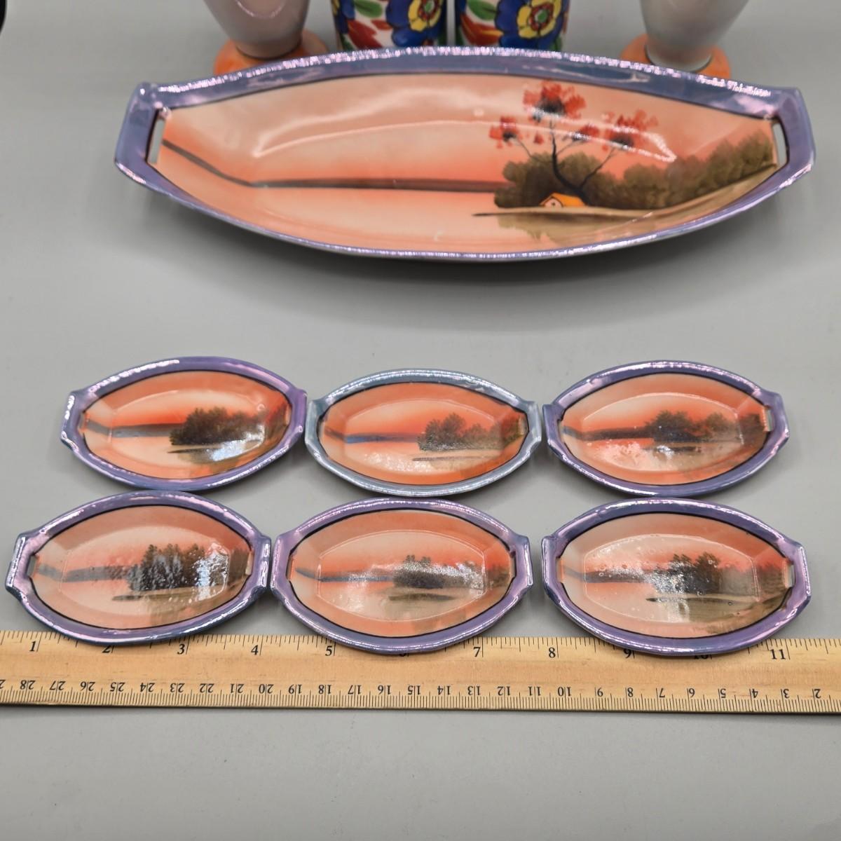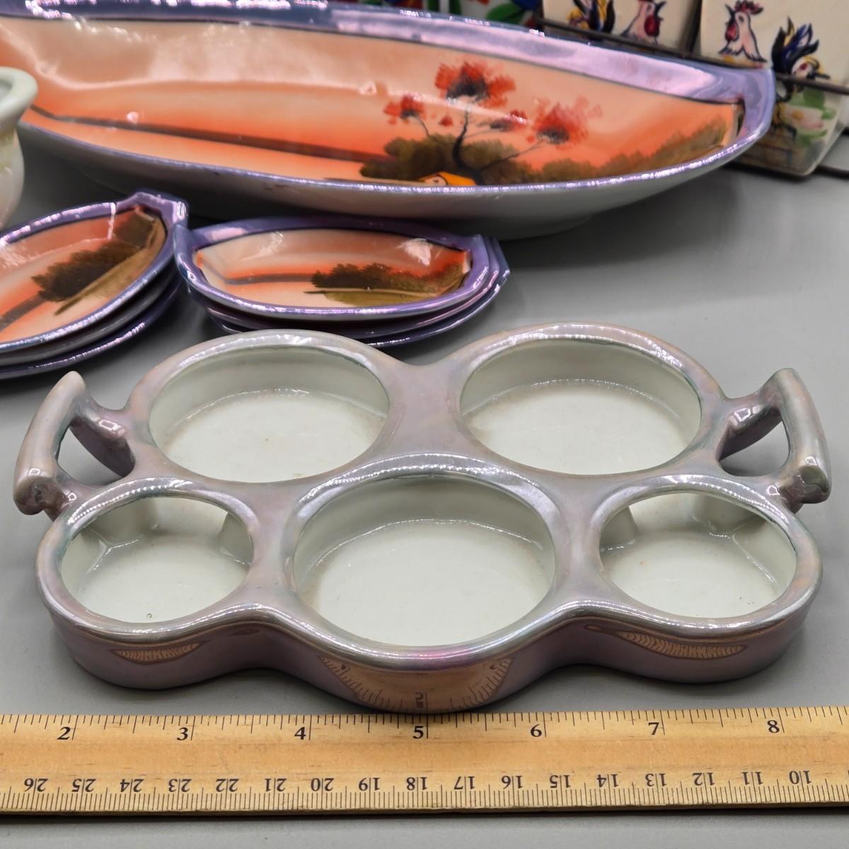 LOT 53: Vintage Japanese Lusterware Celery Dish and Salt Dips, Elite Lustreware Lustre Sugar Shaker Muffineer & Creamer, Rooster Salt & Pepper Shakers, and More