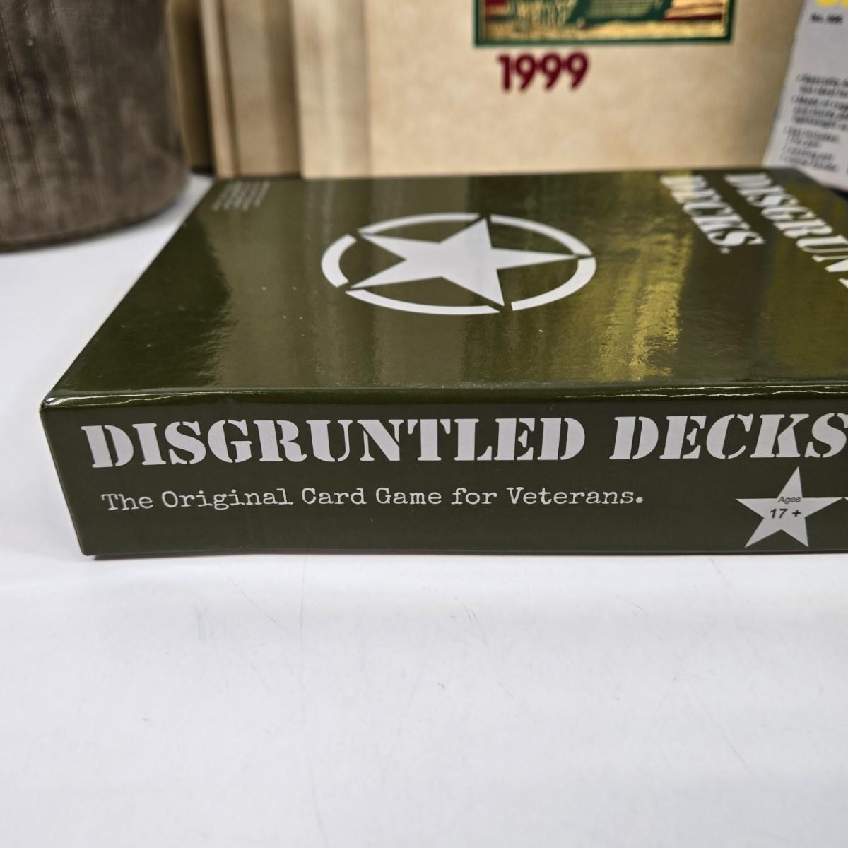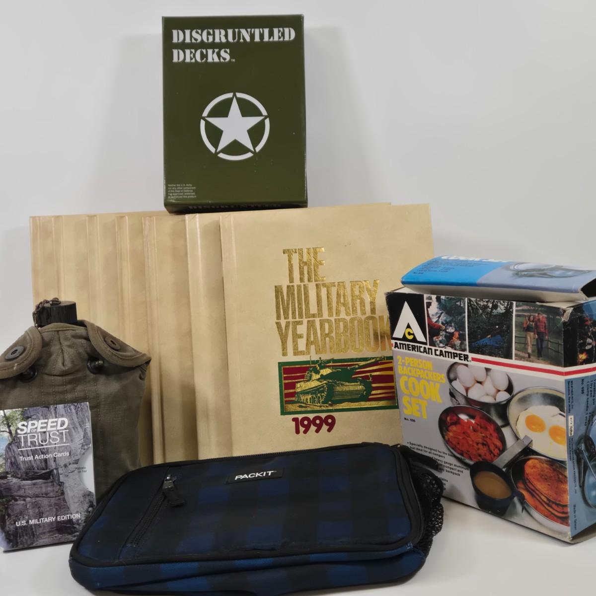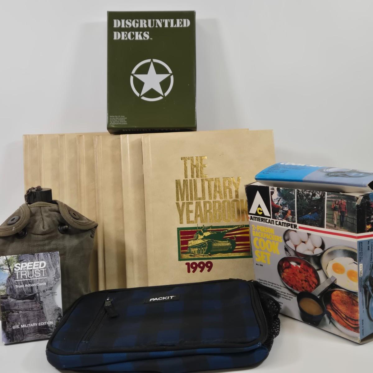 LOT 73: Collection of Military Yearbooks, Disgruntled Decks The Original Military Party Card Game for Veterans, WW ll 1943 US ARMY Canteen with Cover, and More