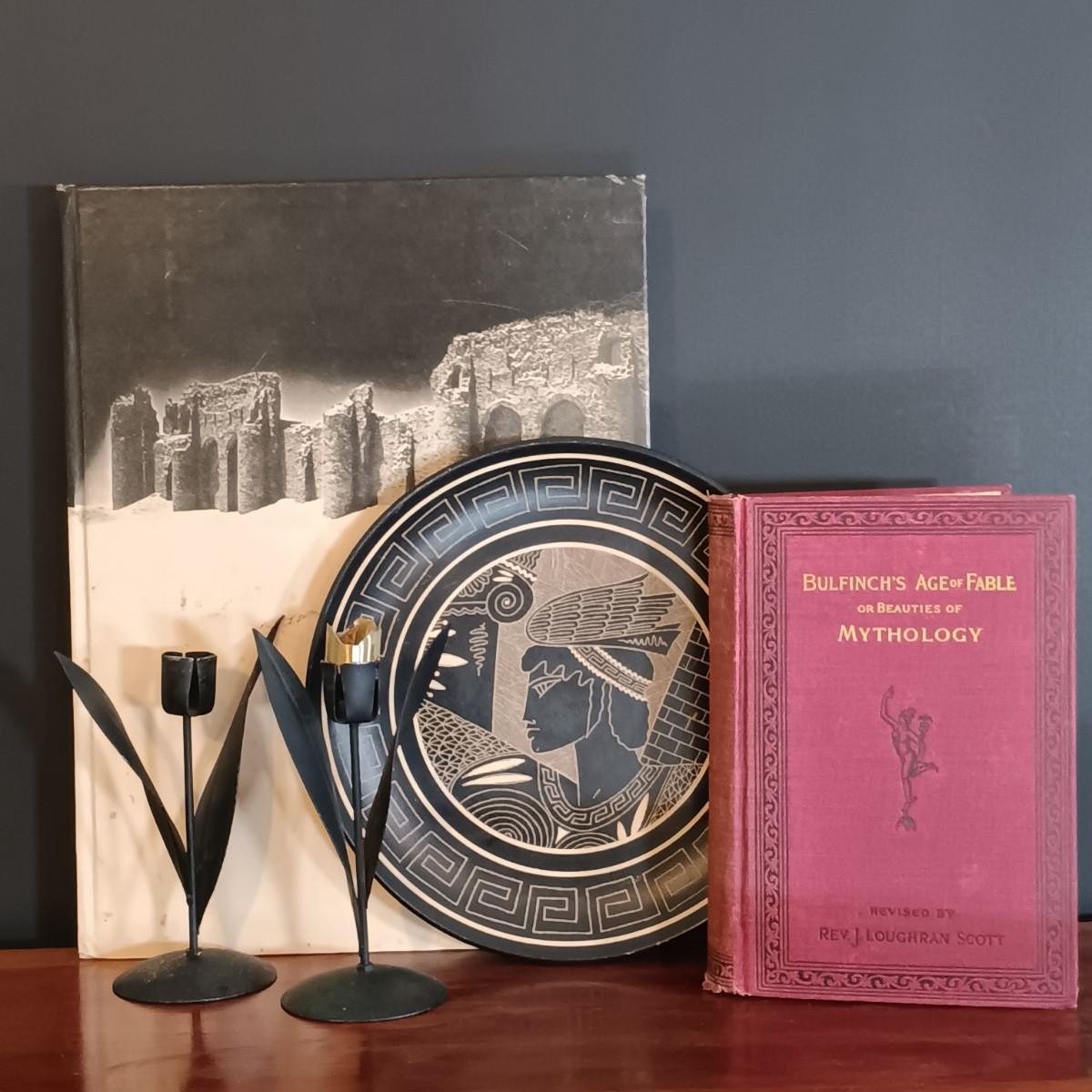 LOT 6: Bulfinch's Age of Fable 1898, Handmade Terracotta Wall Art, Rose Macaulay's Pleasure of Ruins 1966 & Metal Tulip Candle Holders