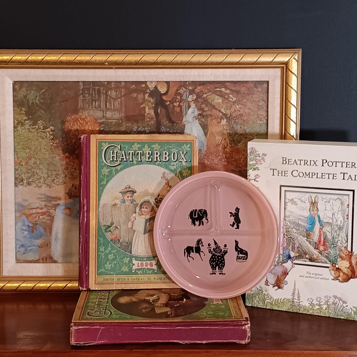 LOT 9: Hazel Atlas Glass Circus Plate, Chatterbox 1895 and 1896, Beatrix Potter Complete Tales & Ross Galleries Monet Lithograph