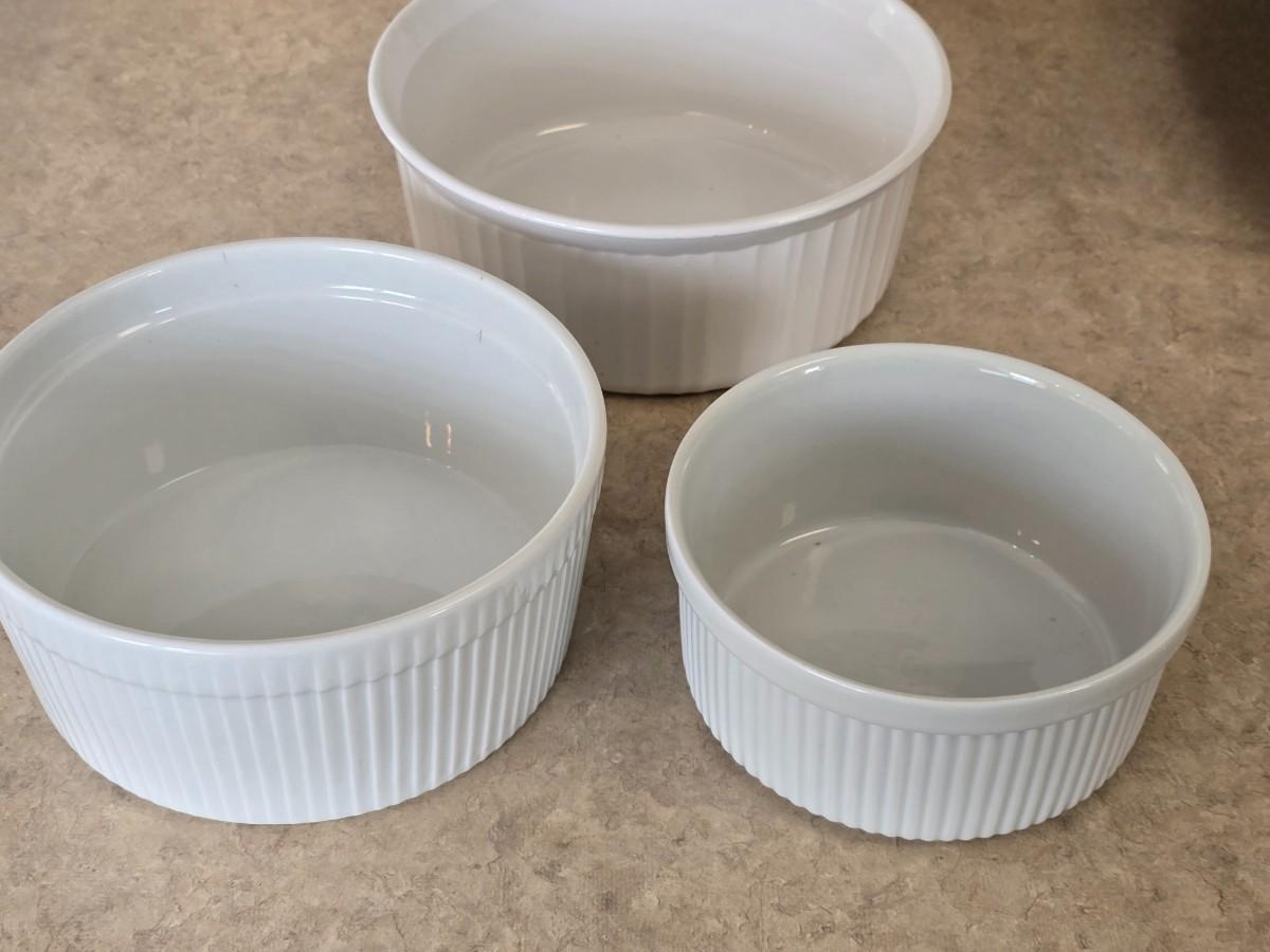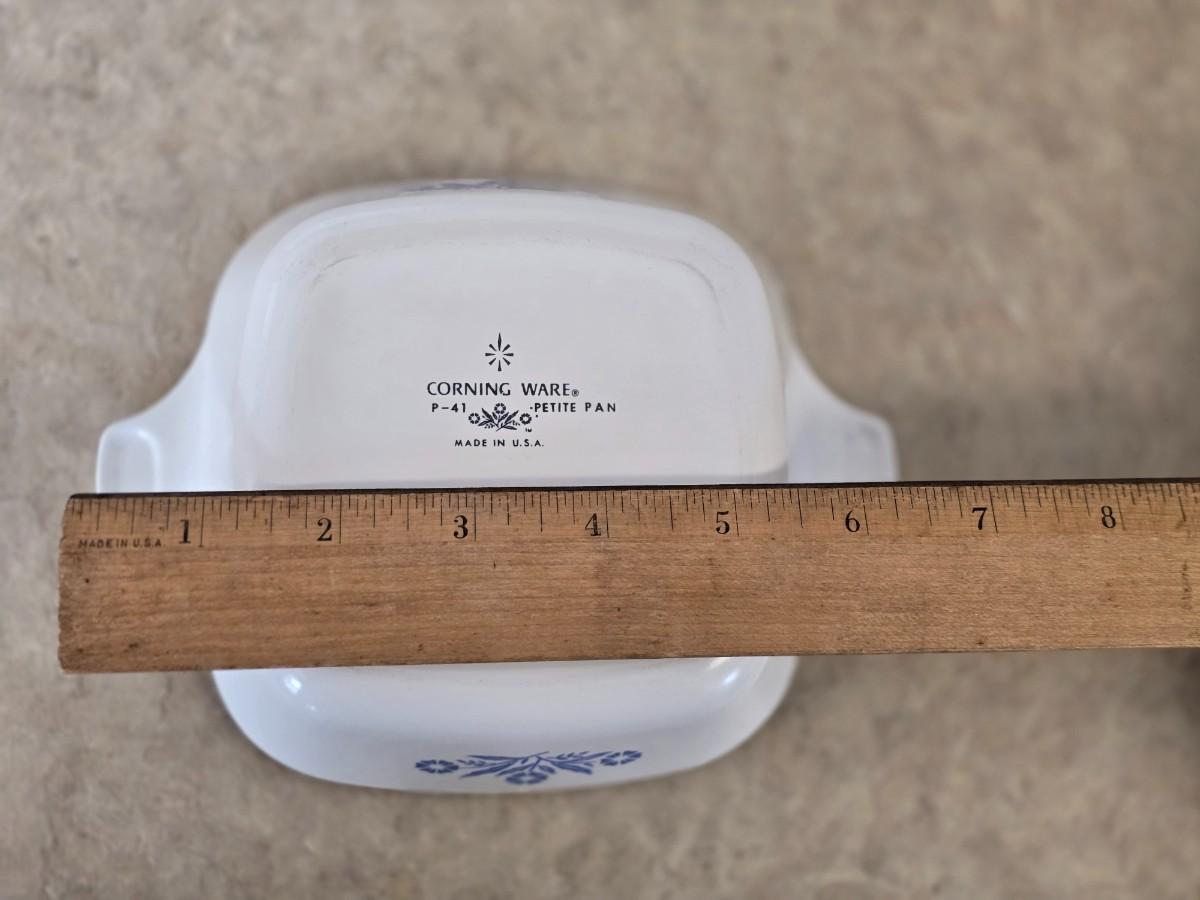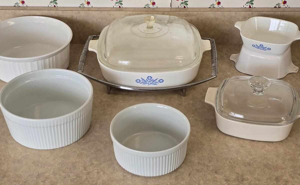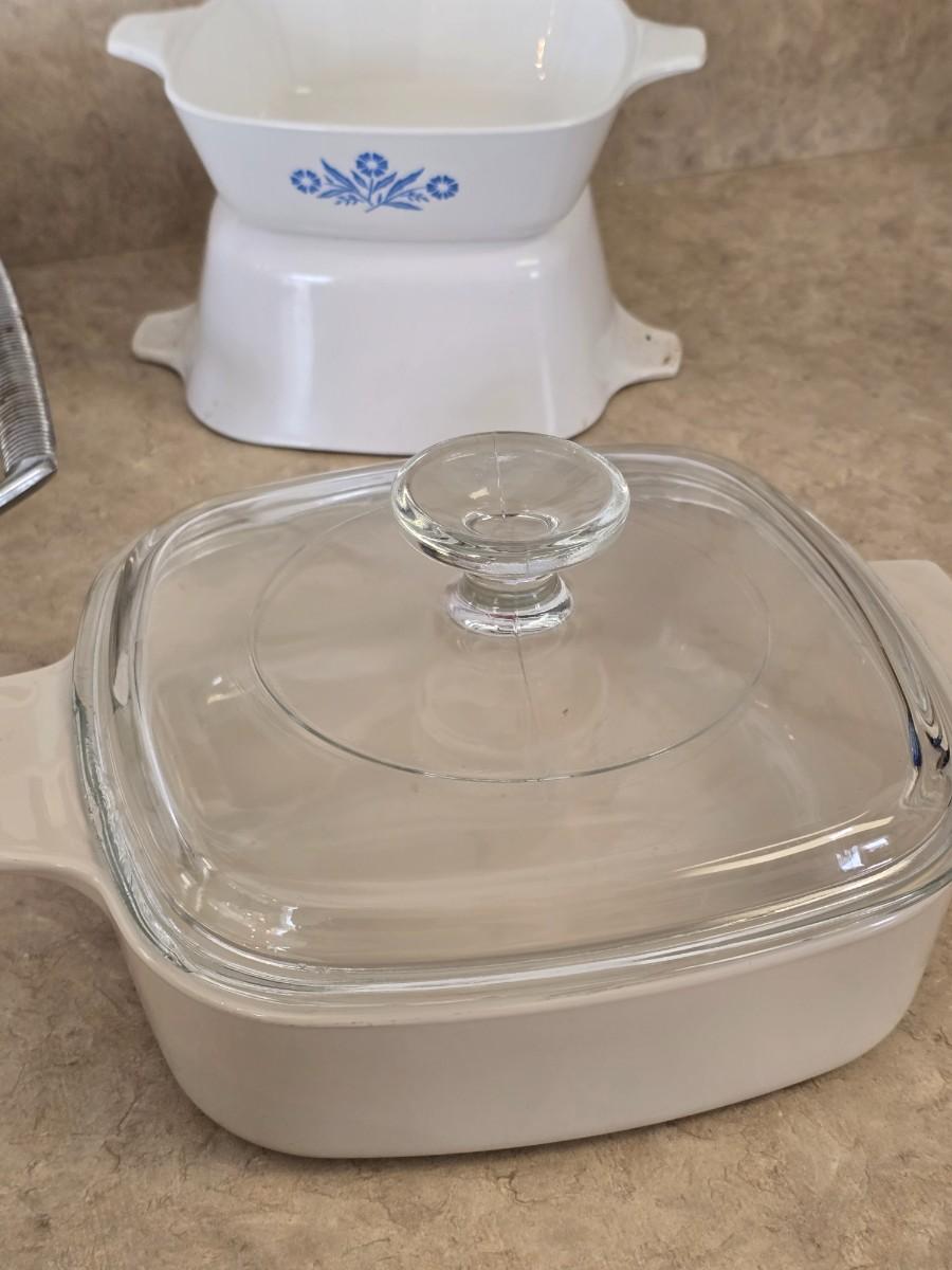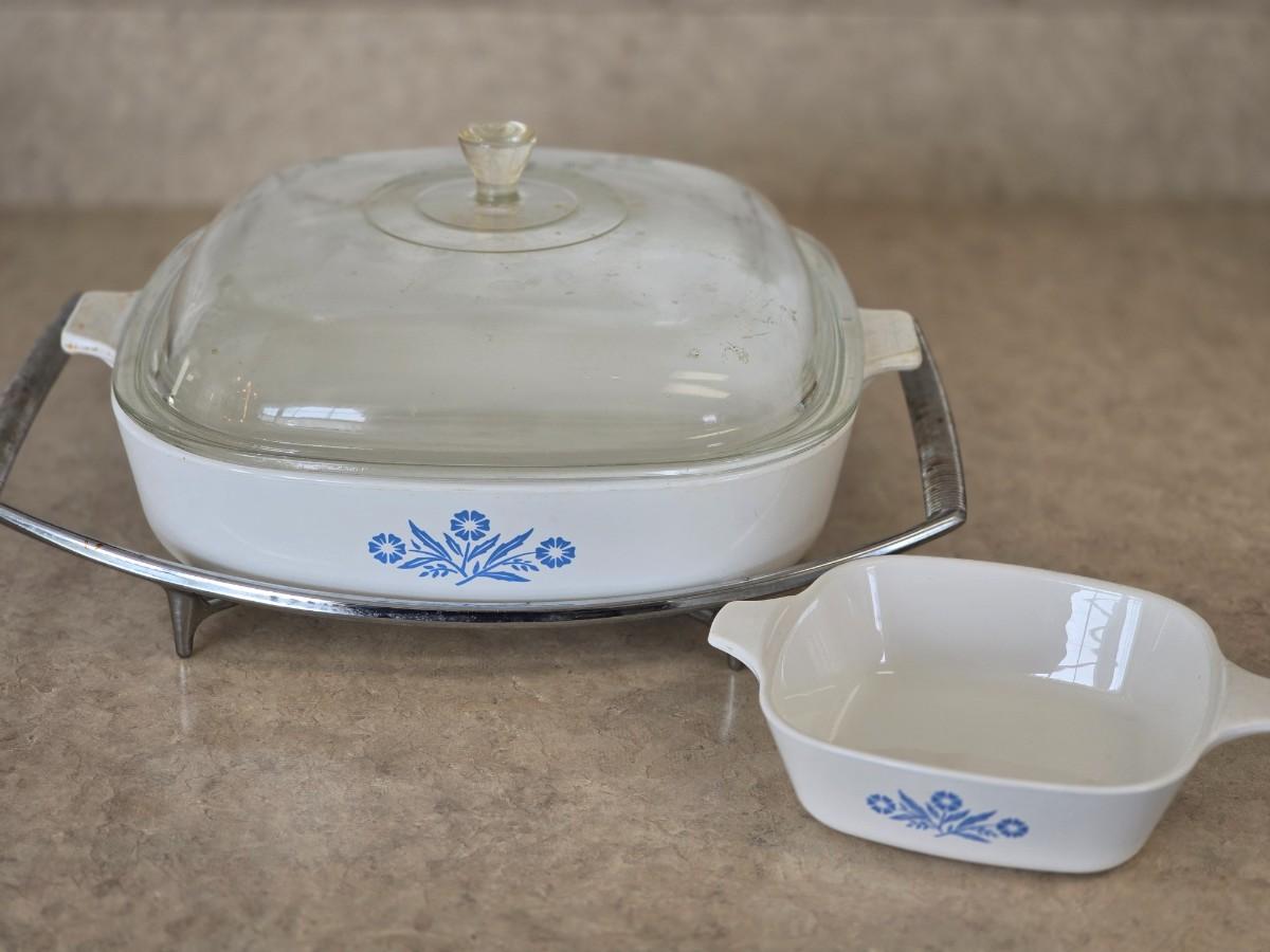 LOT 32: Corning Ware; Blue Cornflower Vintage Casserole Dish w/ Lid & Small Casserole, 2.5Q Round Bakeware ; Dansk Bakeware Dish & more