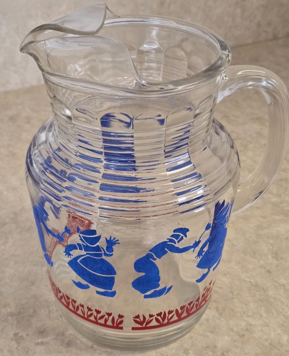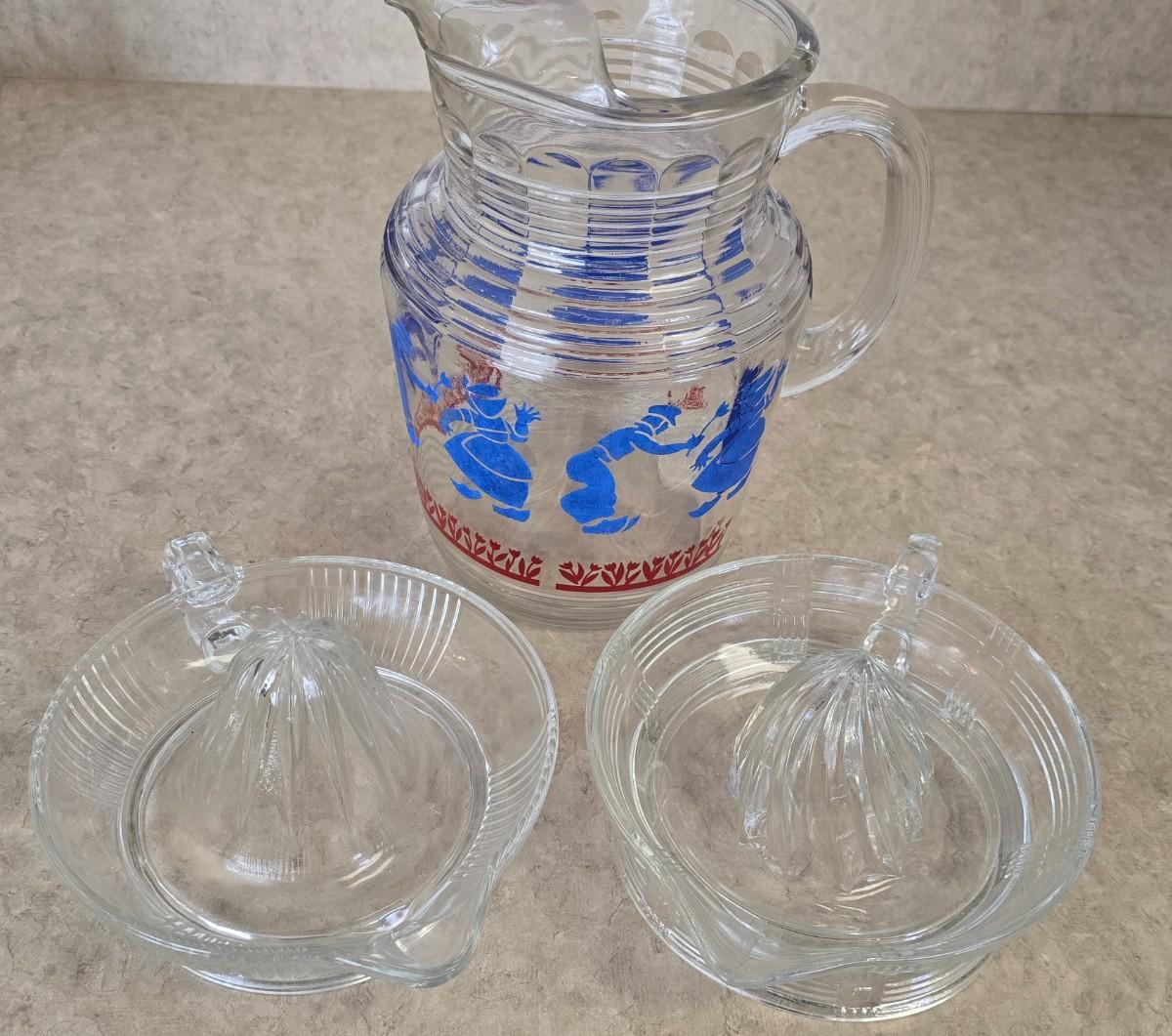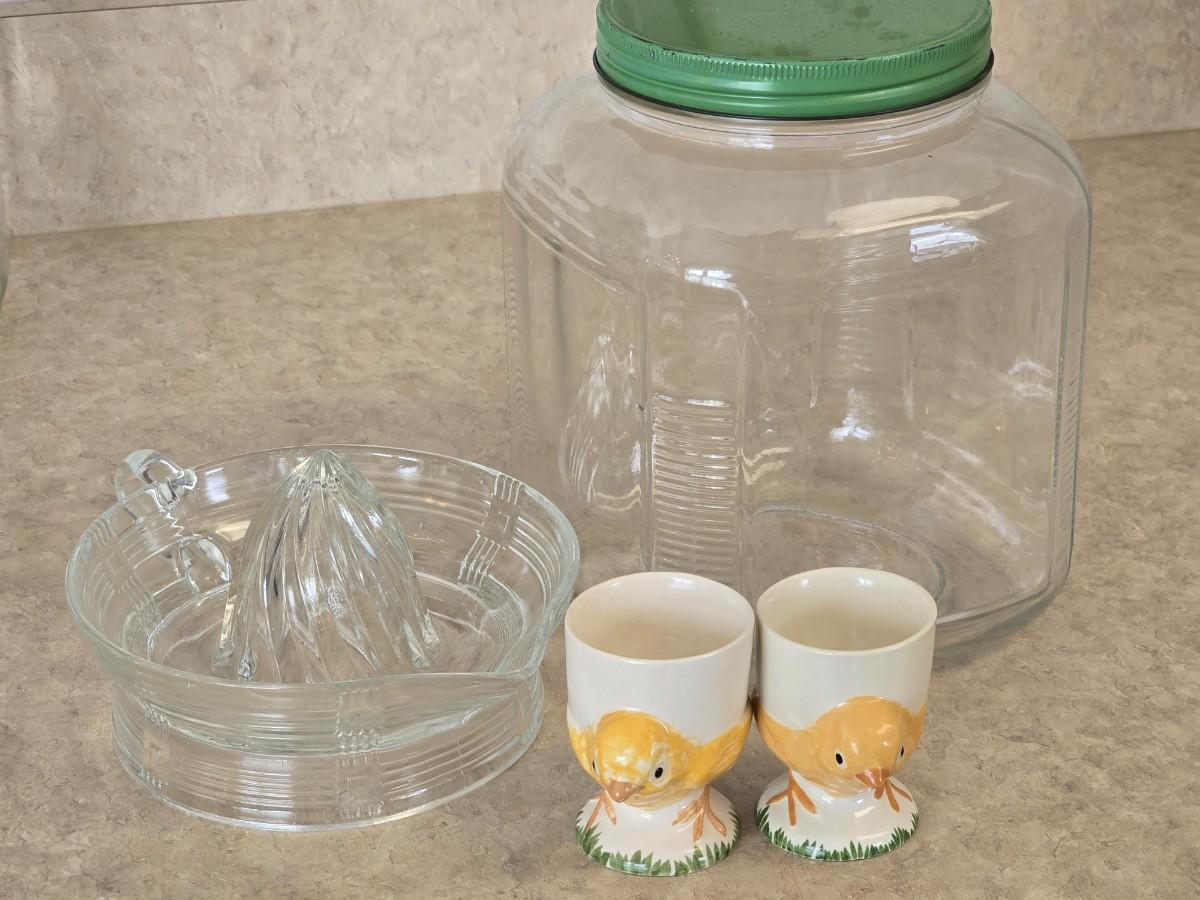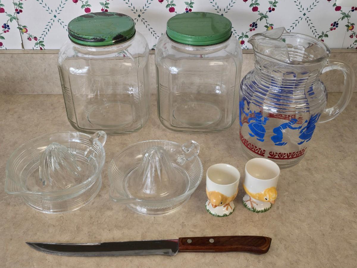 LOT 35: Vintage Breakfast Items; Hazel Atlas; Pitcher w/Dutch Boy Red & Blue, Glass Juicers; Vintage Ceramic Chick Egg Cups, Flint Stainless Carving Knife, Glass Storage Jars