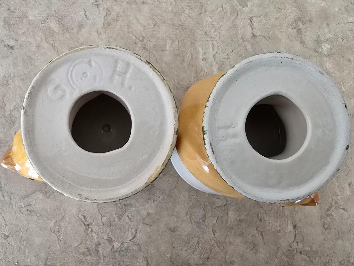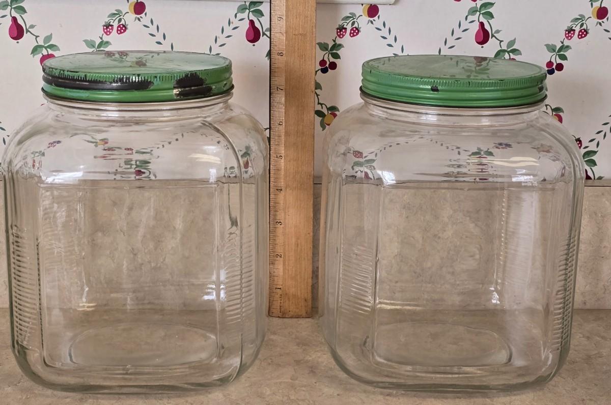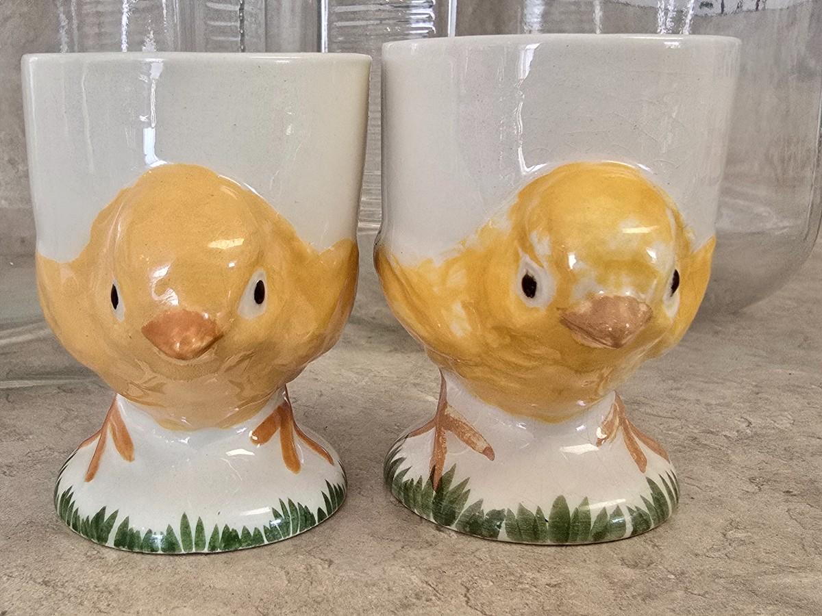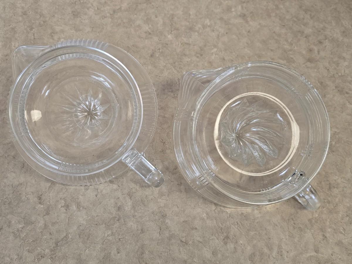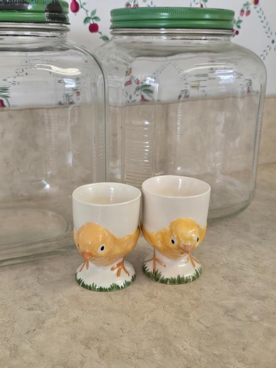 LOT 35: Vintage Breakfast Items; Hazel Atlas; Pitcher w/Dutch Boy Red & Blue, Glass Juicers; Vintage Ceramic Chick Egg Cups, Flint Stainless Carving Knife, Glass Storage Jars
